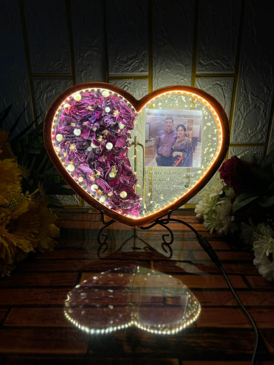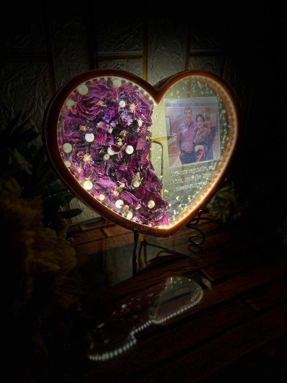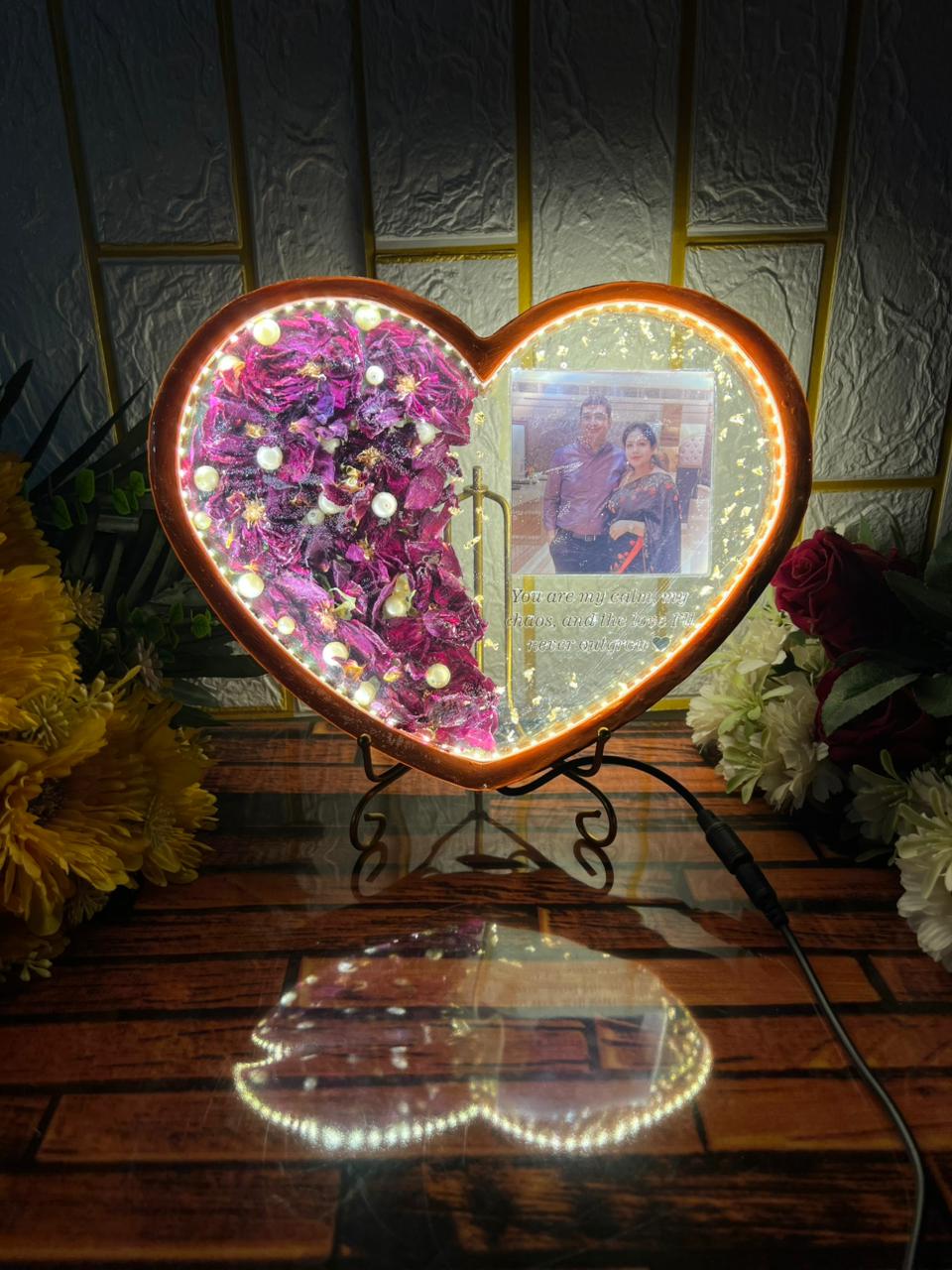 The premium crystal resin keeps the flowers safe, firm, and fresh-looking for many years. The LED glow makes the frame stand out even in a dark room, turning it into a sweet reminder of love. This heart frame is perfect for couples who want to keep their wedding feeling alive in a stylish and modern way.