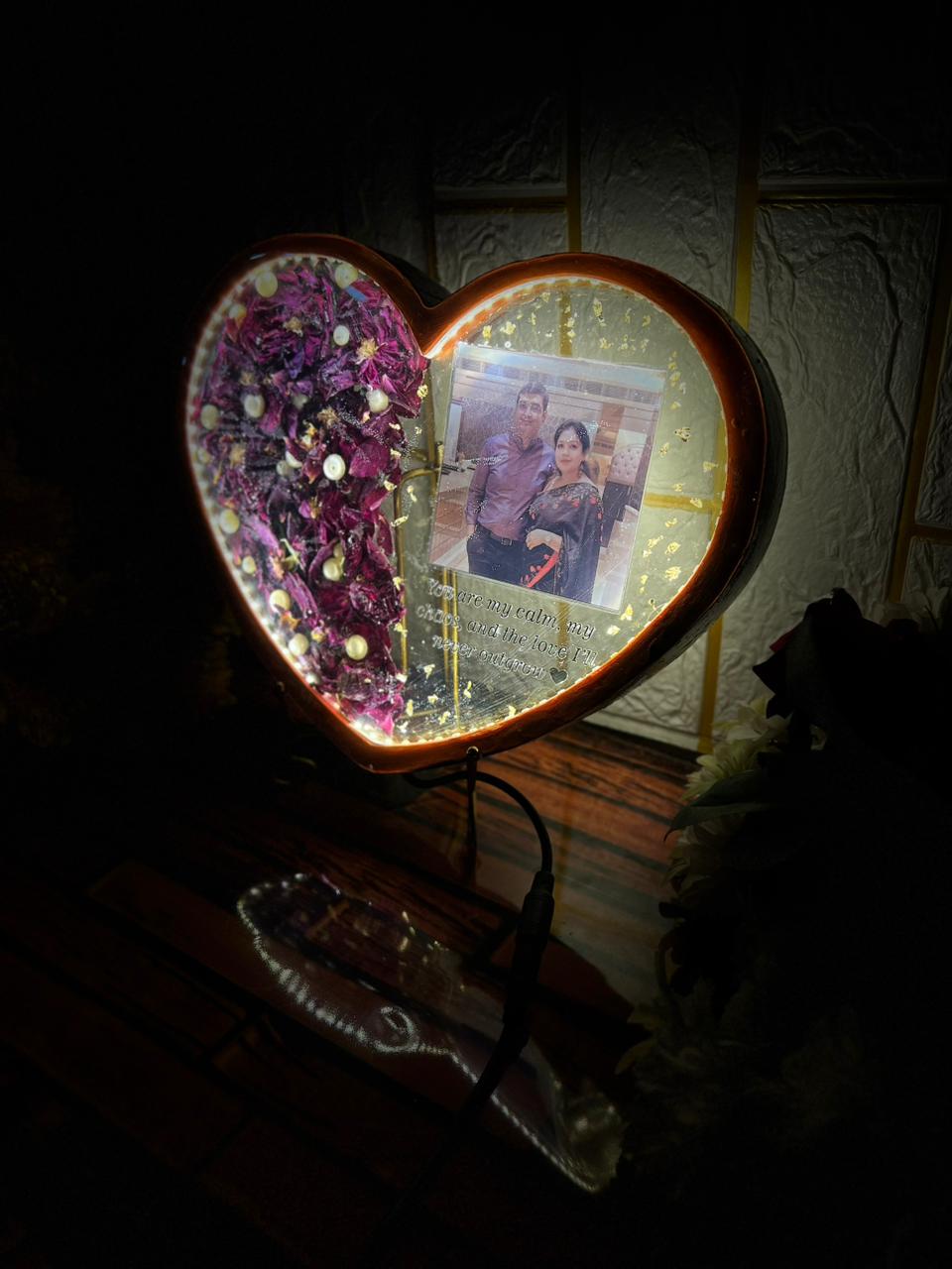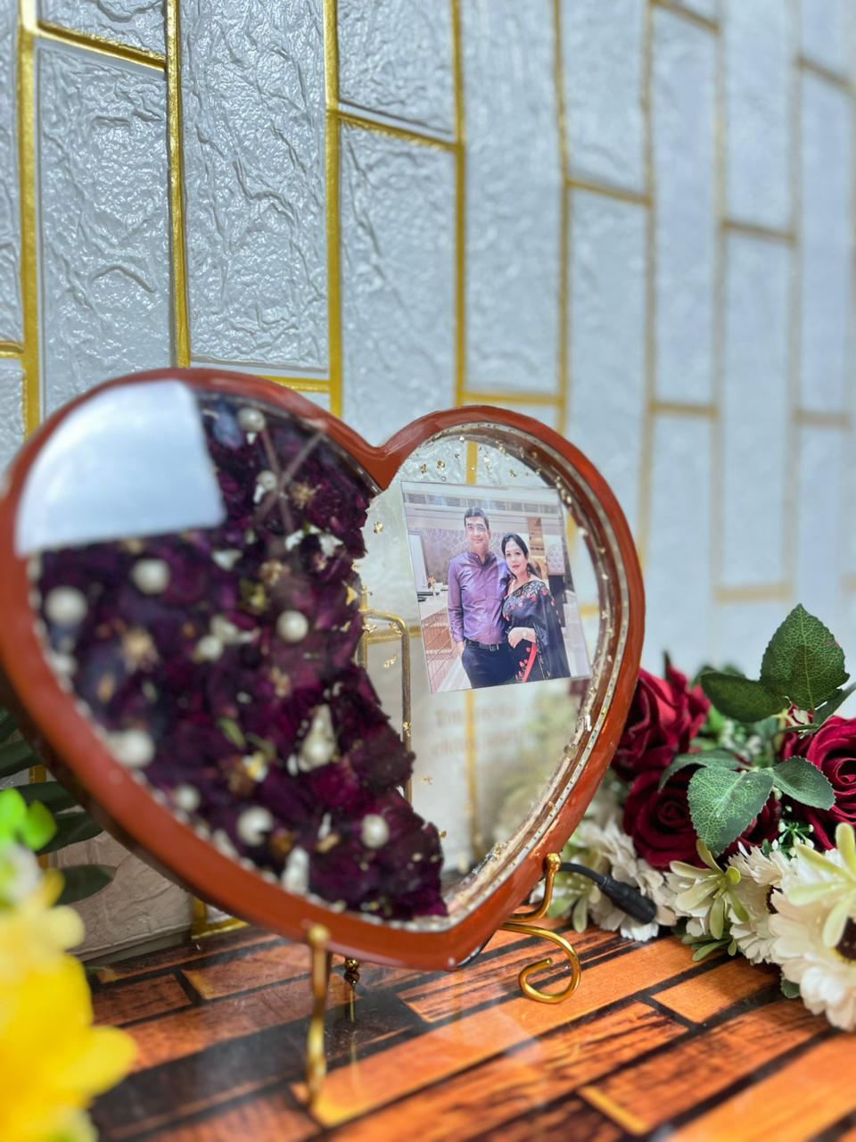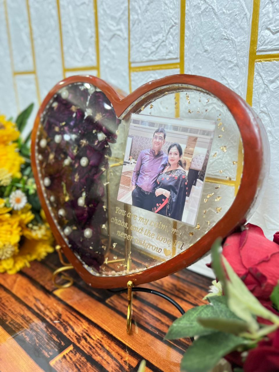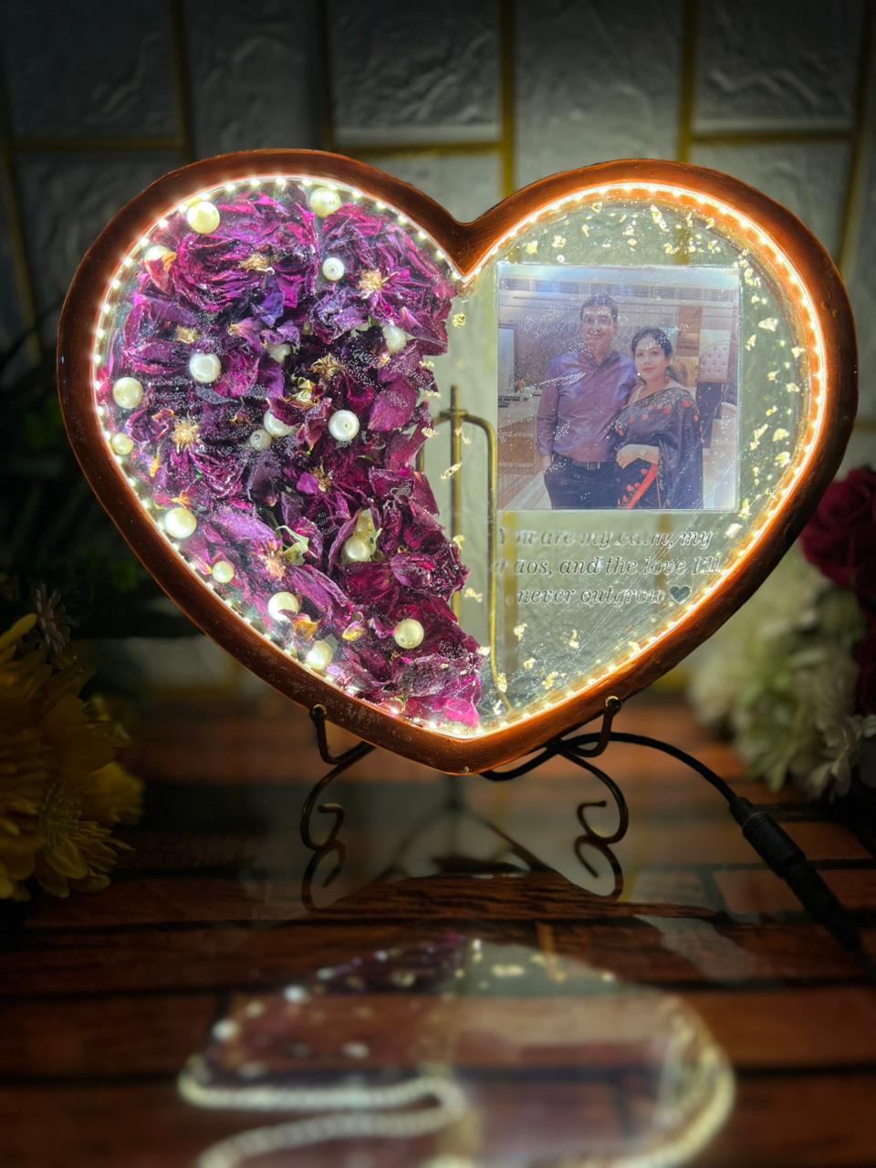 The premium crystal resin keeps the flowers safe, firm, and fresh-looking for many years. The LED glow makes the frame stand out even in a dark room, turning it into a sweet reminder of love. This heart frame is perfect for couples who want to keep their wedding feeling alive in a stylish and modern way.