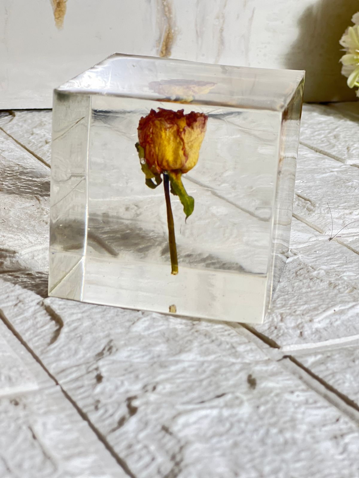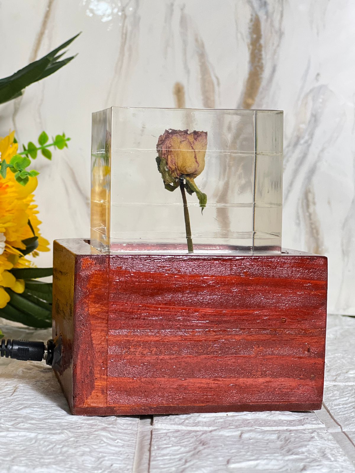 Product Description: This 3-inch crystal clear block is a delicate and elegant way to preserve a single rose, beautifully preserved in high-quality resin. The block allows the rose to be seen from all angles, capturing its natural beauty. It comes with a stylish LED wooden stand that lights up the block, creating a soft glow and highlighting the preserved rose. A timeless and meaningful piece, perfect for remembering special moments. Features: