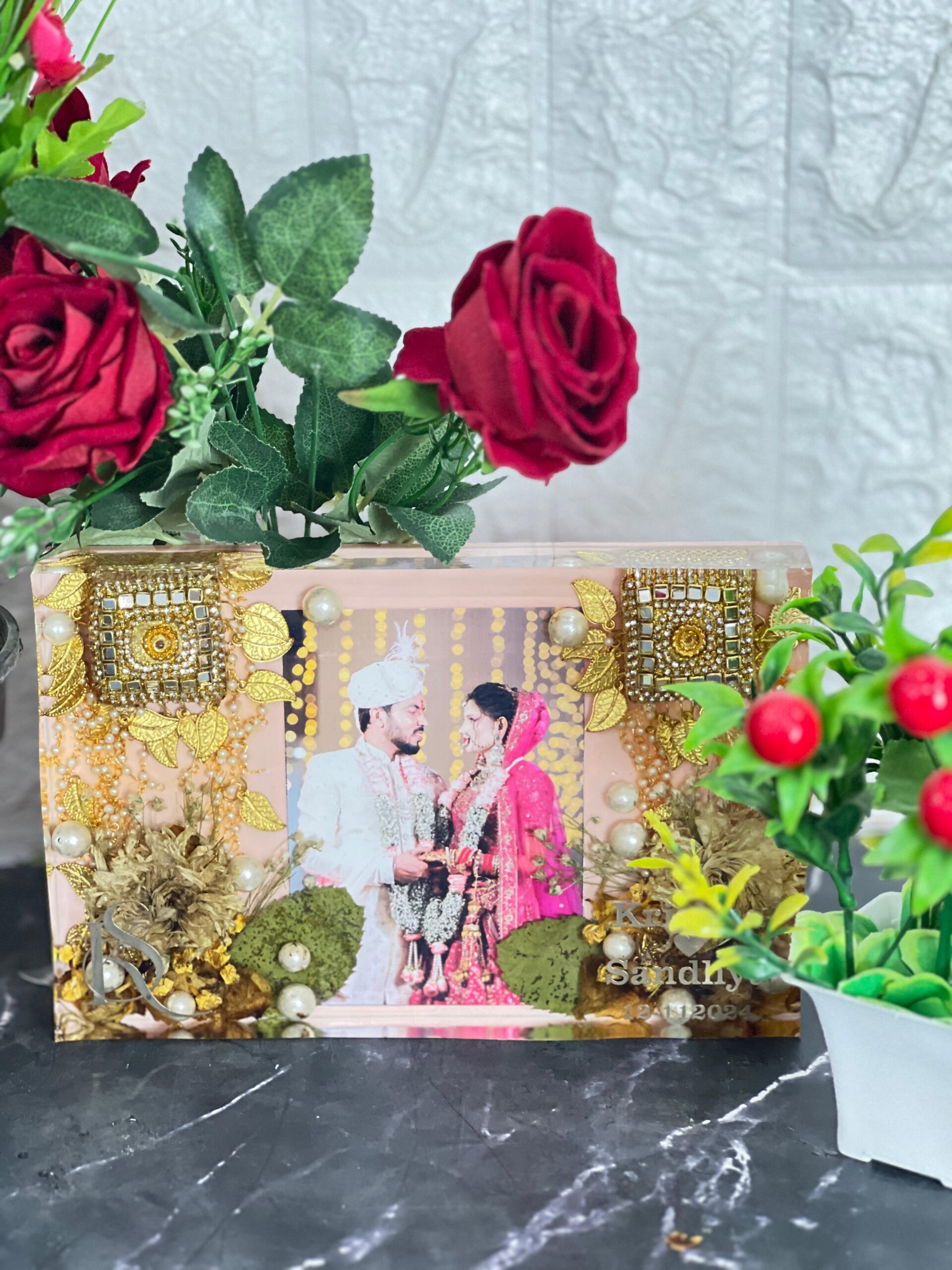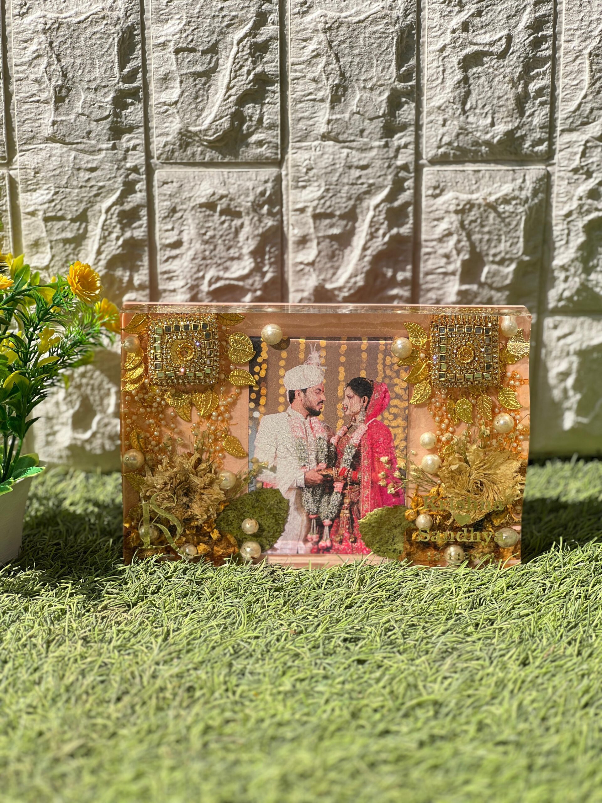 This ( - ) inch resin photo frame is a beautiful way to save one of your most special wedding moments. Your wedding photo is placed at the centre and surrounded with real varmala flower petals, shining golden kaleeras, and pearls. Everything is sealed inside clear, glossy resin which keeps the memory fresh forever.