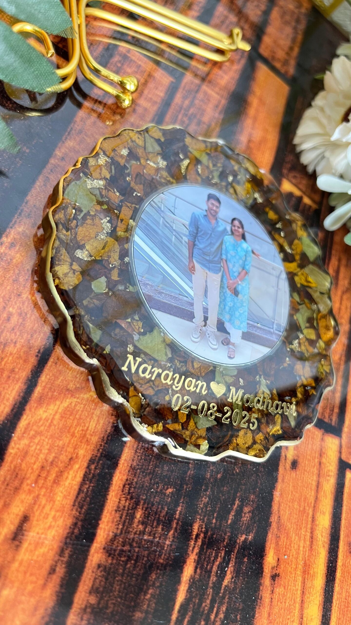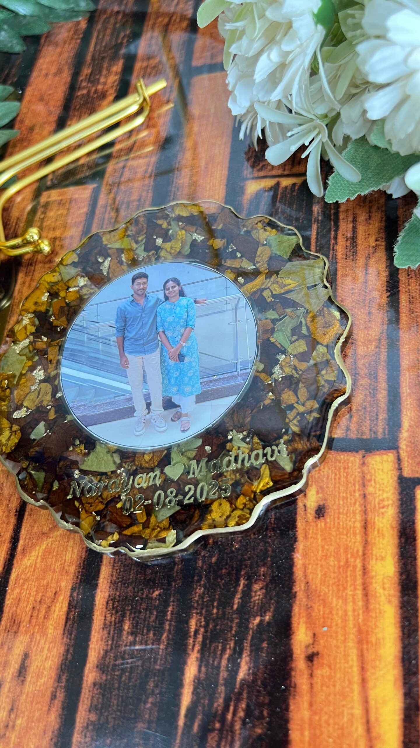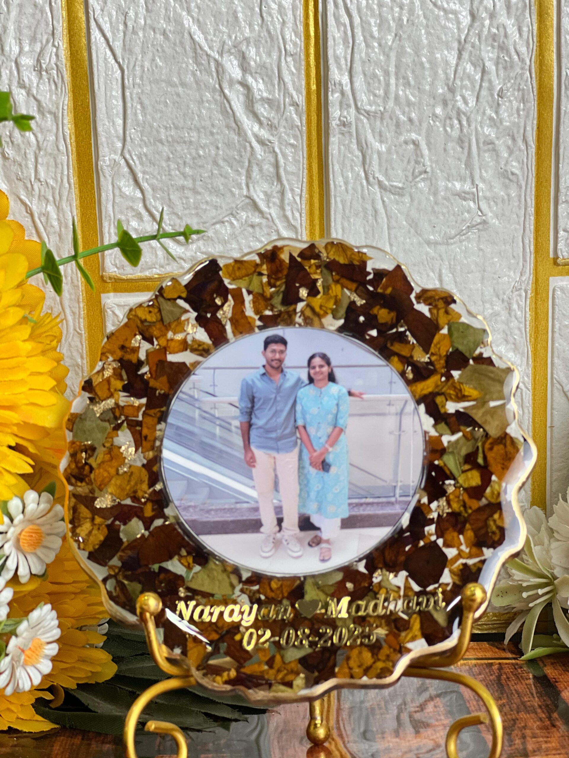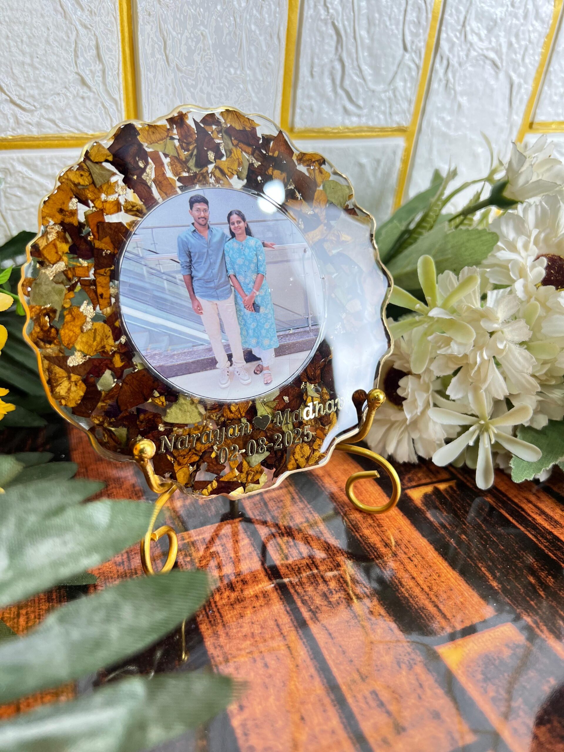 Every couple has one picture that speaks a thousand emotions. This resin couple photo frame was made to keep such a memory safe forever. 💕 Here, we have preserved a beautiful couple photo surrounded by real dried petals and golden flakes. The resin gives it a glossy, crystal-clear finish, making the flowers look fresh and vibrant for years to come. Their names and special date are engraved at the bottom, turning this frame into a one-of-a-kind memory piece. The size of this frame is 6 inches, which makes it perfect for keeping on side tables, showcases, or work desks. The golden metal stand adds elegance and makes the frame easy to place anywhere.