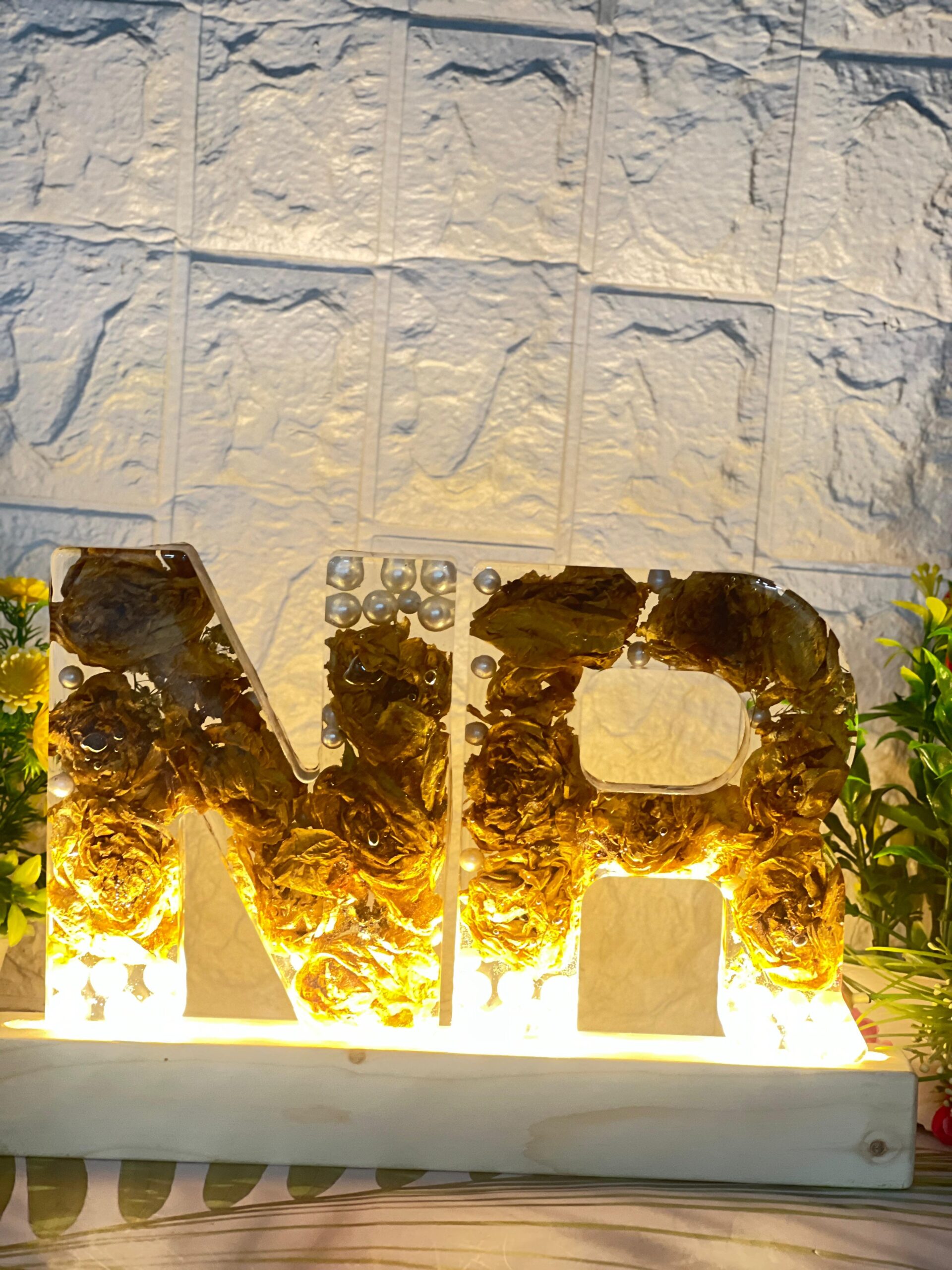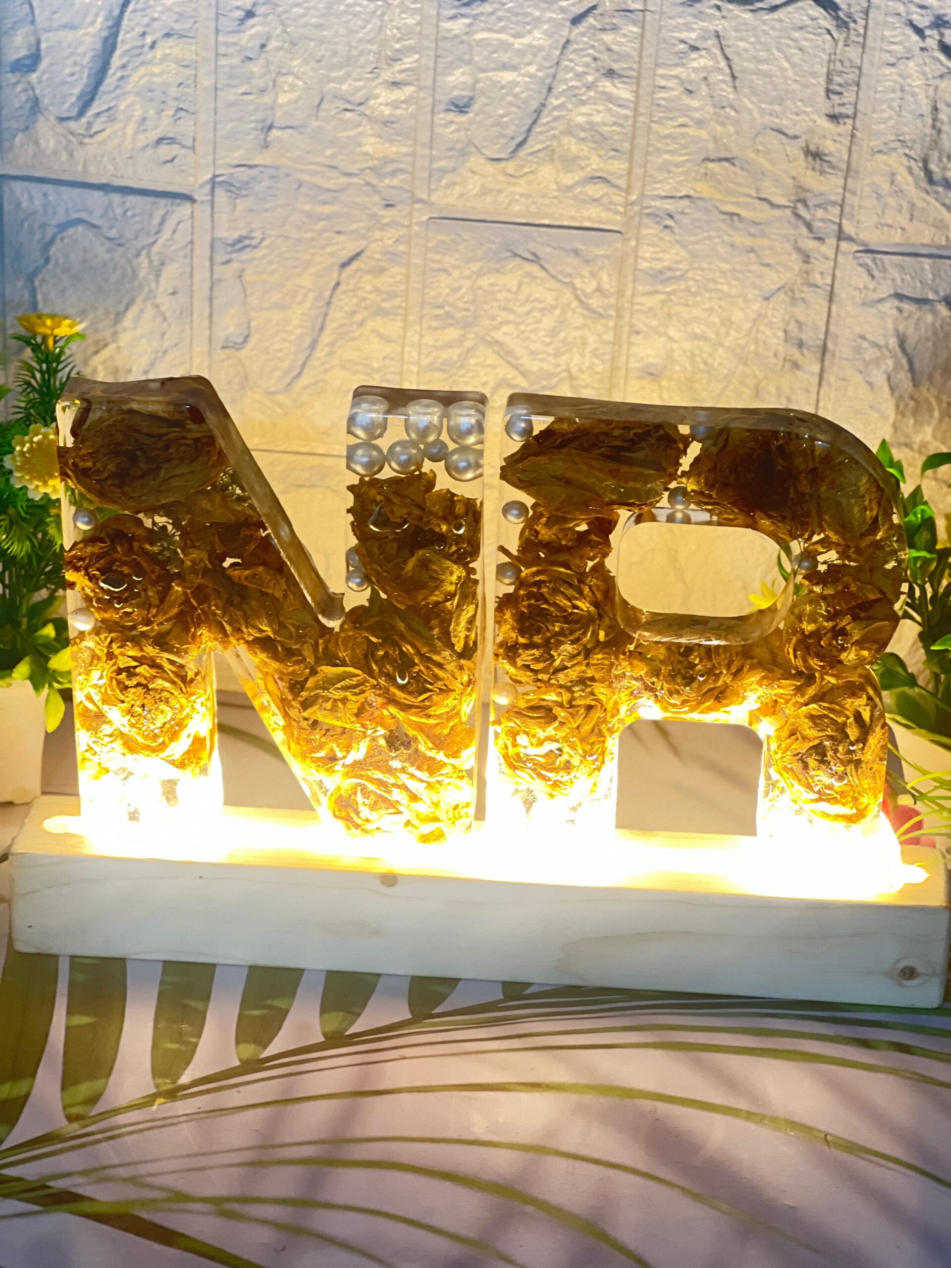 This Custom Resin LED Lamp with N & R Initials is a beautiful wedding keepsake. Made using real varmala flowers, this piece is crafted in the shape of N and R initials. Flowers are preserved in epoxy resin, giving it a long-lasting glossy finish. The resin initials sit on a wooden LED base that lights up, making it a perfect personalized gift for weddings, anniversaries, or home decor.
