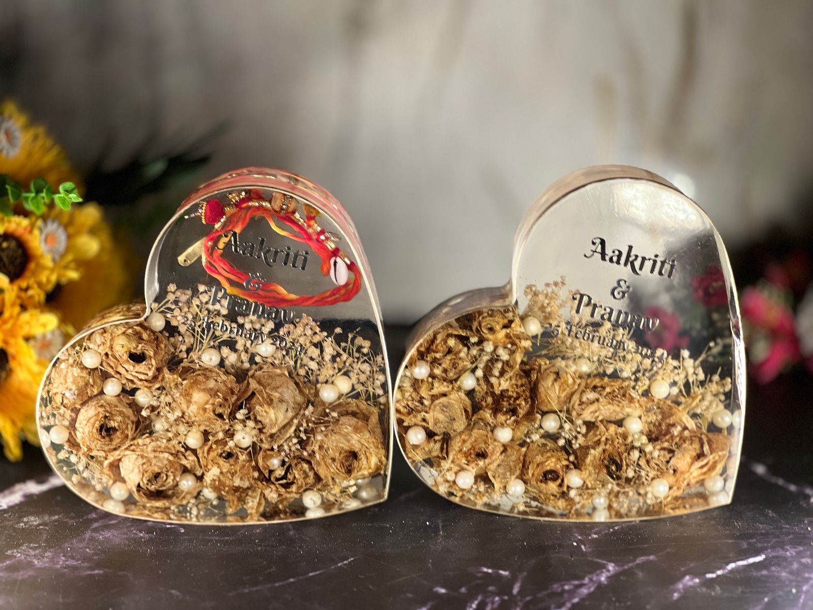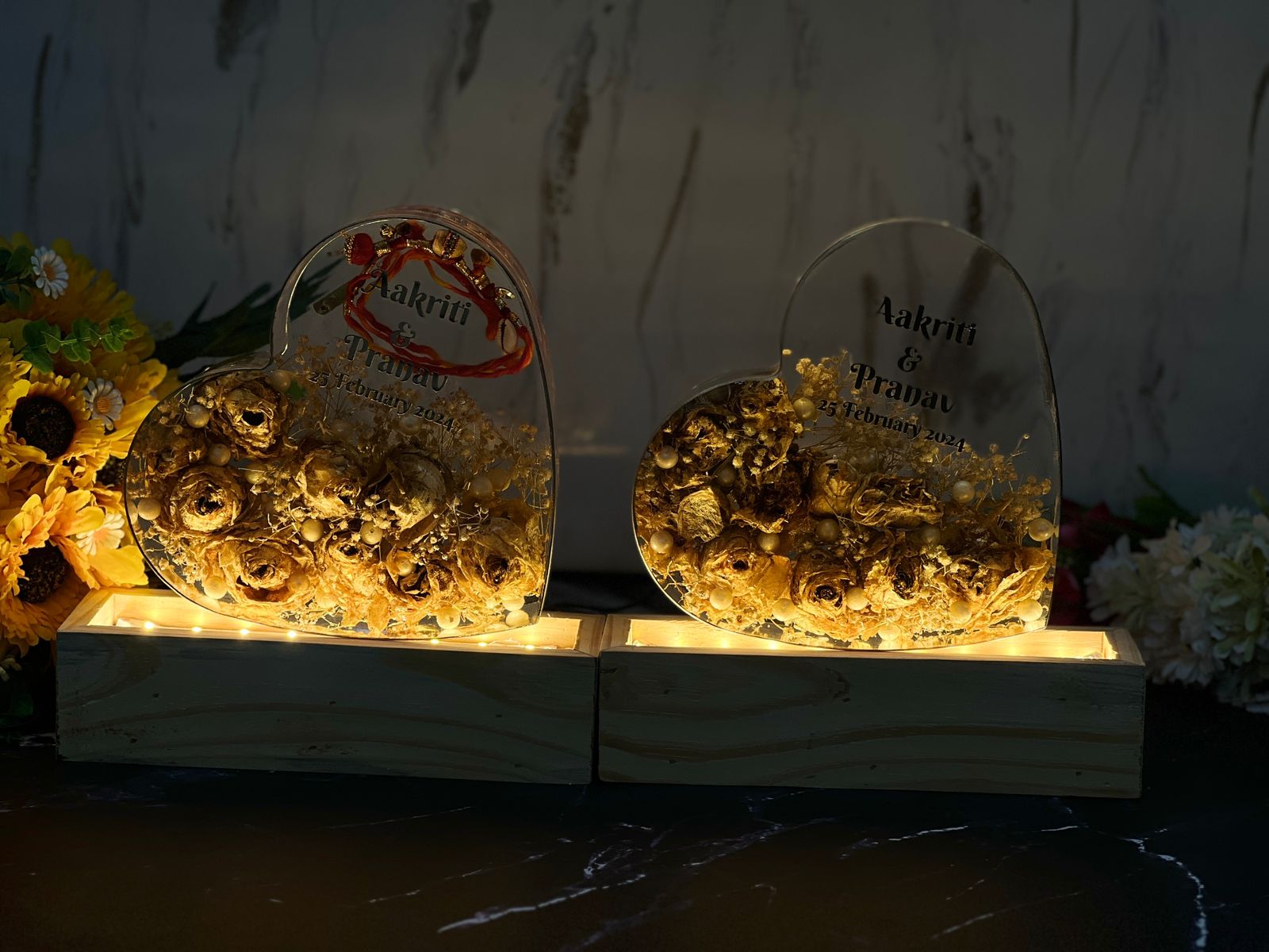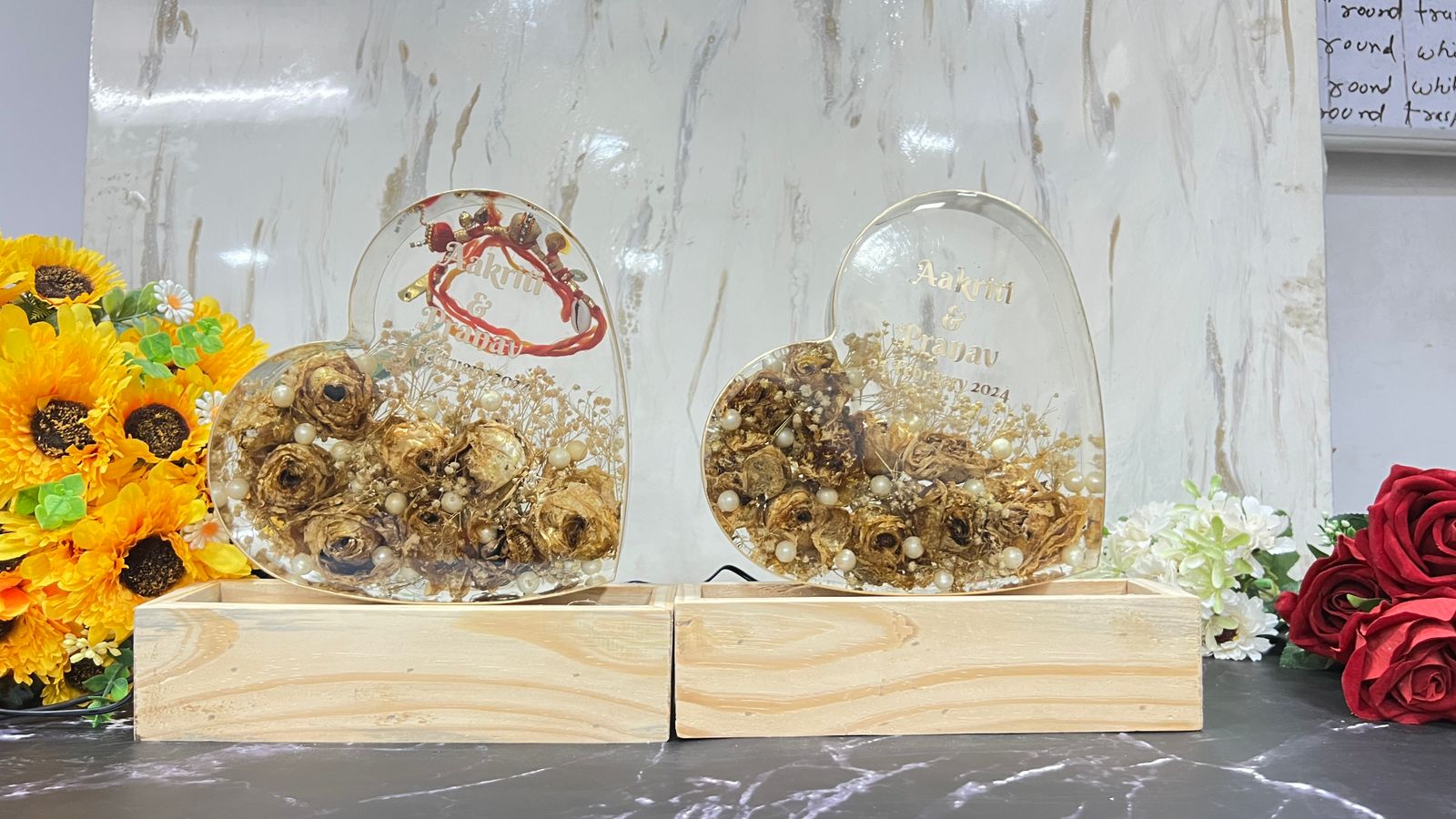 Product Description: This dual heart-shaped deep casting frame is a perfect way to preserve your wedding memories. One frame showcases beautiful wedding garland flowers, while the other features both the varmala flowers and the traditional Kakad red dolda, all preserved in high-quality epoxy resin. The frame comes with a wooden LED stand, adding a warm and charming glow to the display. This personalized piece captures the essence of your special day and makes for a beautiful keepsake. Features: