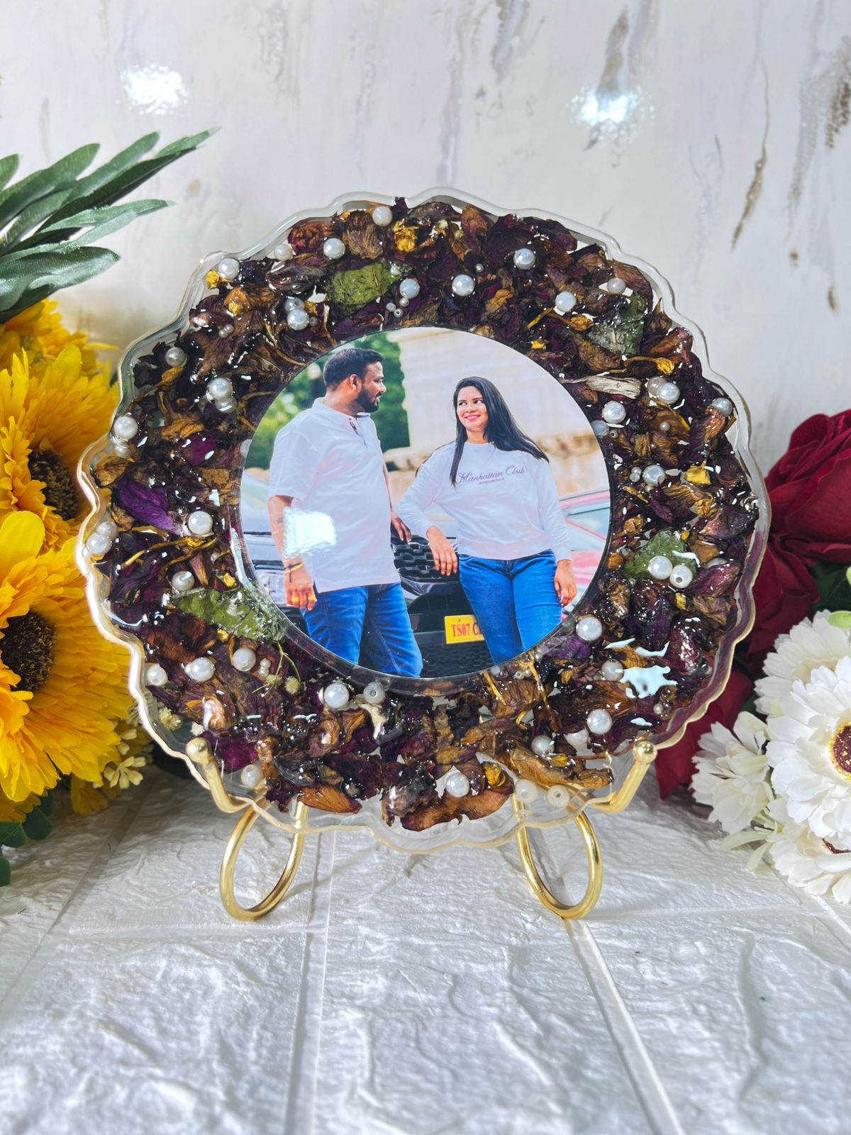 Product Description: This elegantly designed curve-shaped crystal clear frame is the perfect way to preserve your wedding memories. Featuring wedding garland flowers, white pearls, and a cherished couple photo, all preserved beautifully in high-quality resin, this frame captures the essence of your special day. It comes with a sturdy metal stand, making it easy to display in your home. A timeless piece to keep your wedding moments alive and shining forever. Features: