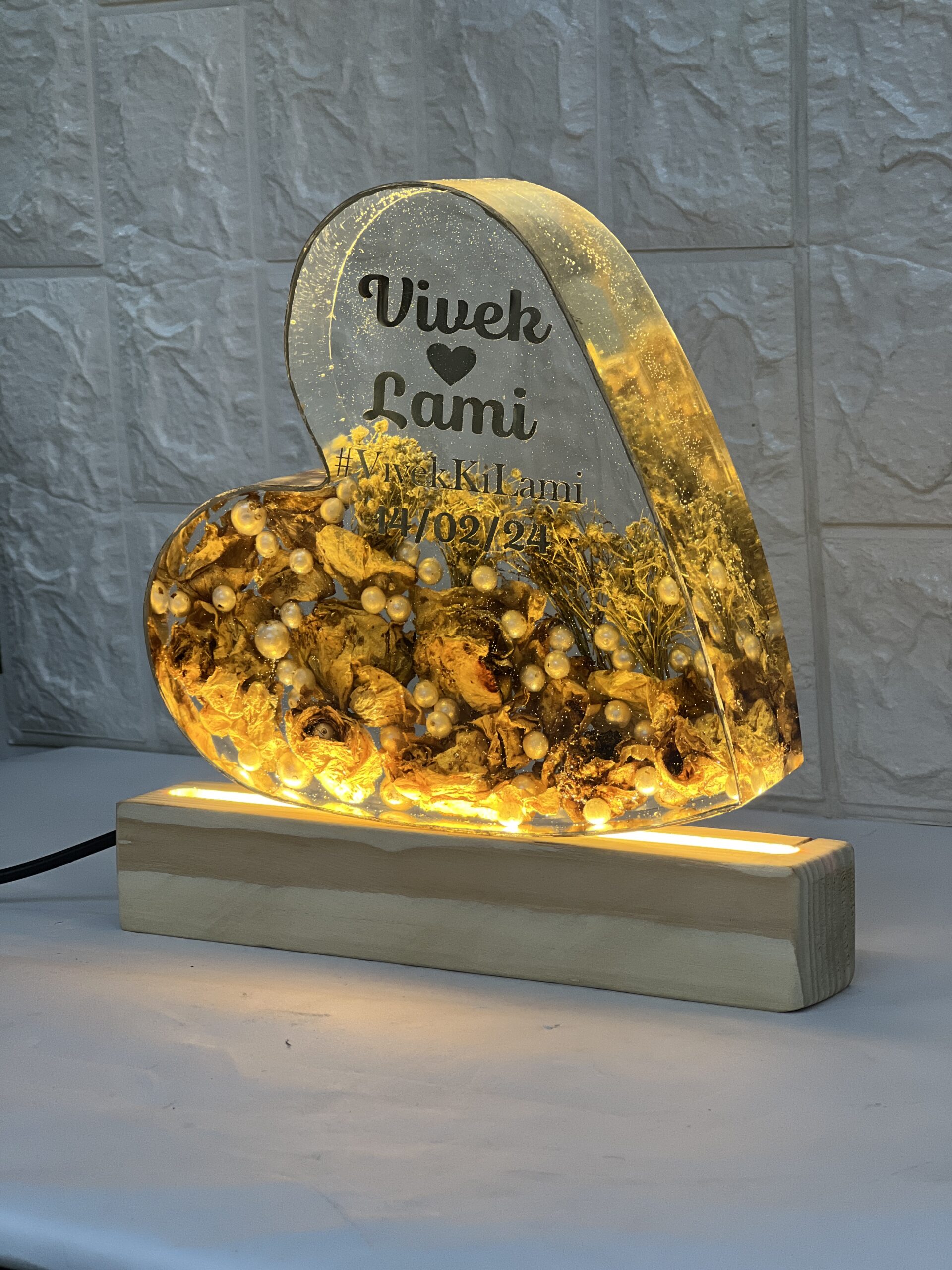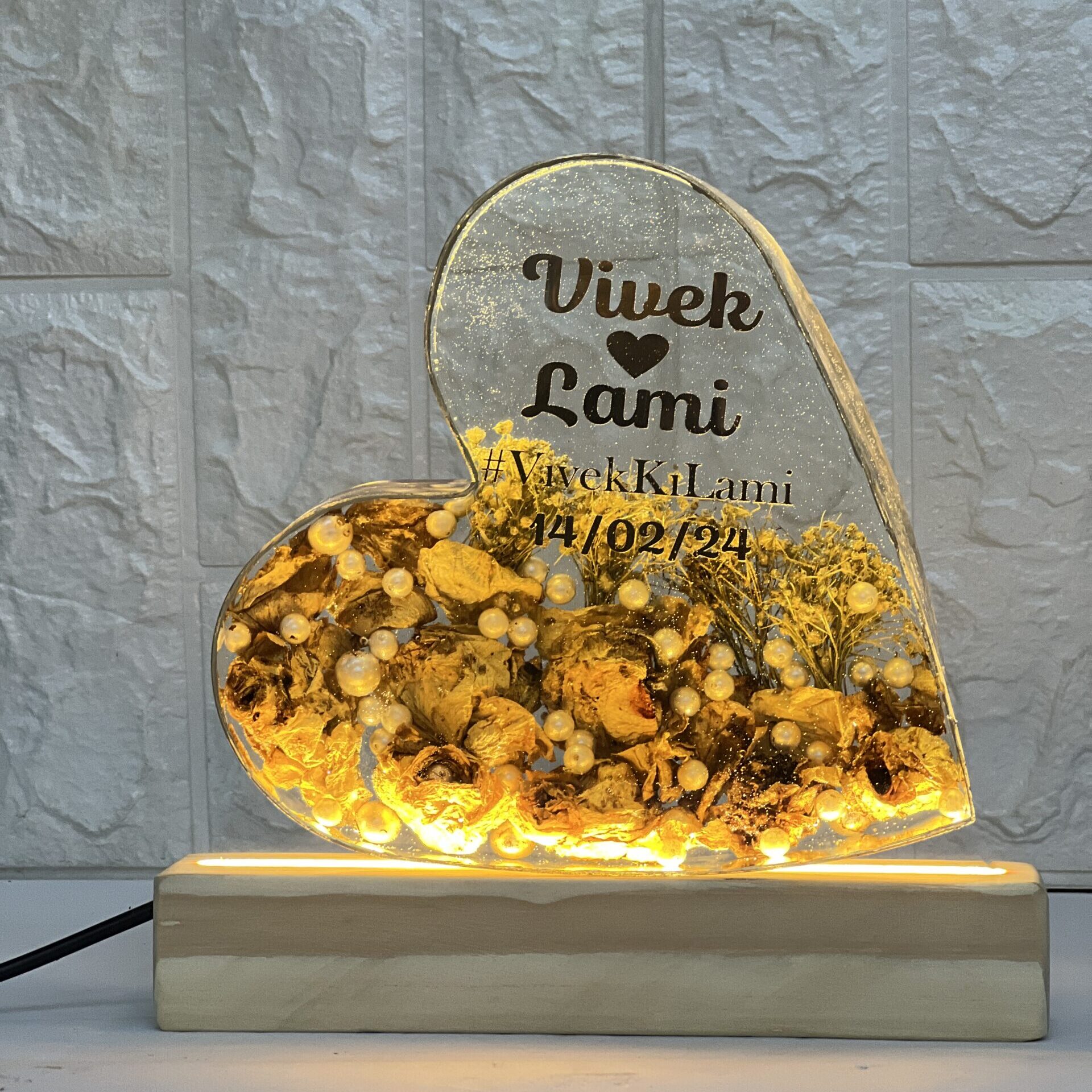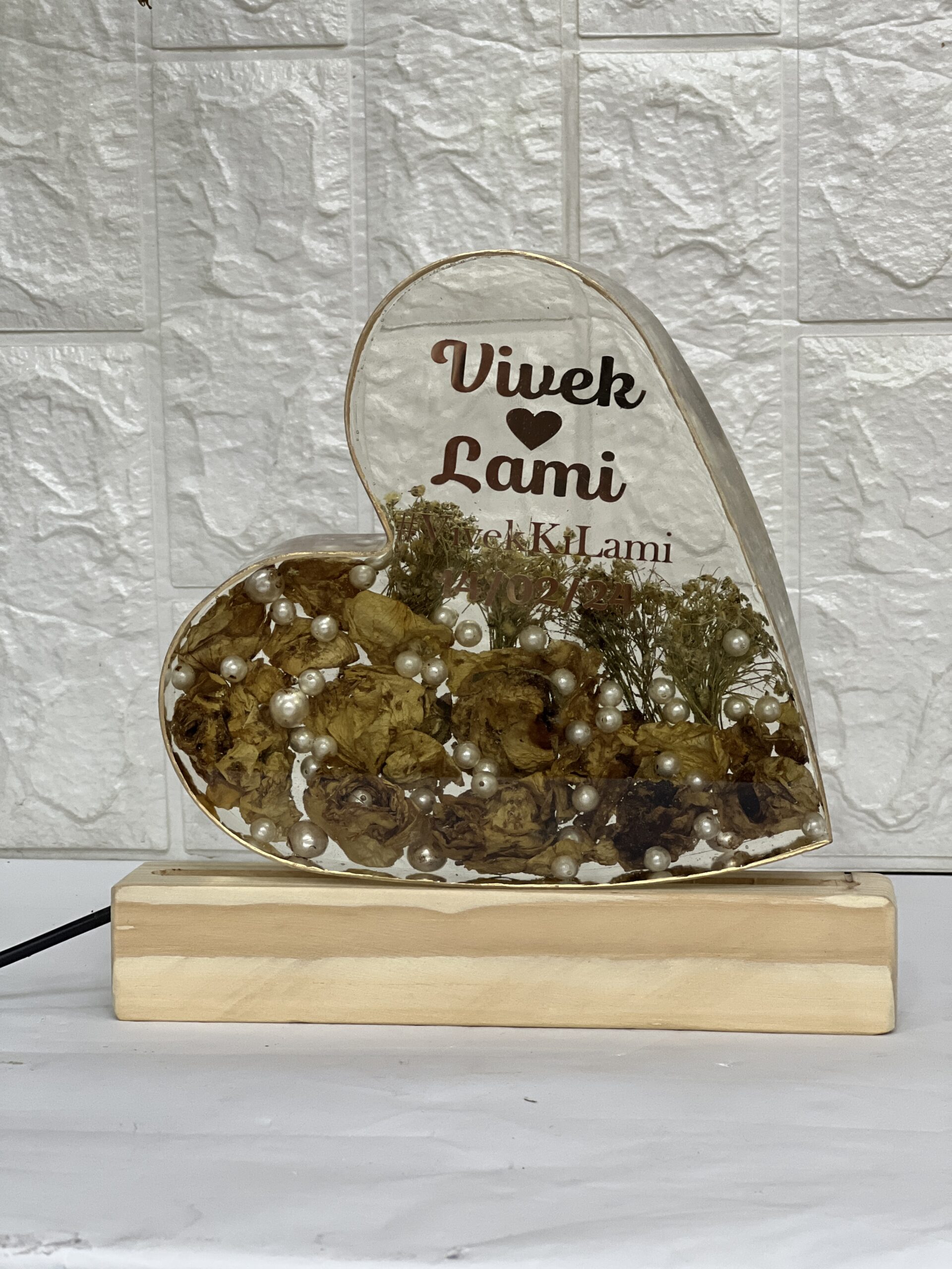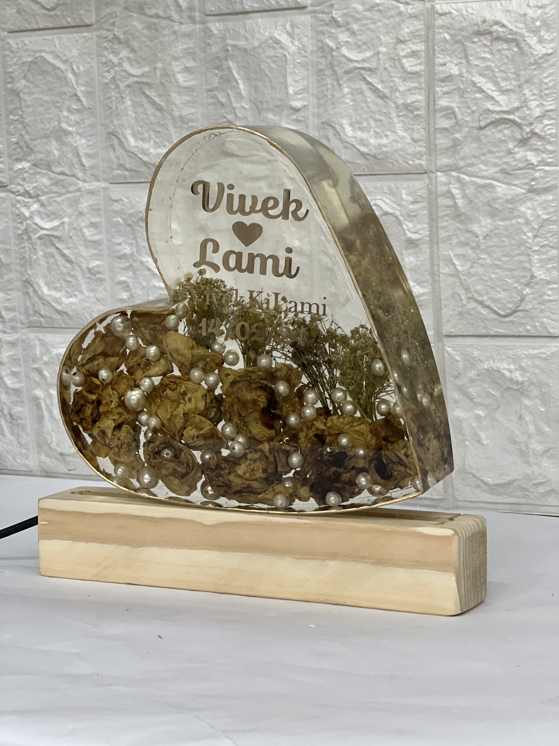 Product Description: Transform your wedding memories into a stunning keepsake with this heart-shaped resin preservation frame. Crafted to preserve your wedding garland flowers, it features the couple’s names and wedding date, making it a truly personalized treasure. Paired with a wooden LED stand, this elegant frame adds a soft, glowing ambiance to any space. You can also customize your own design to preserve not just your varmala but also other cherished wedding ornaments, such as petals, ribbons, or jewelry. Whether you envision a heart, square, or any other shape, this frame is made to celebrate your unique love story. Where Can You Place It?