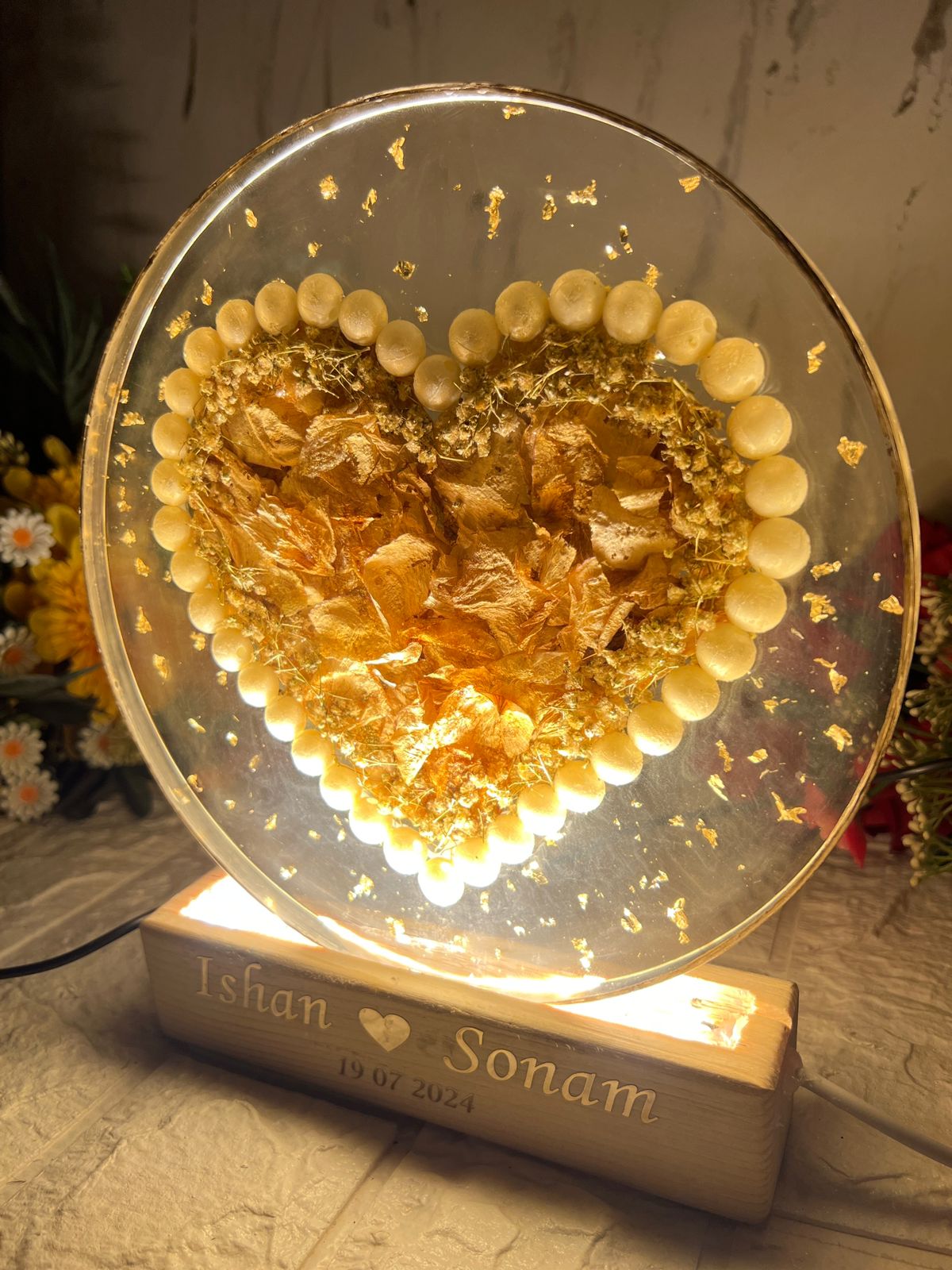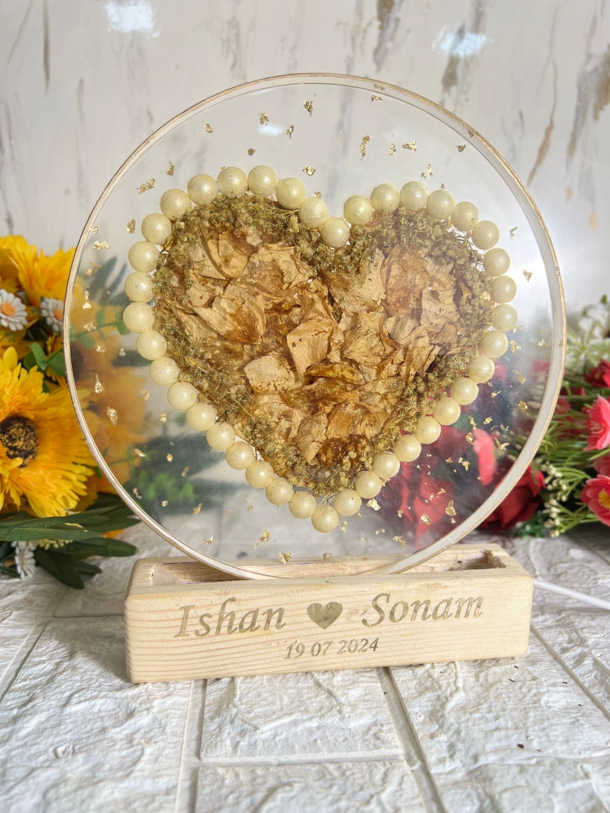 Product Description: This 8-inch round crystal clear LED frame is an exquisite way to showcase your love and memories. The frame features a beautiful heart-shaped flower design, created with white pearls bordering the preserved flowers. The frame is accompanied by a wooden LED stand, adding a soft, ambient glow to enhance the beauty of the piece. To make it even more personal, the couple's name is engraved on the stand, making it a truly unique and meaningful keepsake. Features: