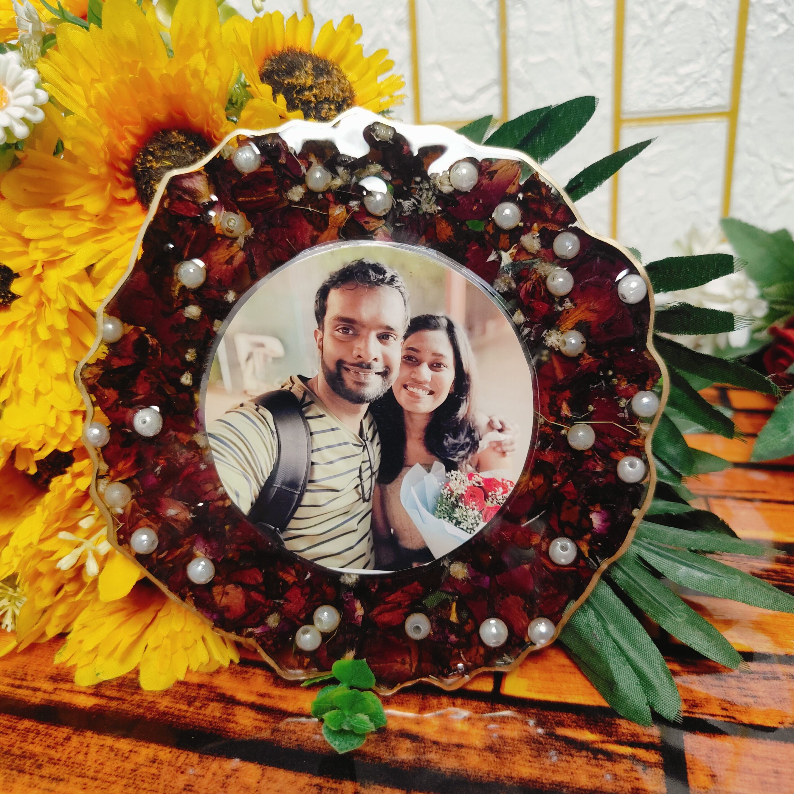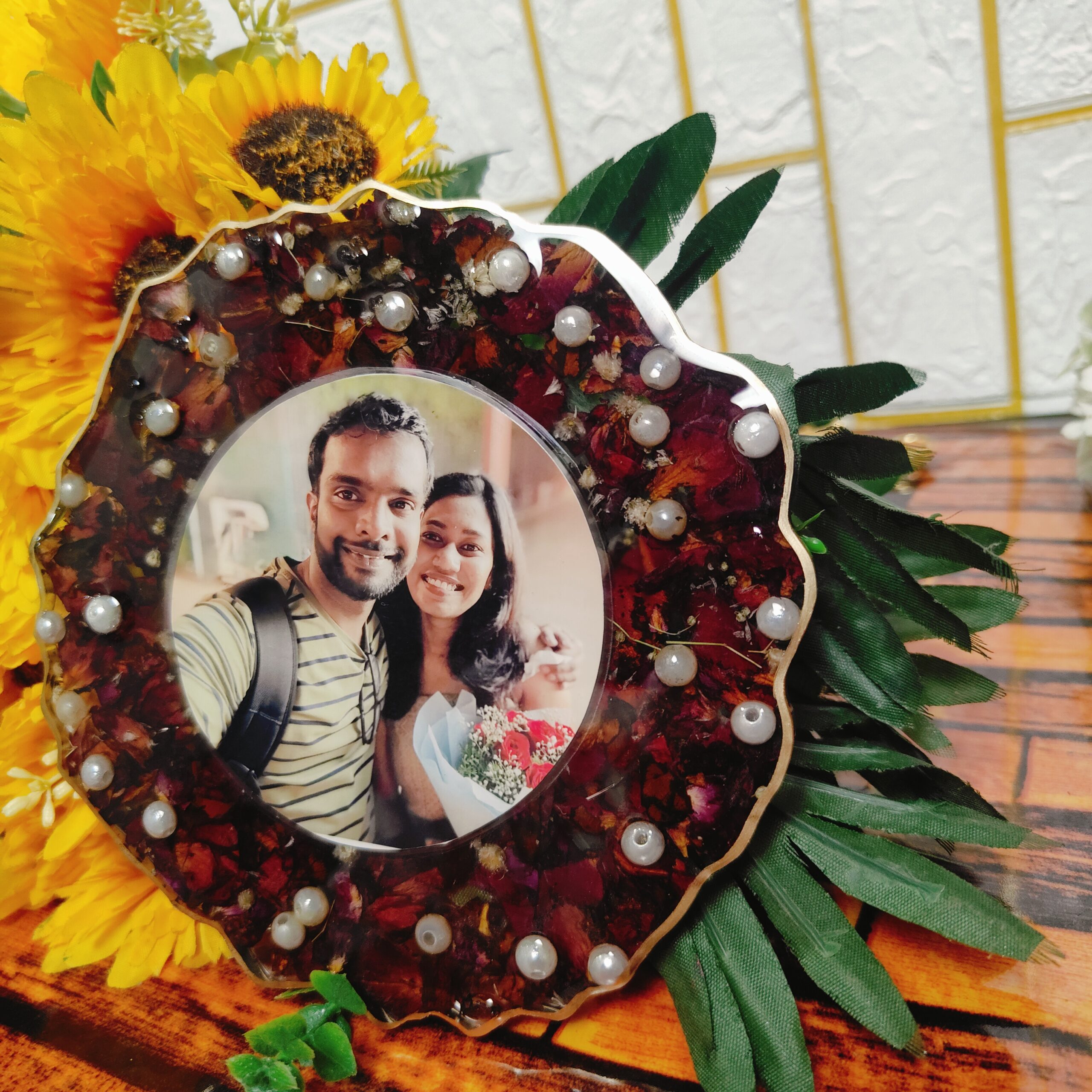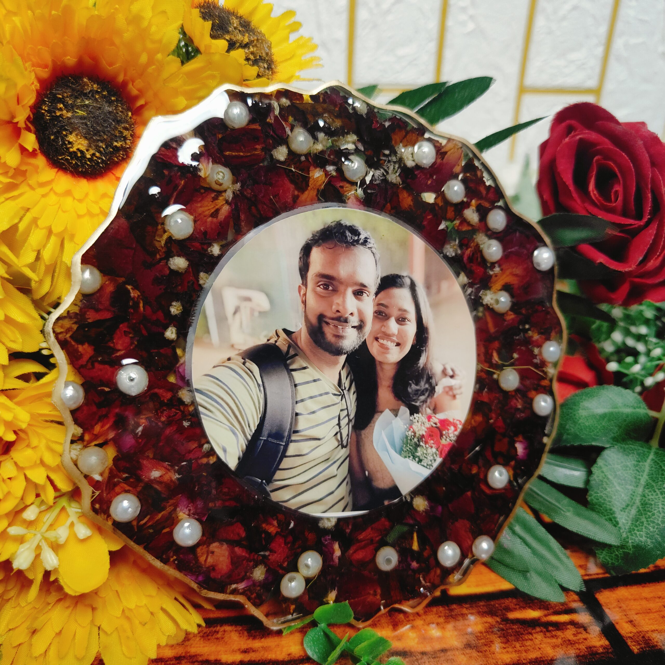 This round resin frame is a symbol of love and happiness. It holds your favourite photo in the centre, surrounded by real preserved petals from your varmala. The shiny pearls and deep red flowers make it look royal and full of emotions.