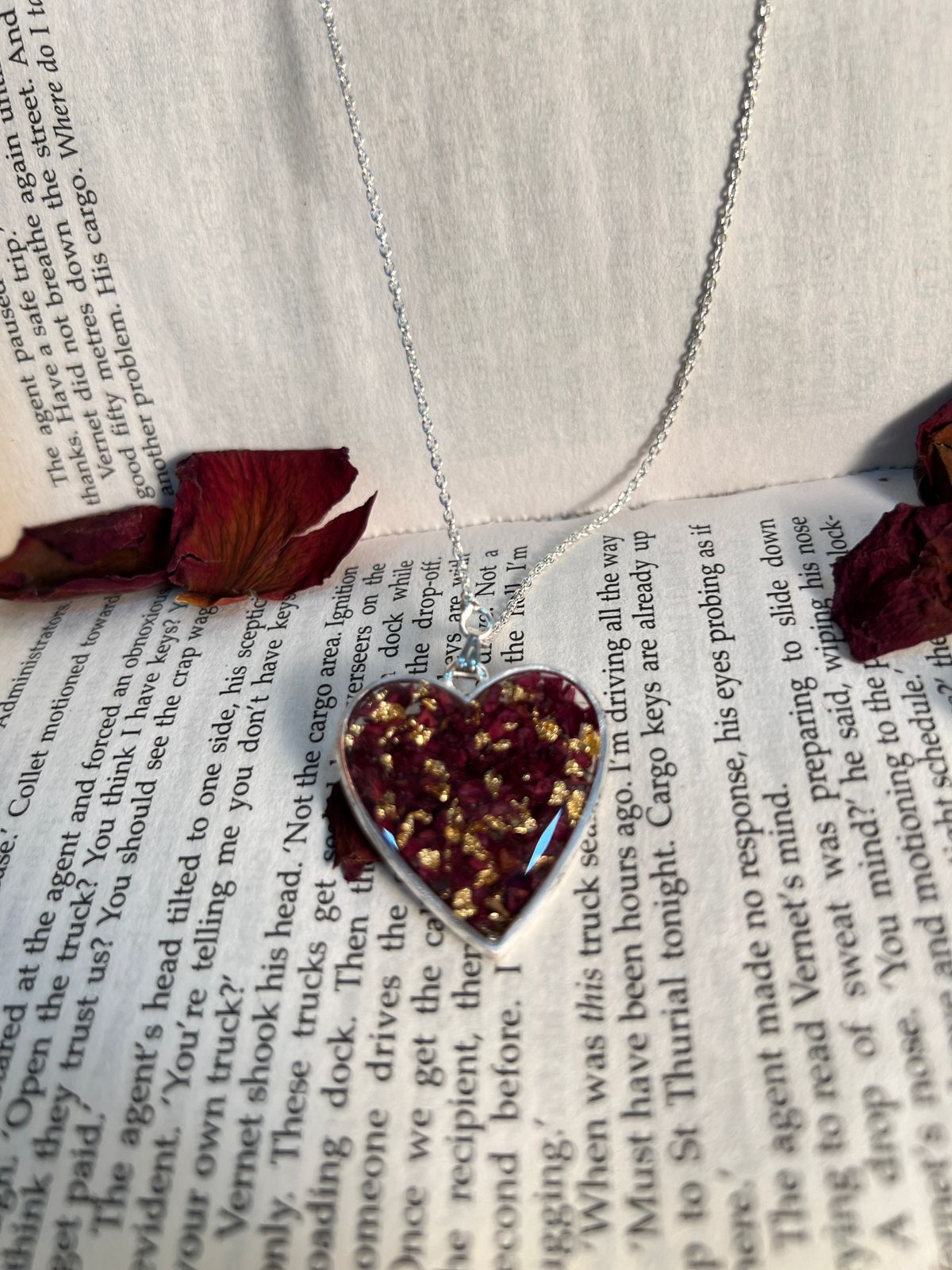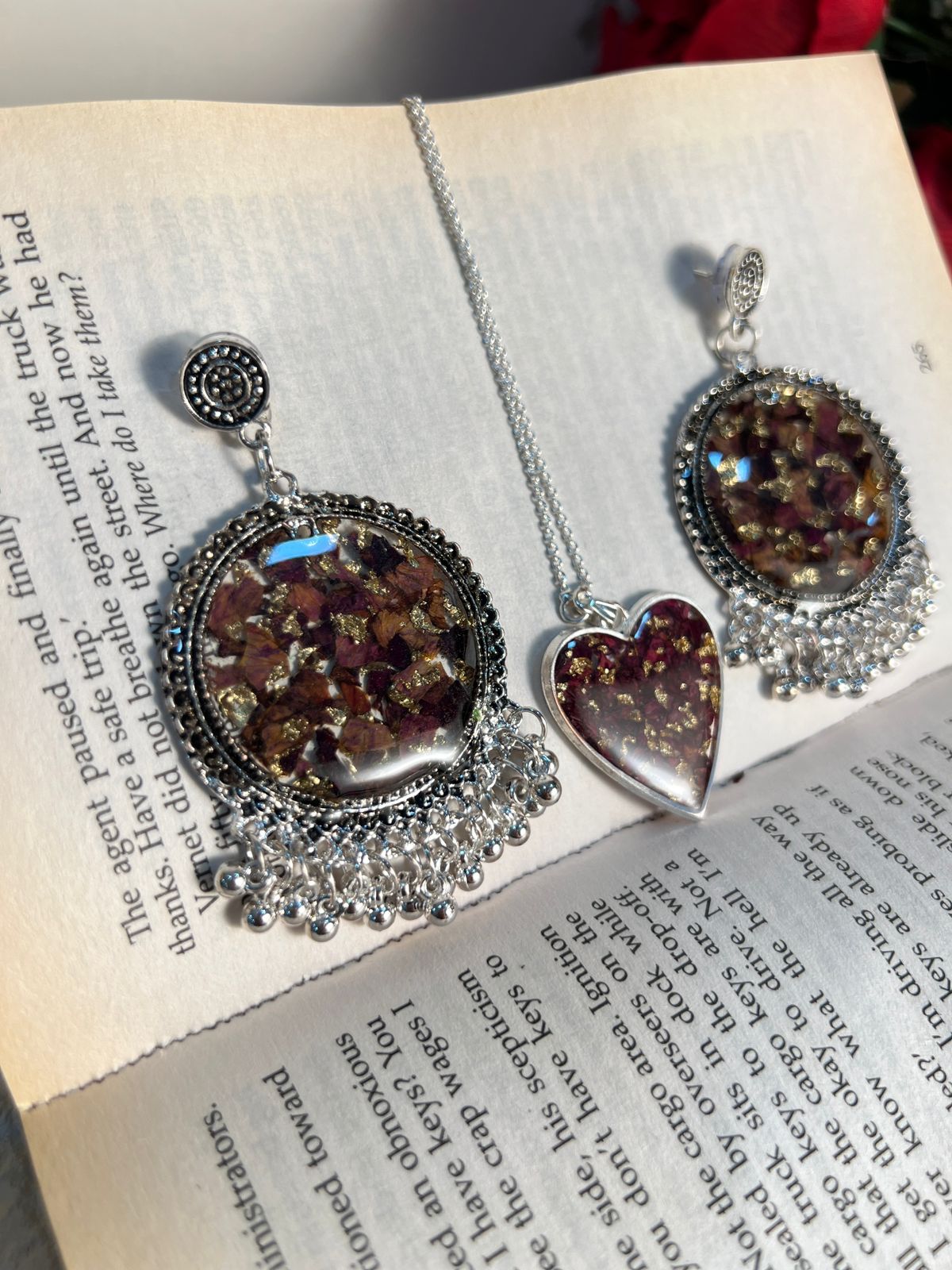 Product Description: This beautiful combo set includes epoxy resin jhumke (earrings) and a silver chain with a heart-shaped pendant, each featuring a real rose preserved in high-quality resin. The delicate jhumke earrings add an elegant touch to any outfit, while the heart-shaped pendant symbolizes love and beauty, showcasing the preserved rose in its full glory. This unique set is a perfect blend of tradition and modernity, making it an ideal gift or personal accessory for any occasion. Features: