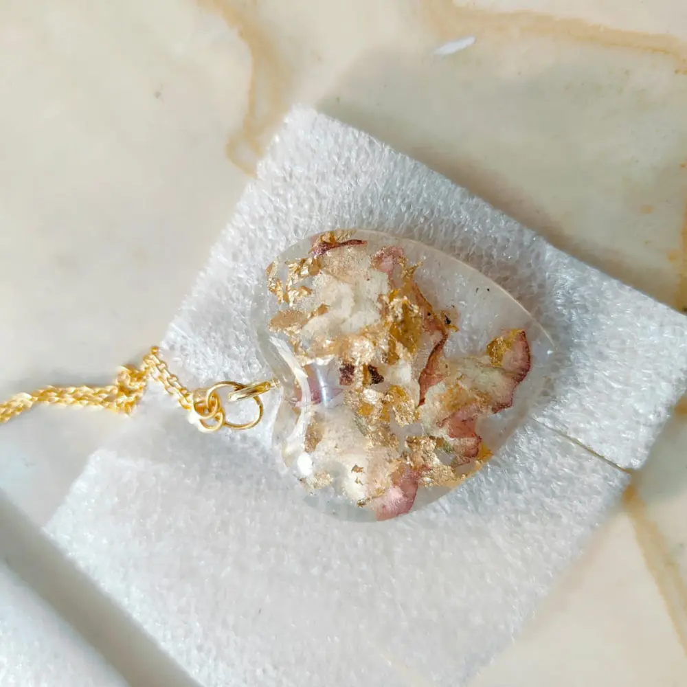 Product Description: Add a romantic touch to your look with the Golden White Flower Preserved Resin Heart-Shaped Pendant. This elegant pendant features delicate flowers preserved within high-quality epoxy resin, creating a stunning, unique design. Perfect for weddings, parties, or theme-inspired events, this pendant is a beautiful keepsake that can be personalized to reflect your style and special occasion. Its timeless heart shape is both sophisticated and sentimental, making it an ideal gift for loved ones. Product Features: