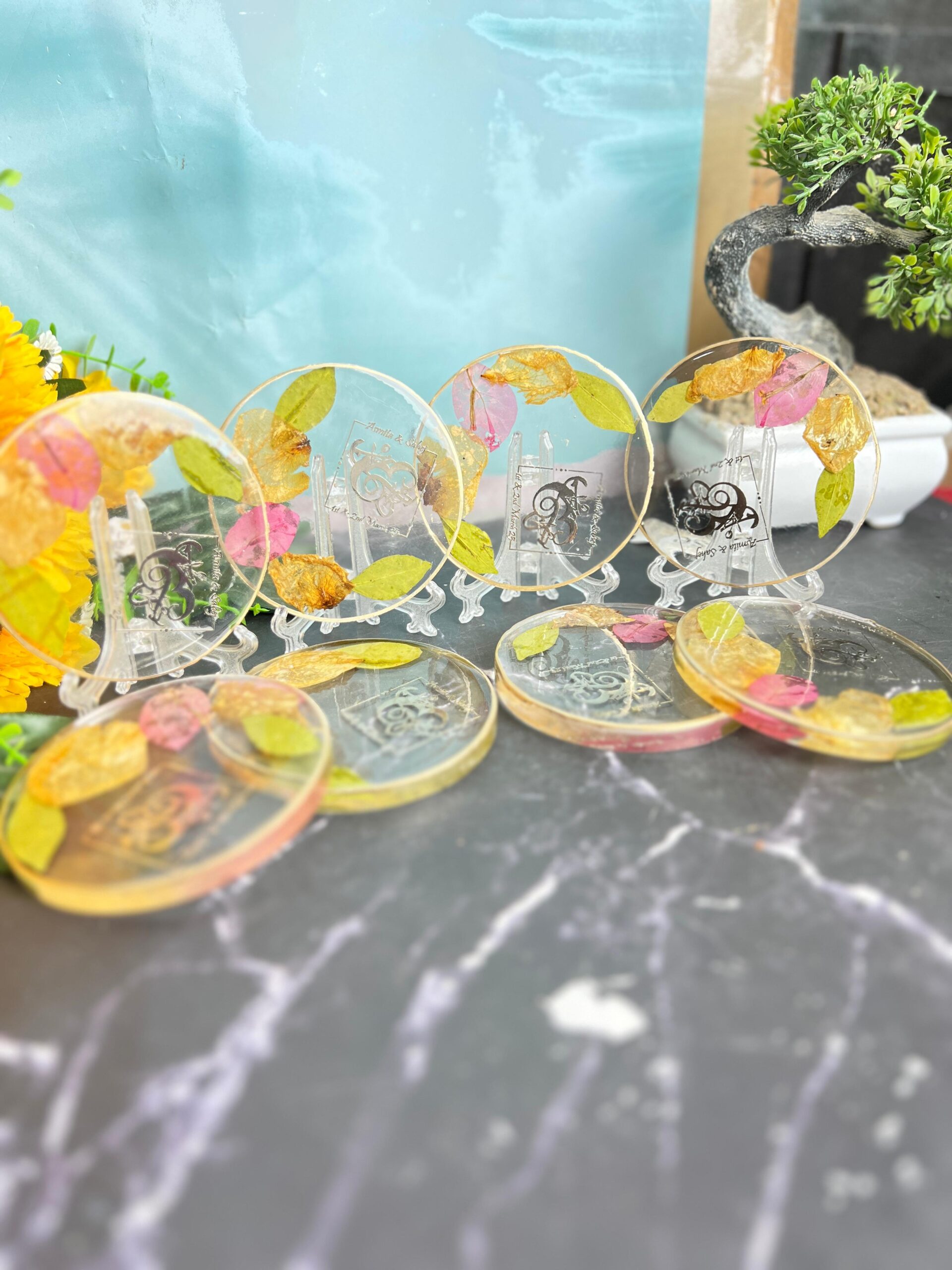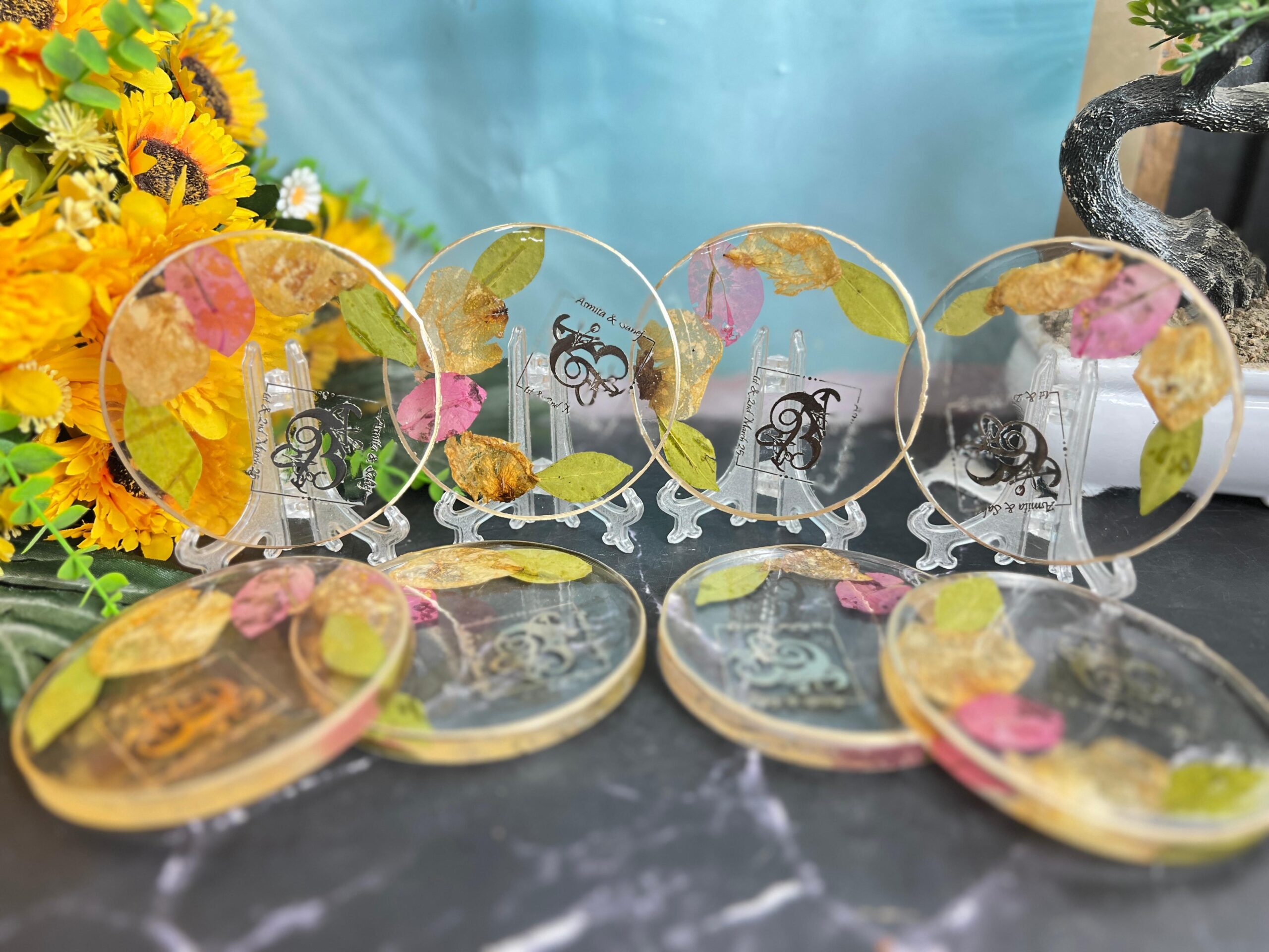 This is a set of 6 handmade resin coasters, each filled with real dried leaves, petals, and golden flakes. The initials of the couple or names are printed inside, giving it a special custom touch. The round shape and see-through design make it look stylish and modern. These coasters are strong, shiny, and easy to clean. They add beauty and personal charm to your table. A great mix of nature and memory in one simple item.