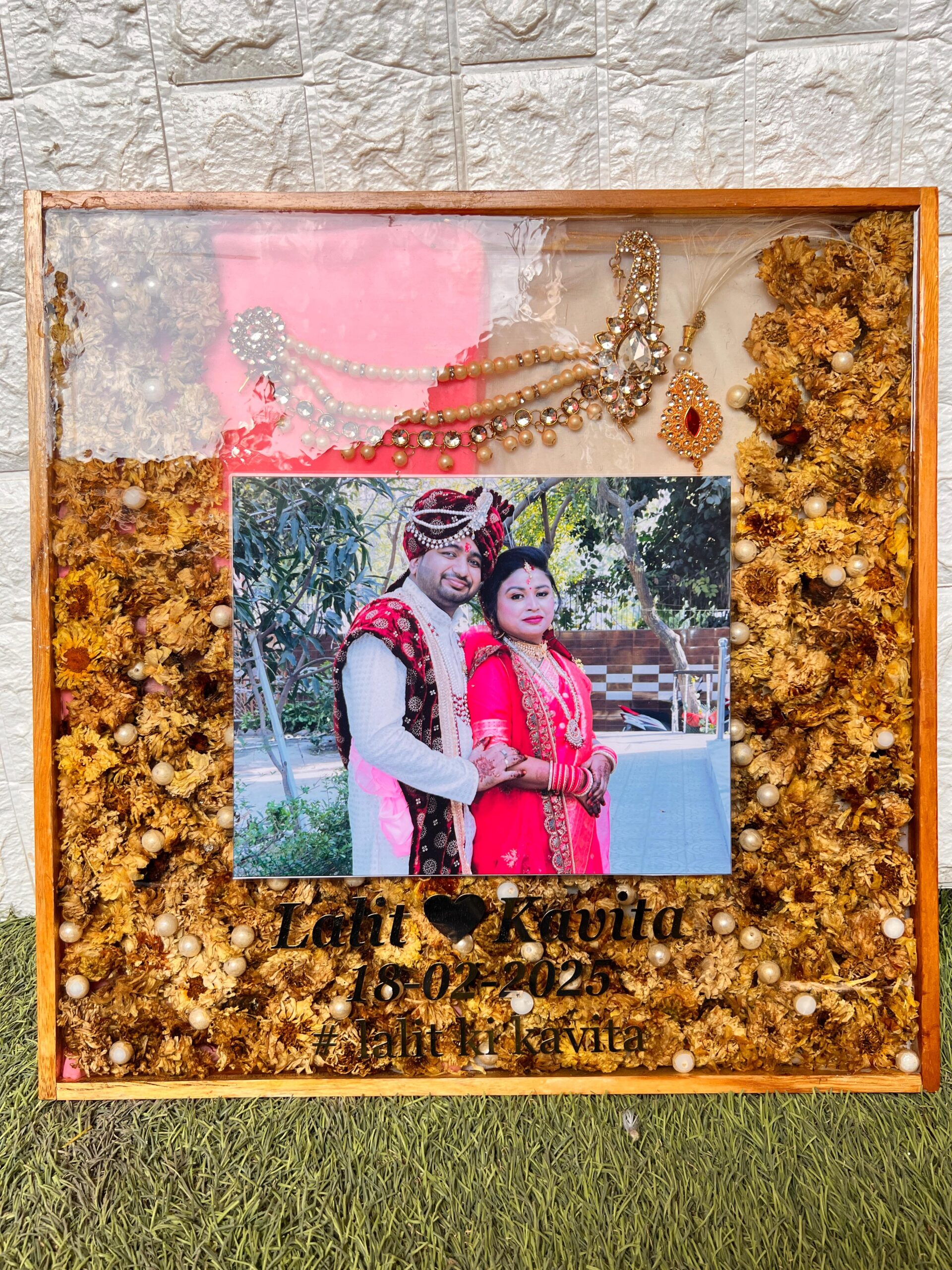 It includes your kalangi, morchhadi and other personal details from your special day — all locked in resin for a lifetime. The names, date, and a special message add a personal touch to this handcrafted frame.