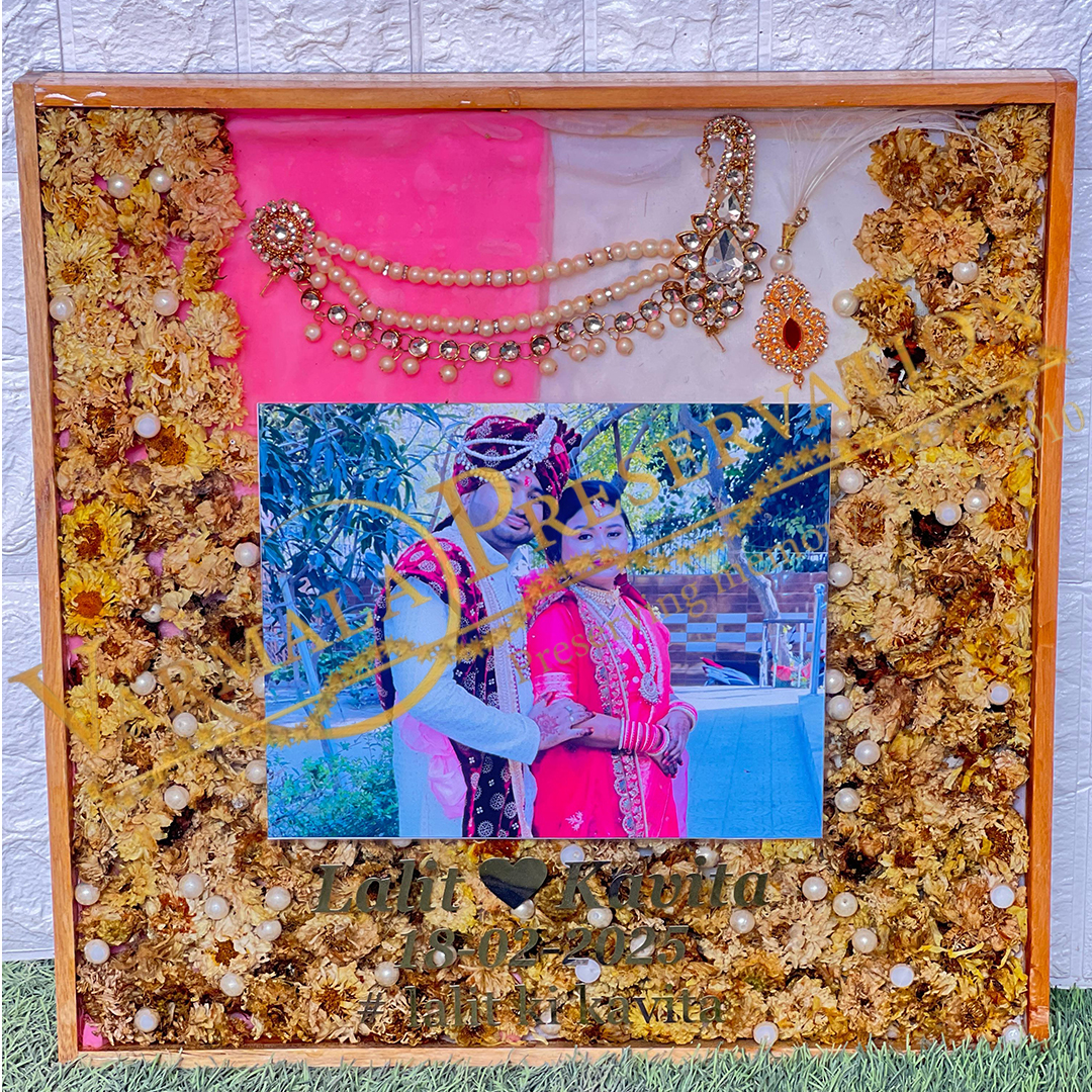 Celebrate your wedding forever with this Custom Resin Frame featuring your wedding photo, groom jewelry, and real varmala flowers. This beautiful keepsake is made using deep casting resin technique, giving a 3D look with preserved flowers and ornaments set perfectly in place.