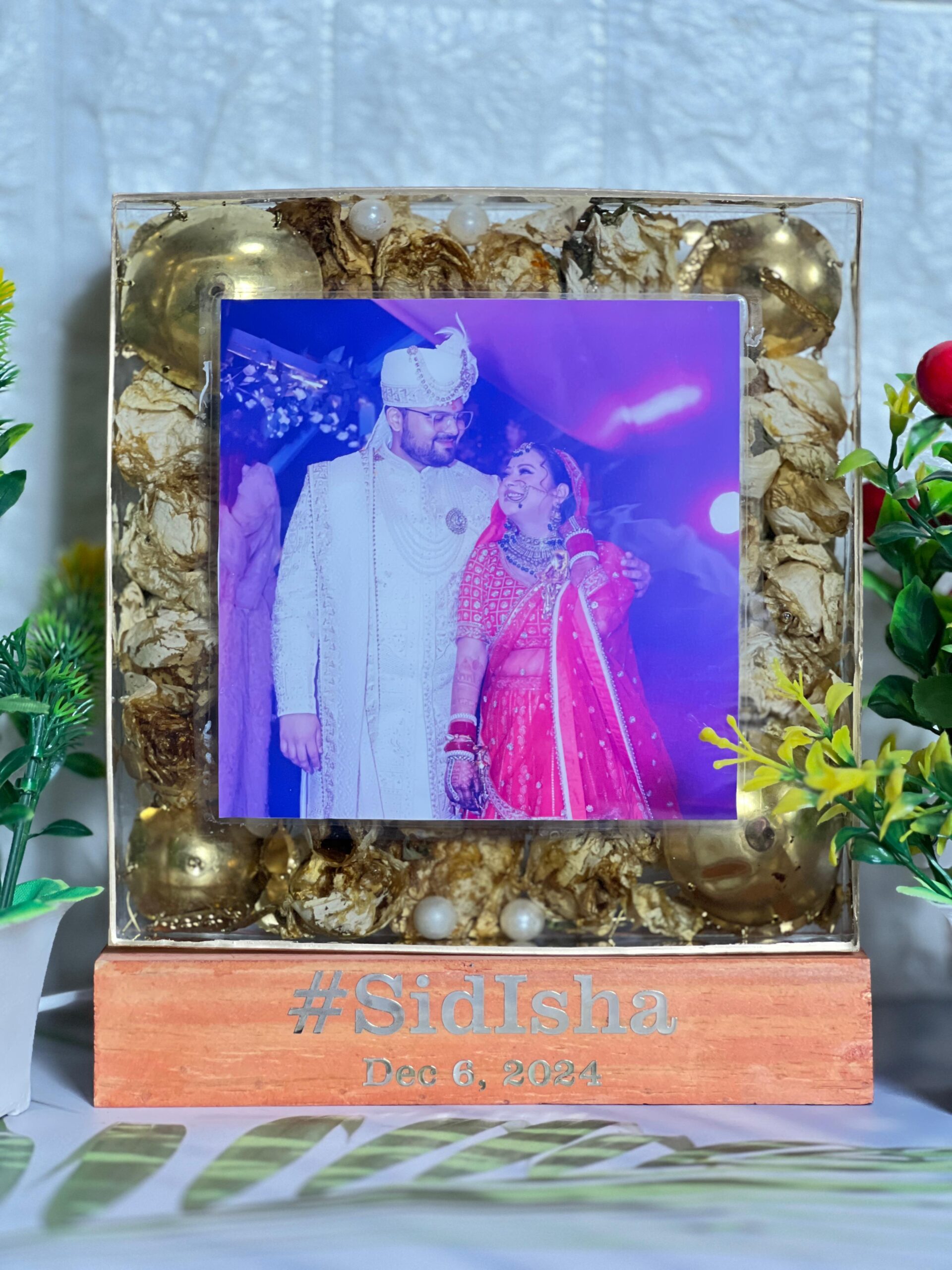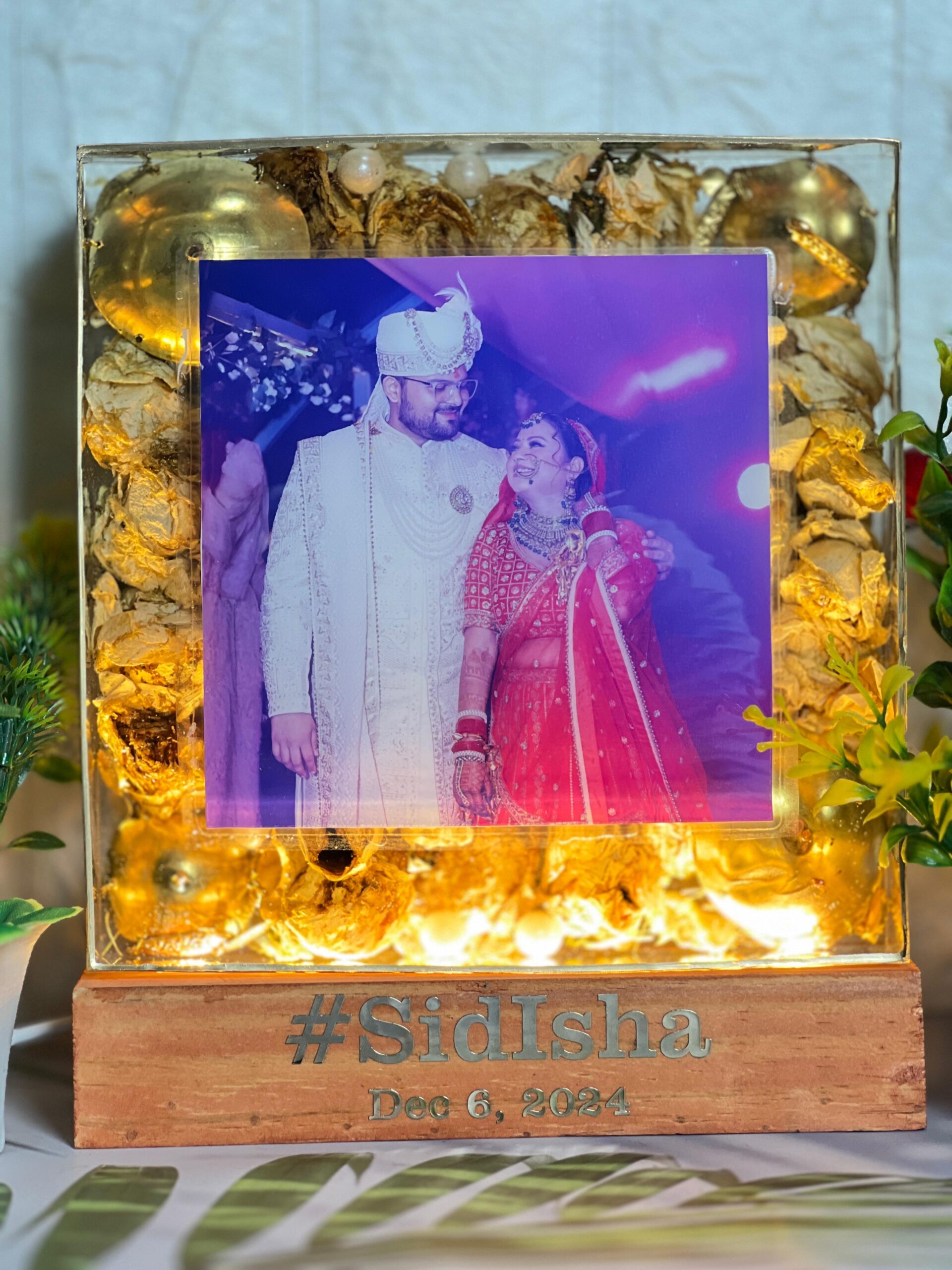 Celebrate your wedding story with this custom wedding varmala memory frame. It safely locks your real varmala flowers in shiny resin and lights them up with soft warm LED lights. Your wedding photo, couple name hashtag (#SidIsha), and special date (Dec 6, 2024) make it 100% personal and heart-touching.