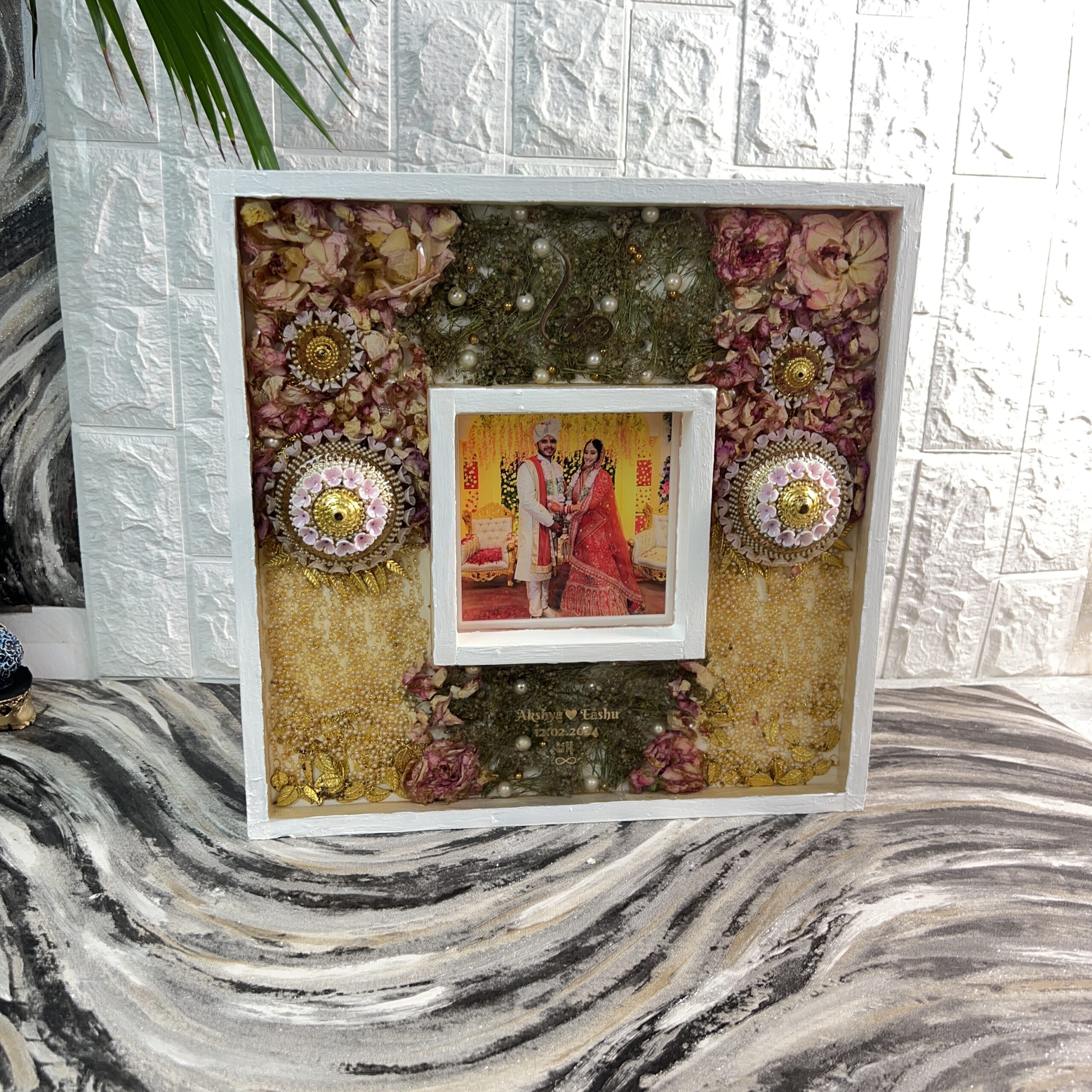 Product Description: Capture the essence of your special day with this 14-inch double wooden frame, designed to showcase the most memorable moments from your wedding. This beautifully crafted frame features wedding garland flowers and the bride’s kaleerein, both preserved with great care to maintain their beauty for years to come. The center of the frame holds a custom photo, thoughtfully preserved in resin, creating a timeless display of your love story. Not only does this frame hold cherished memories, but it is also personalized with the couple's names, an elegant infinity sign, and their wedding date, making it a truly special keepsake. Customization Options: You can customize any frame to your liking by adding more meaningful elements from your wedding day. Whether it's the wedding garland flowers, kaleerein, or any other special items from your wedding, we can preserve them for you in a unique design that tells your love story. Why You'll Love This Frame: