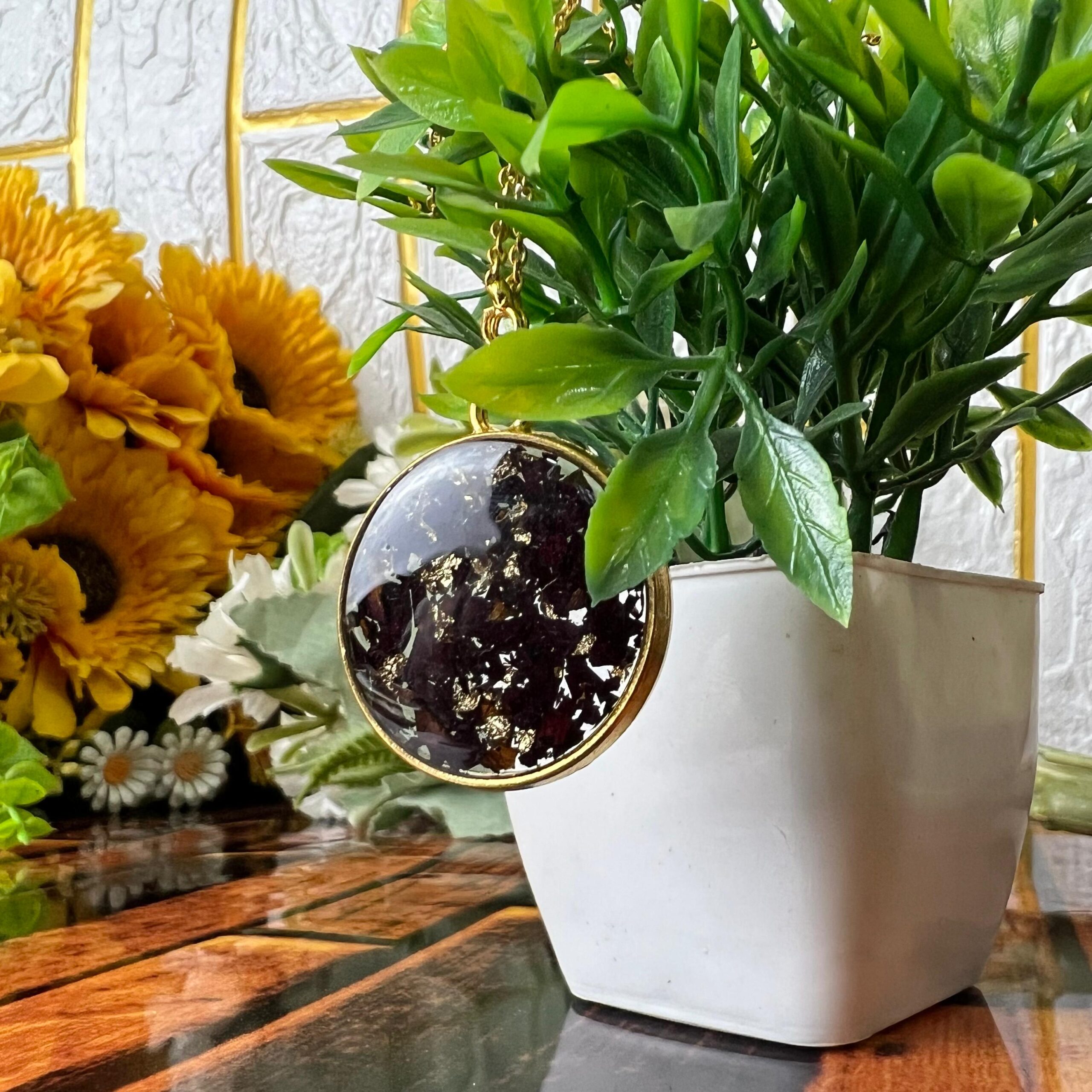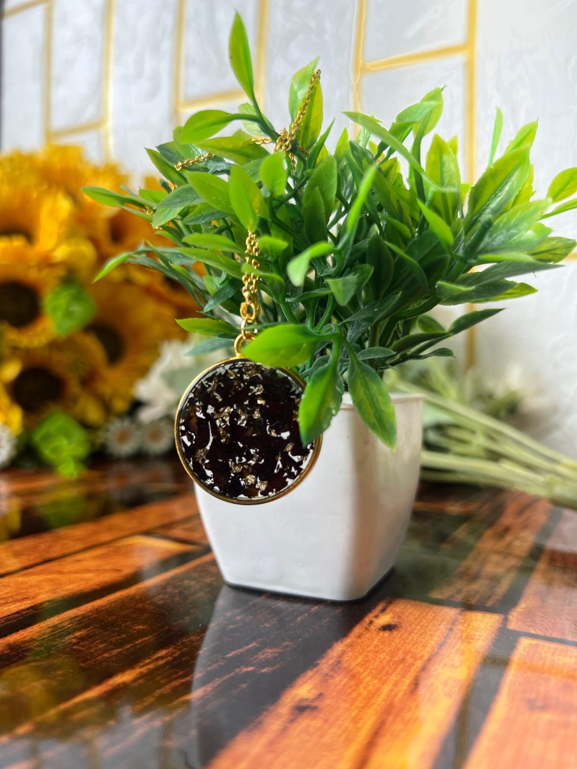 Each pendant is handmade with real dried flowers and gold flakes, carefully sealed in crystal-clear resin for a lasting finish.