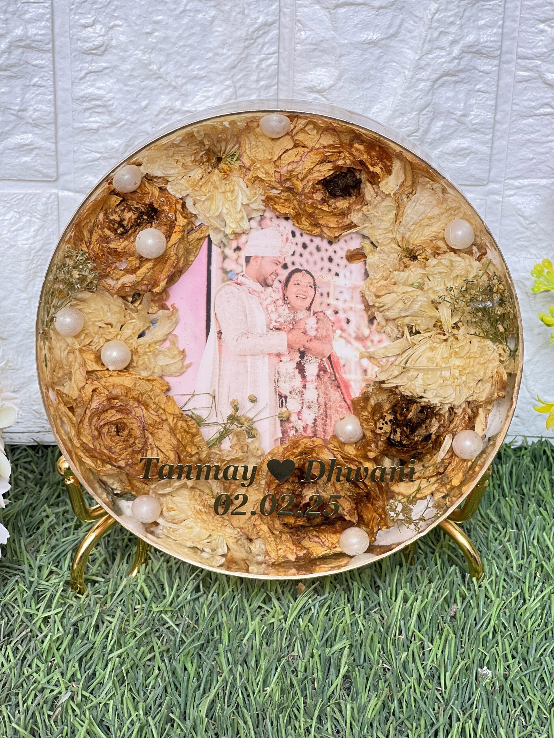 Celebrate your special day forever with this beautiful round resin frame crafted using your real varmala flowers. This piece captures a heartfelt moment in time with custom names, wedding date, and a loving photo right at the center. The dried flowers are professionally preserved and embedded in high-quality epoxy resin, creating a lasting memory that won’t fade. The touch of pearls adds a sense of elegance and class, making it more than just a memory — it’s a piece of art. Whether you’re gifting it to your partner or keeping it for yourself, this unique wedding keepsake is bound to hold emotional value for years to come.