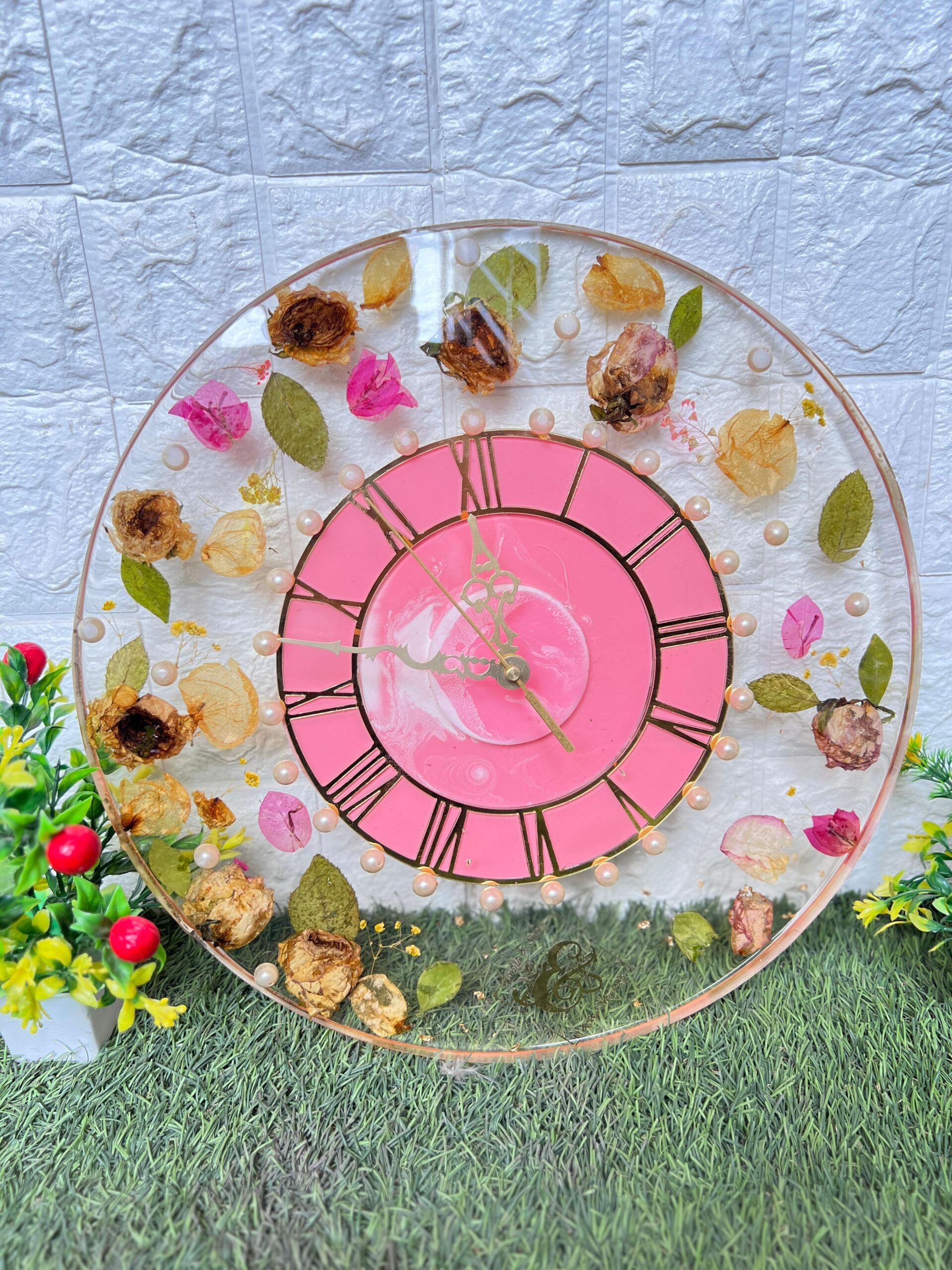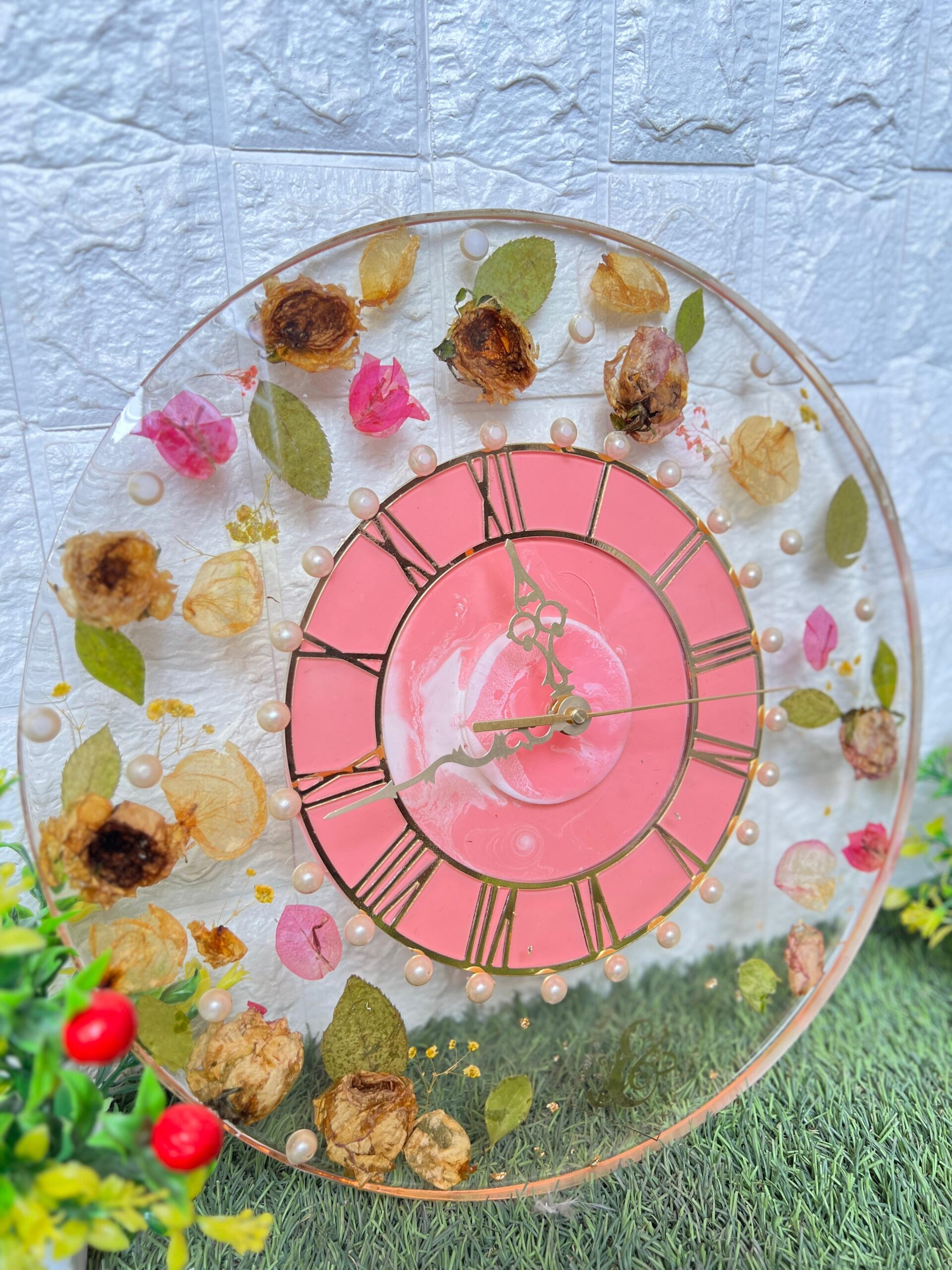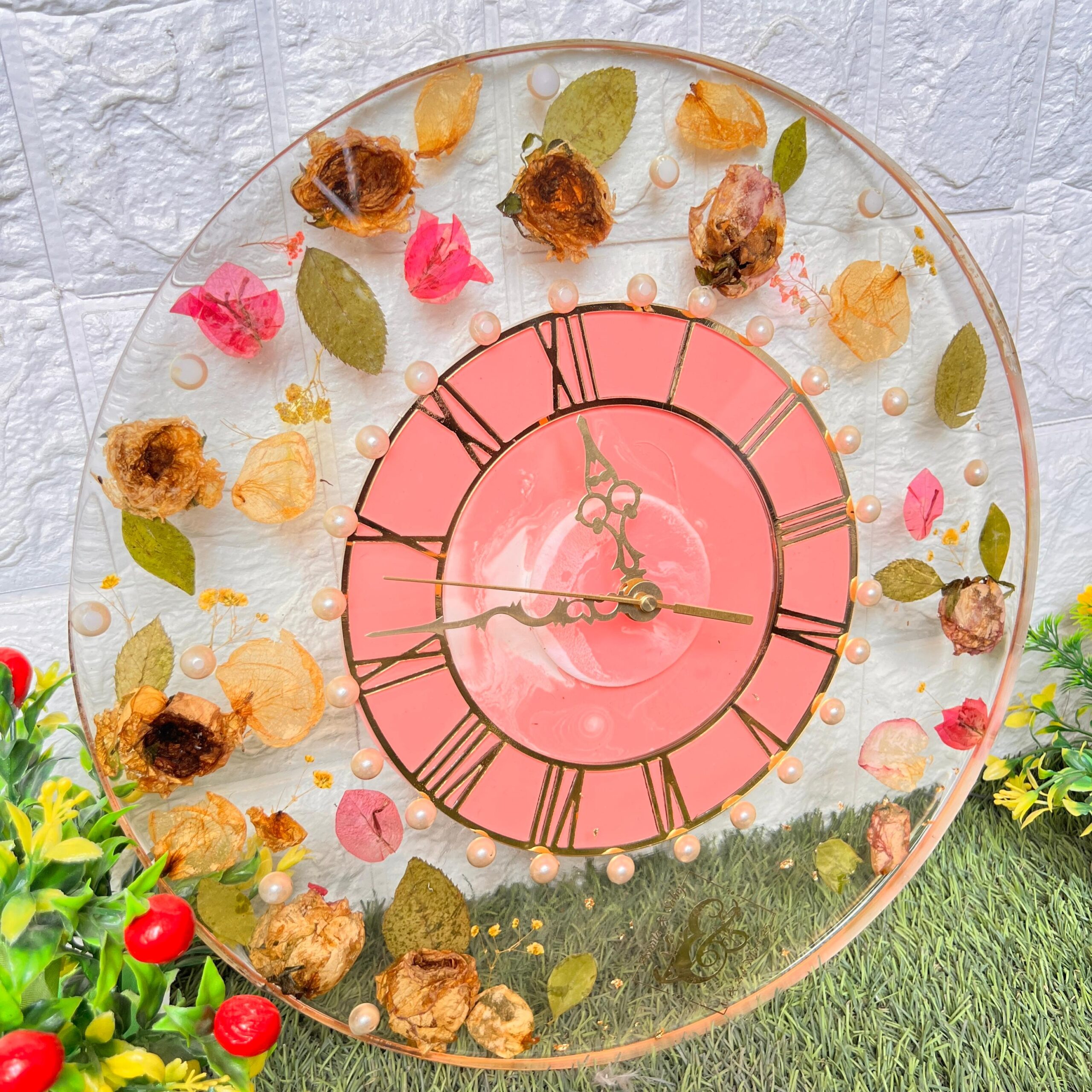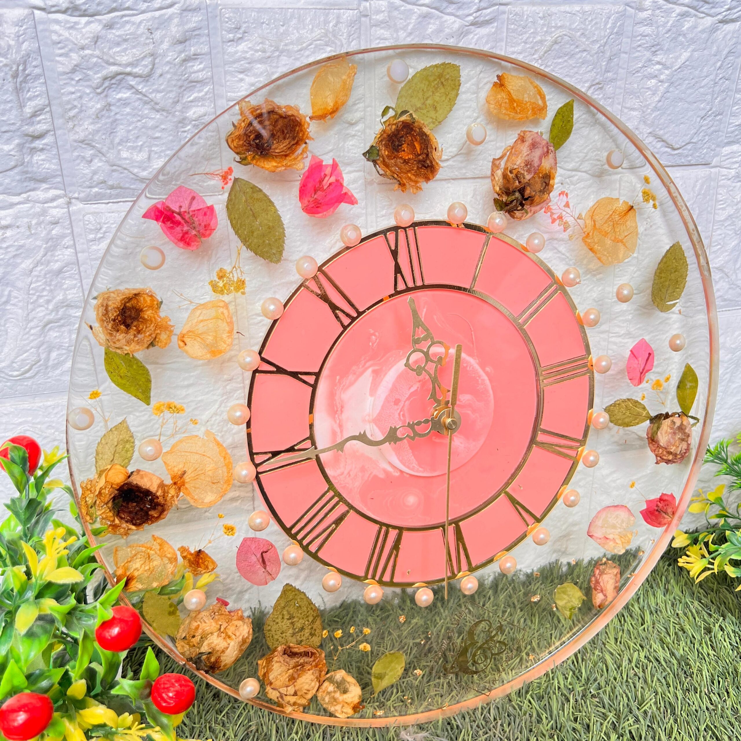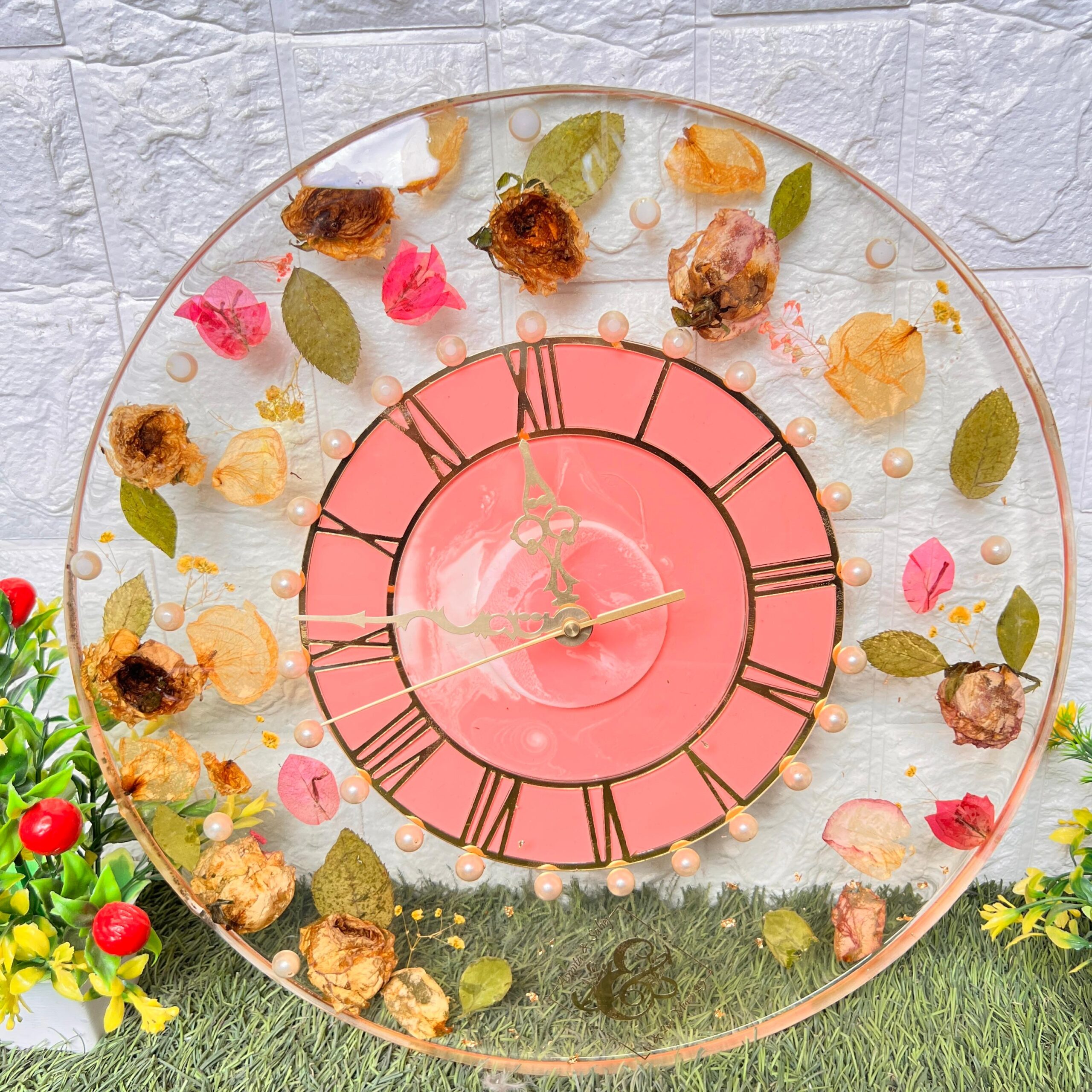 This is a one-of-a-kind round resin wall clock designed using real varmala and wedding flowers. Each flower and leaf is carefully hand-preserved in crystal-clear resin to give it a timeless beauty. The peach-pink clock face with Roman numbers adds a classy touch. Small pearls circle the dial, giving it an elegant look. Every clock is handmade and unique – no two designs are ever the same.
