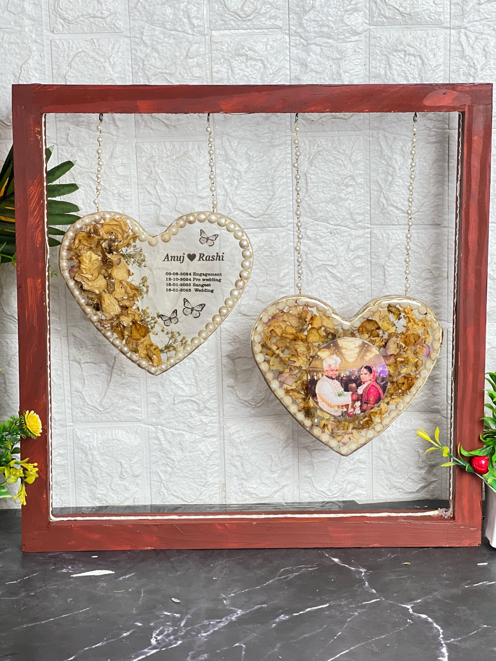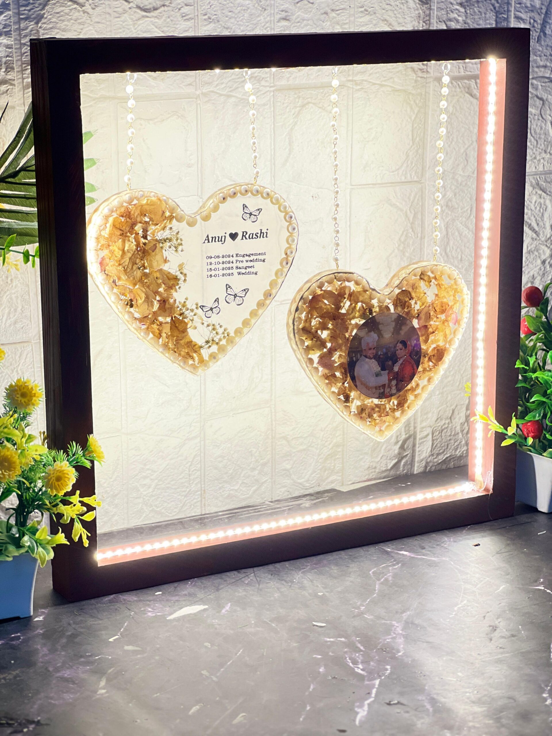 Celebrate your forever moment with our heart shape wedding varmala preservation LED resin frame. Made using high-quality epoxy resin, this frame carefully preserves your real wedding varmala flowers, along with a beautiful couple photo and custom text. The elegant double heart design adds emotional value and beauty. Fitted with warm LED lights and a classy wooden frame, it creates a glowing memory piece for your home.