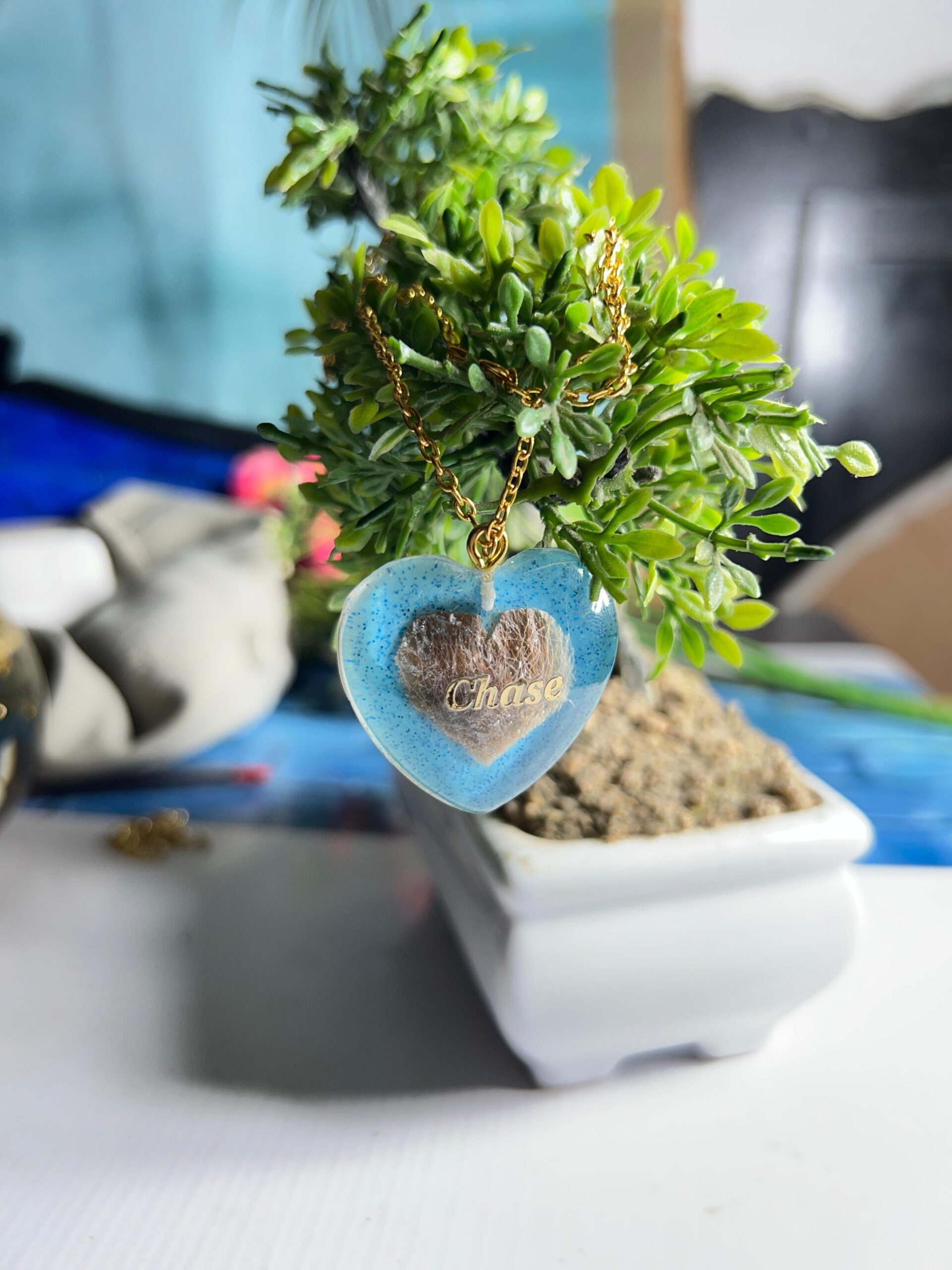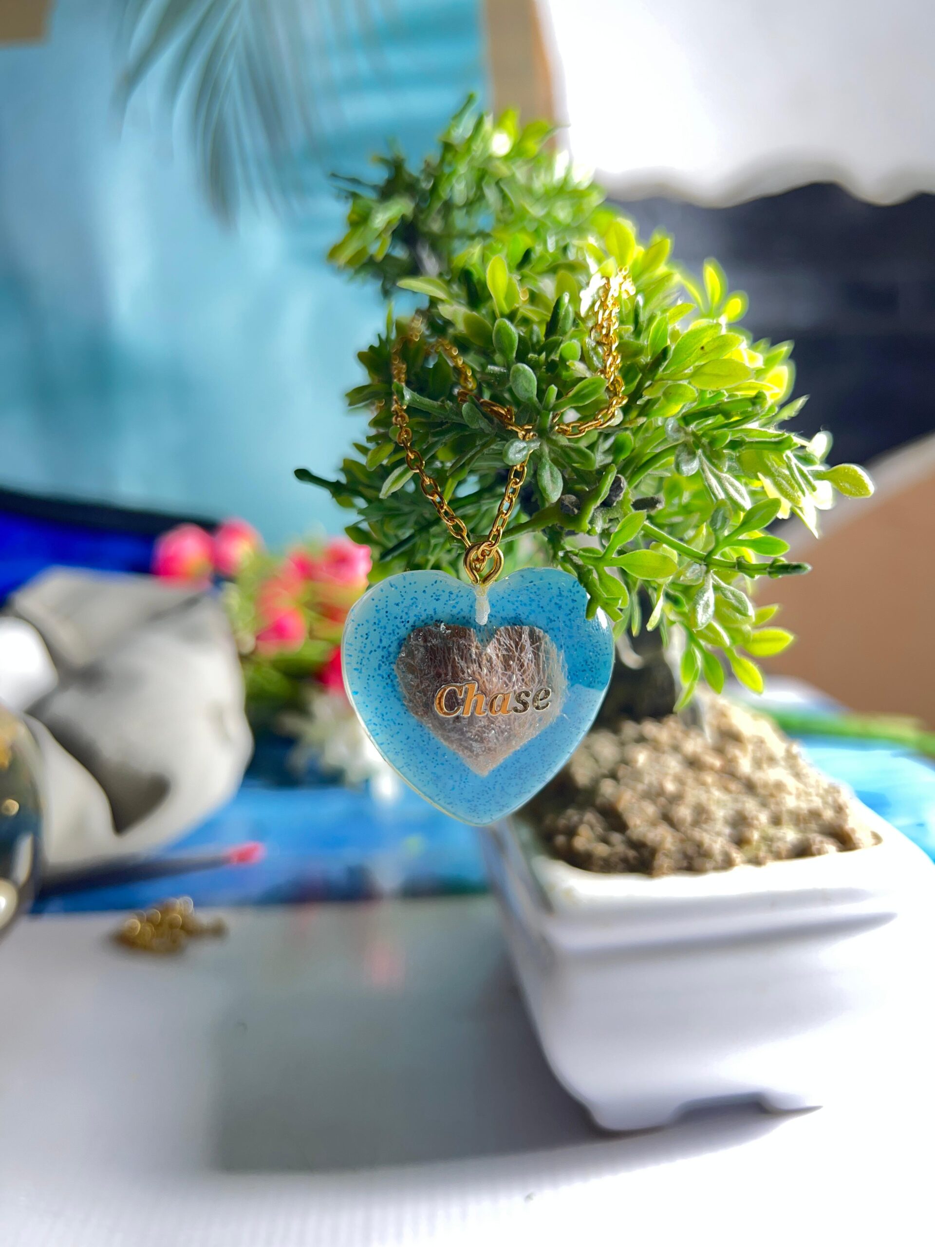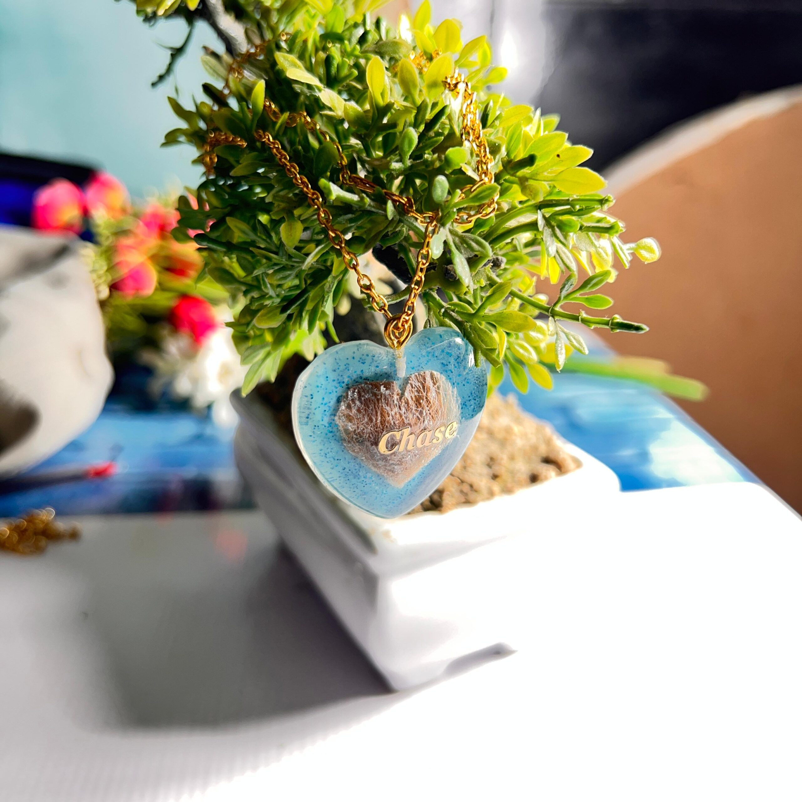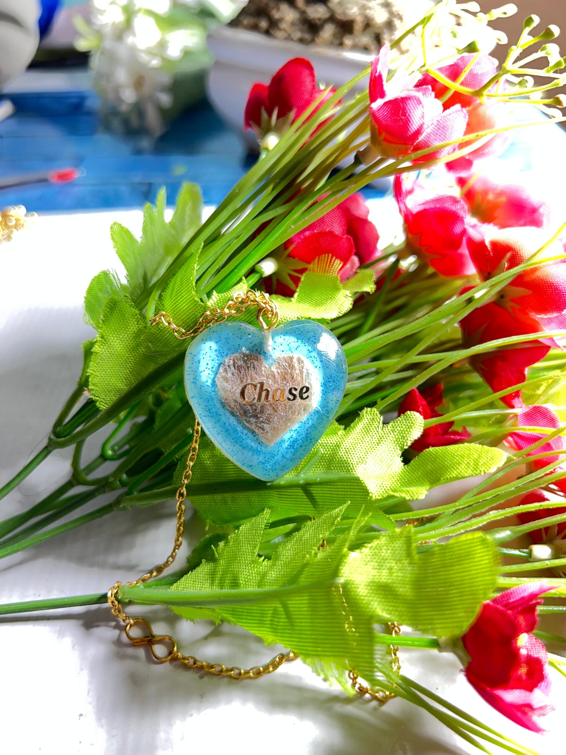 This Heart Resin Keepsake Pendant is a very special piece made to hold memories close. It has a real lock of hair carefully sealed inside a heart-shaped resin locket. The name is added inside the design to make it even more personal.