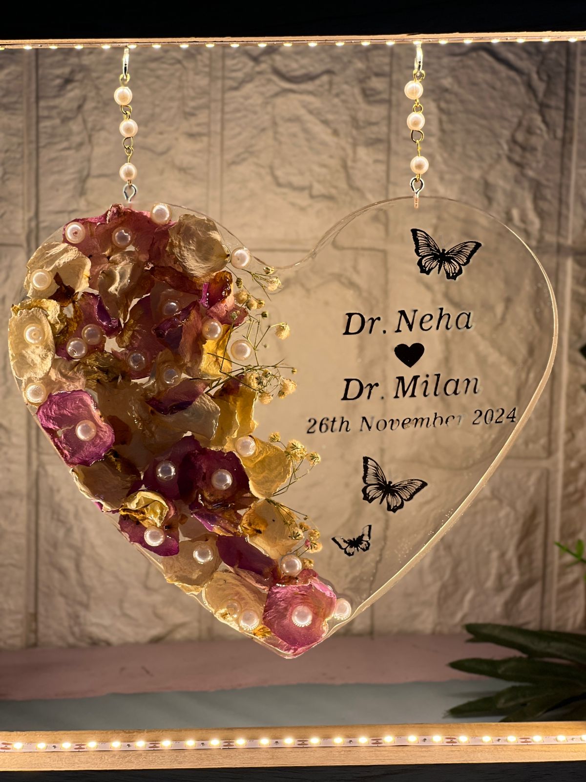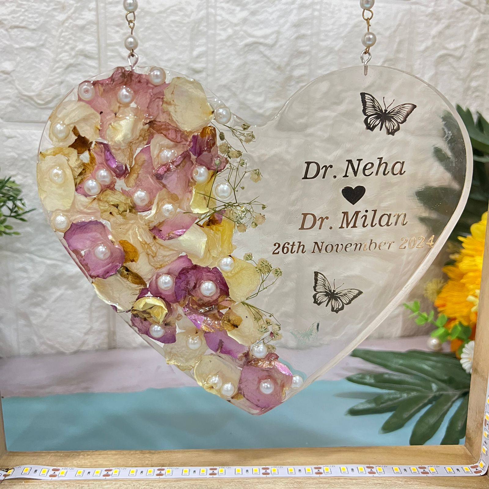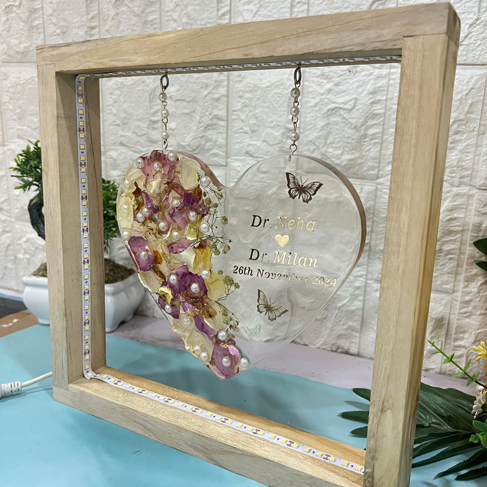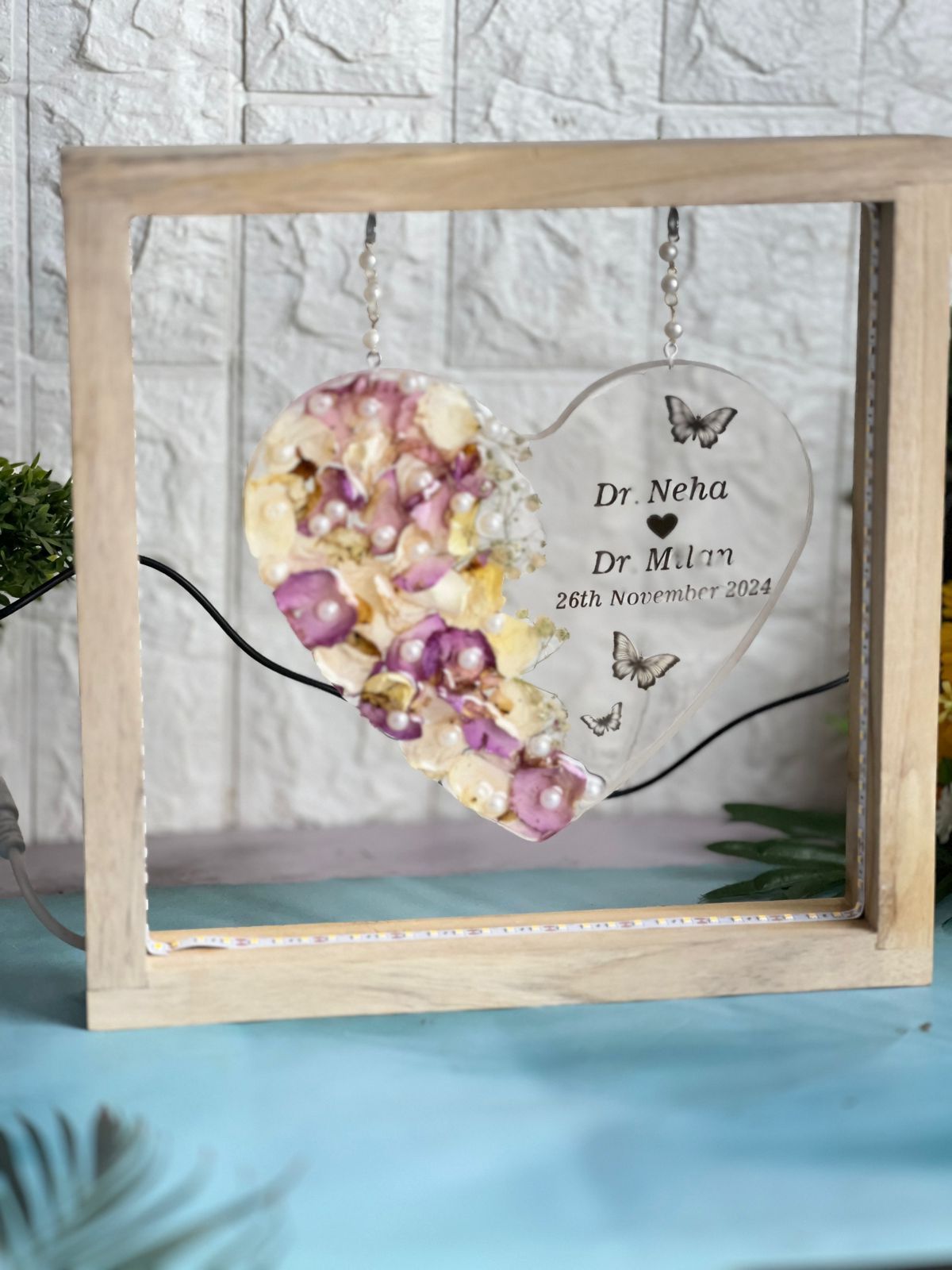 "Celebrate your everlasting love with this stunning heart-shaped deep-casting frame that beautifully preserves your wedding flowers and white pearls in premium resin. The frame is personalized with the couple's names and wedding date, making it a unique and sentimental piece. What sets this frame apart is that it’s mounted on a  teakwood LED frame, designed to hang elegantly with a chain, allowing you to display it in a truly eye-catching way. You can also preserve your wedding flowers or any other cherished memories in resin with our specialized services. We offer pickup and drop-off services across India, ensuring your keepsakes are safely transported and preserved."