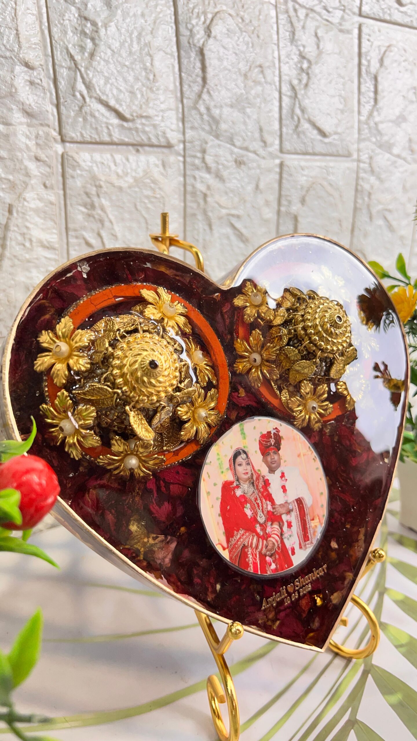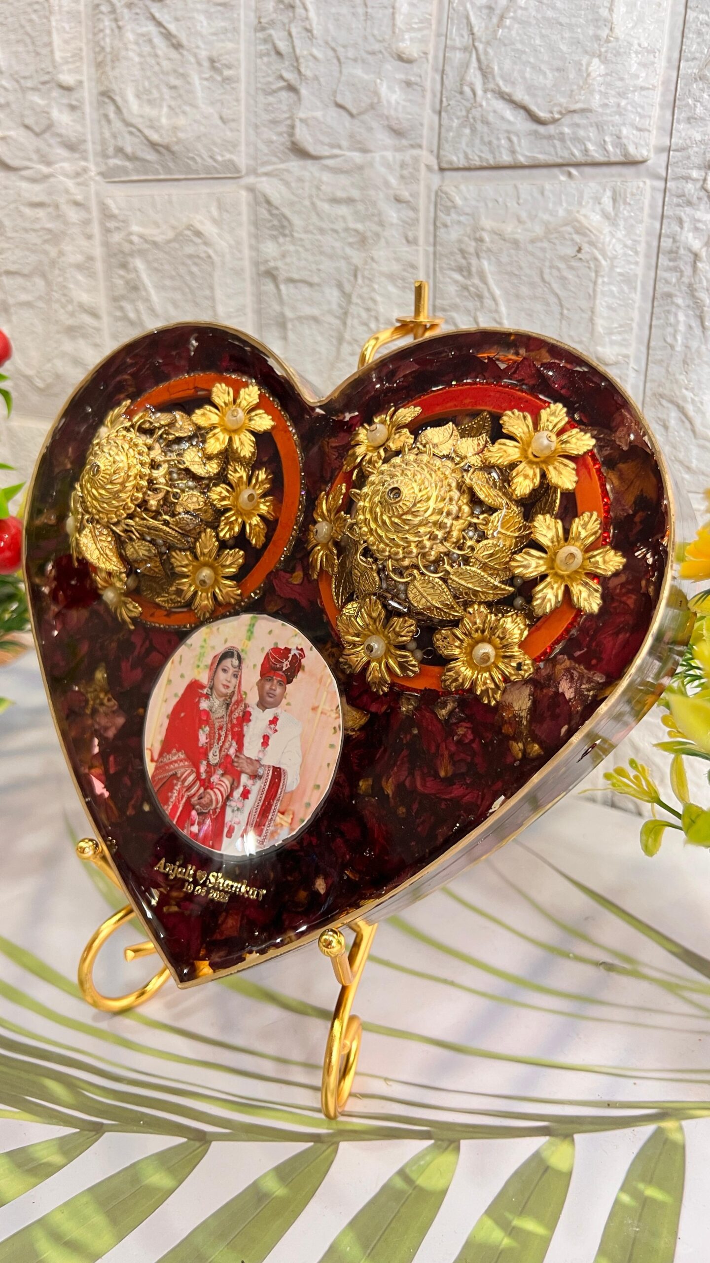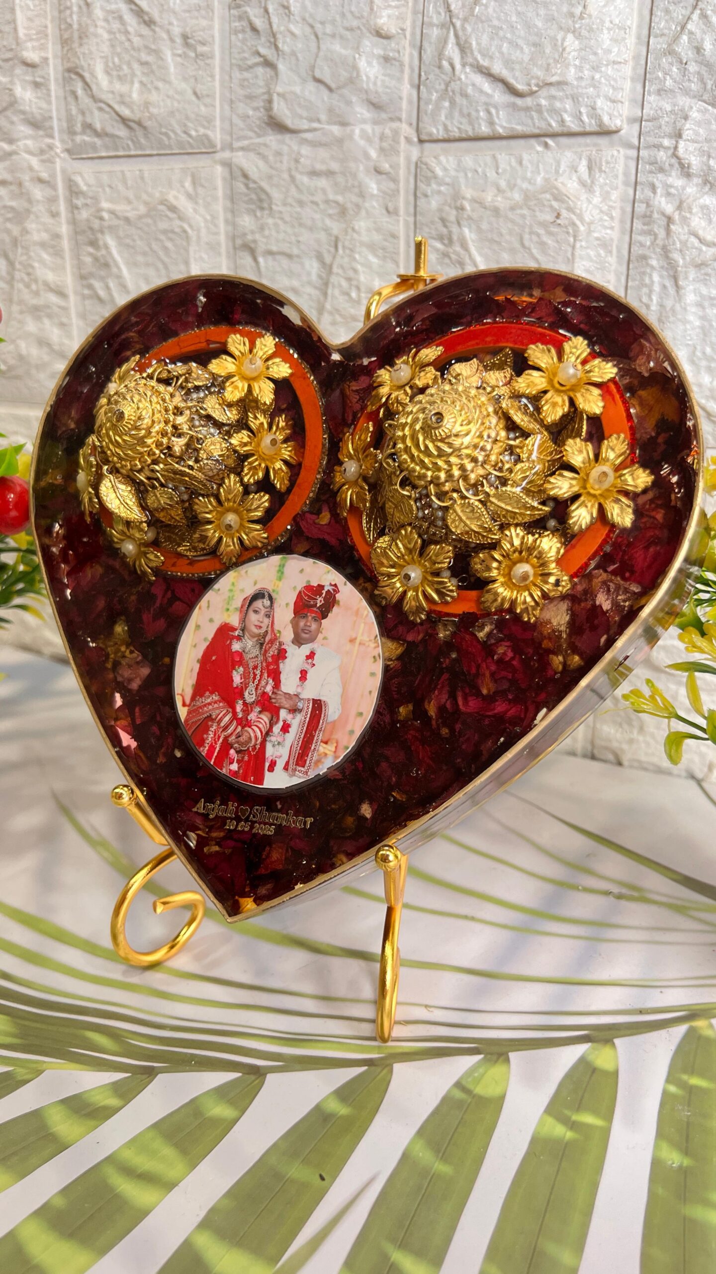 This beautiful heart-shaped resin frame is a perfect memory keeper of your special wedding day. It holds real varmala flowers, traditional wedding jewellery, and a printed photo of the couple – all sealed inside a premium-quality resin heart. Each item is preserved with love to keep your wedding memory fresh forever. The golden floral design around the varmala makes it more eye-catching and royal. It comes with a sturdy golden stand so you can proudly place it anywhere at home.