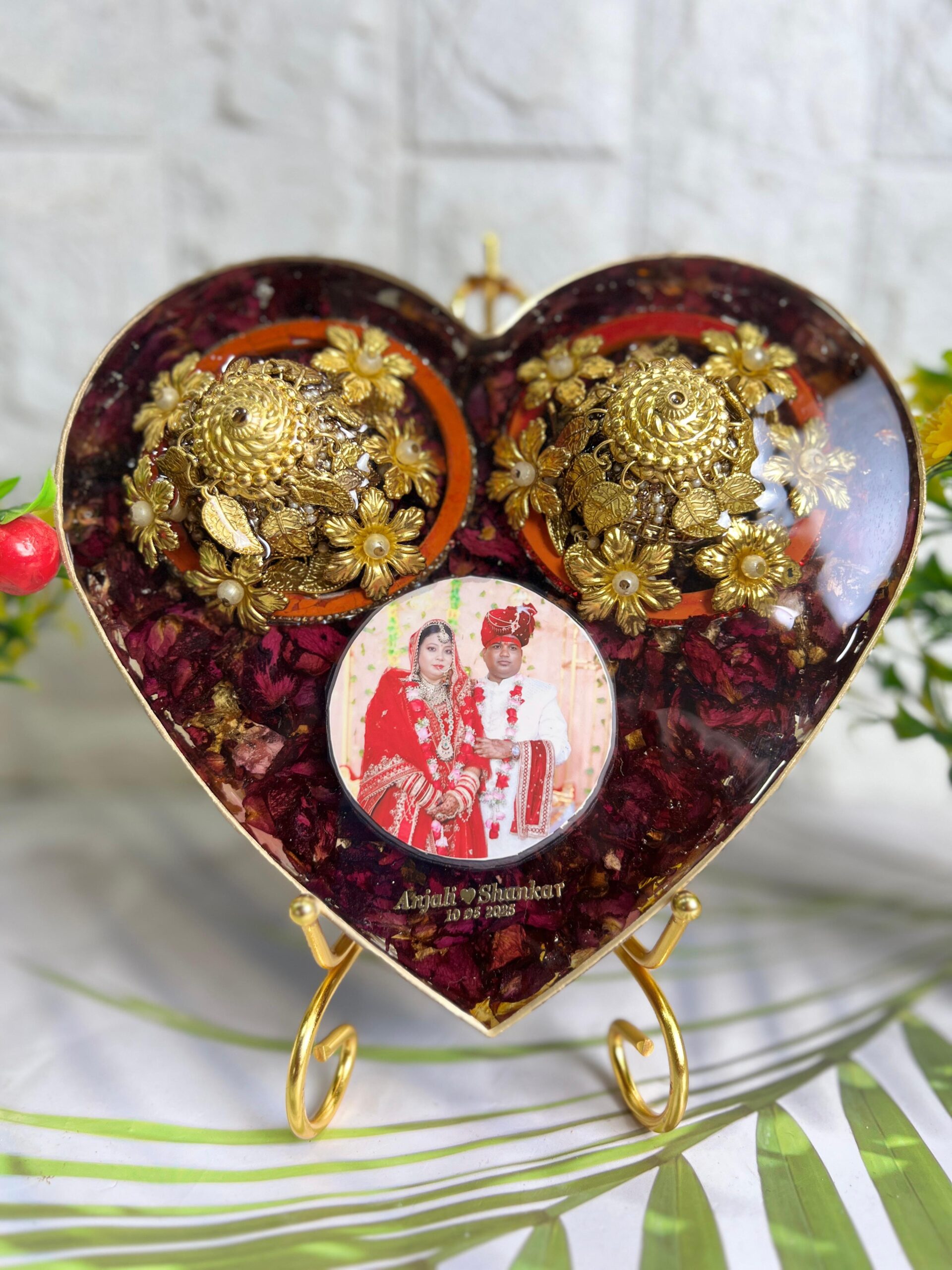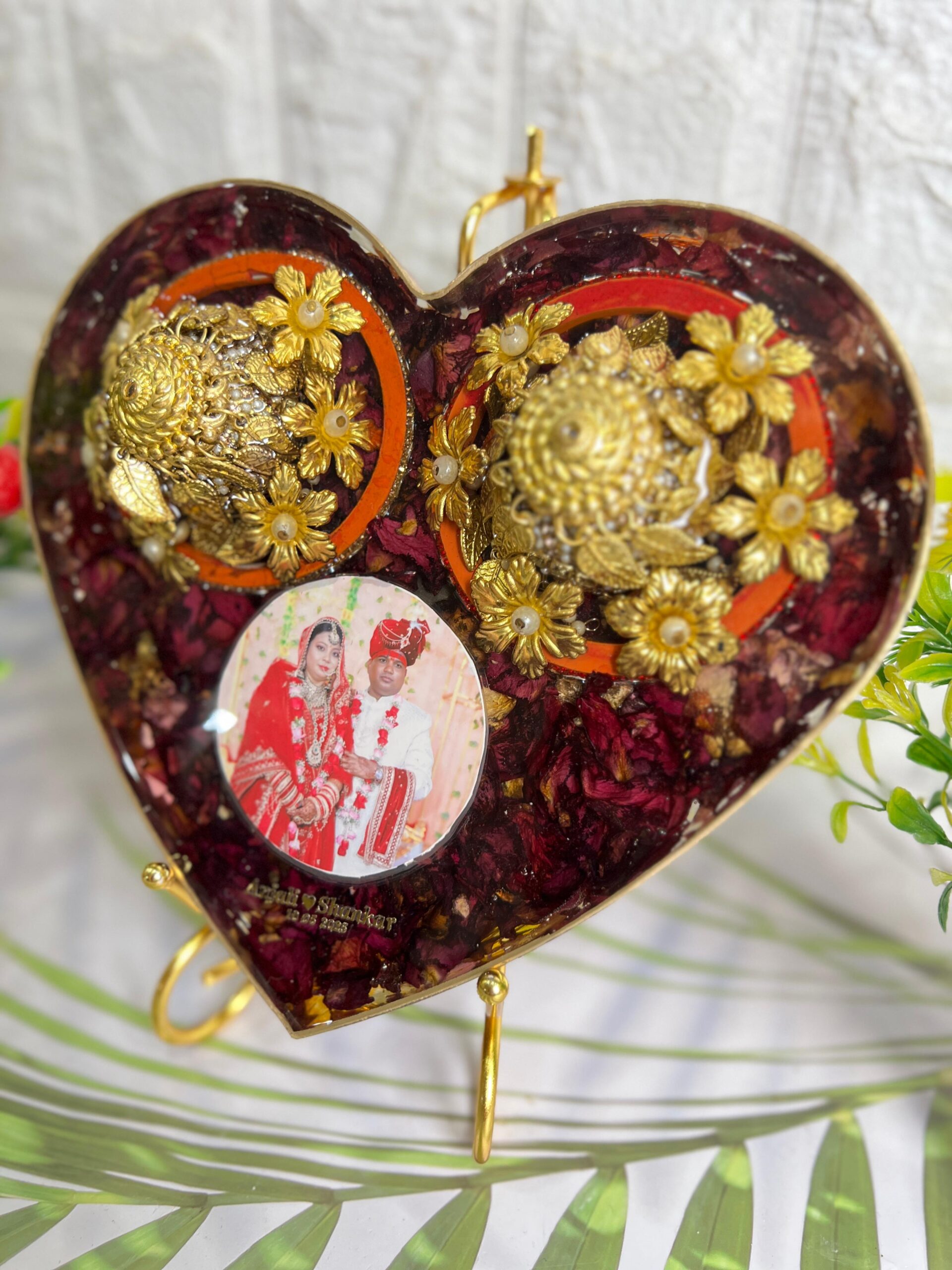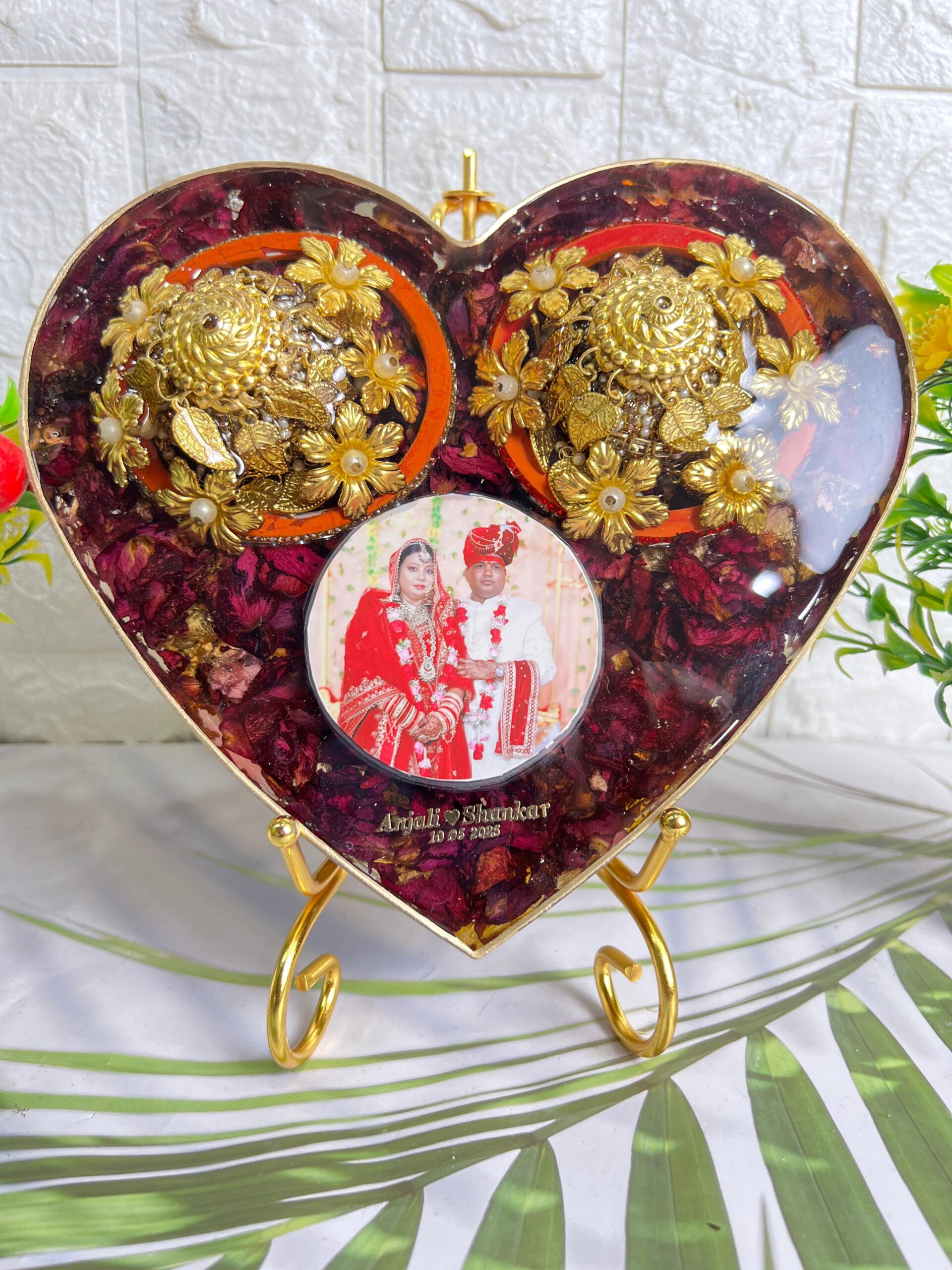 This beautiful heart-shaped resin frame is a perfect memory keeper of your special wedding day. It holds real varmala flowers, traditional wedding jewellery, and a printed photo of the couple – all sealed inside a premium-quality resin heart. Each item is preserved with love to keep your wedding memory fresh forever. The golden floral design around the varmala makes it more eye-catching and royal. It comes with a sturdy golden stand so you can proudly place it anywhere at home.