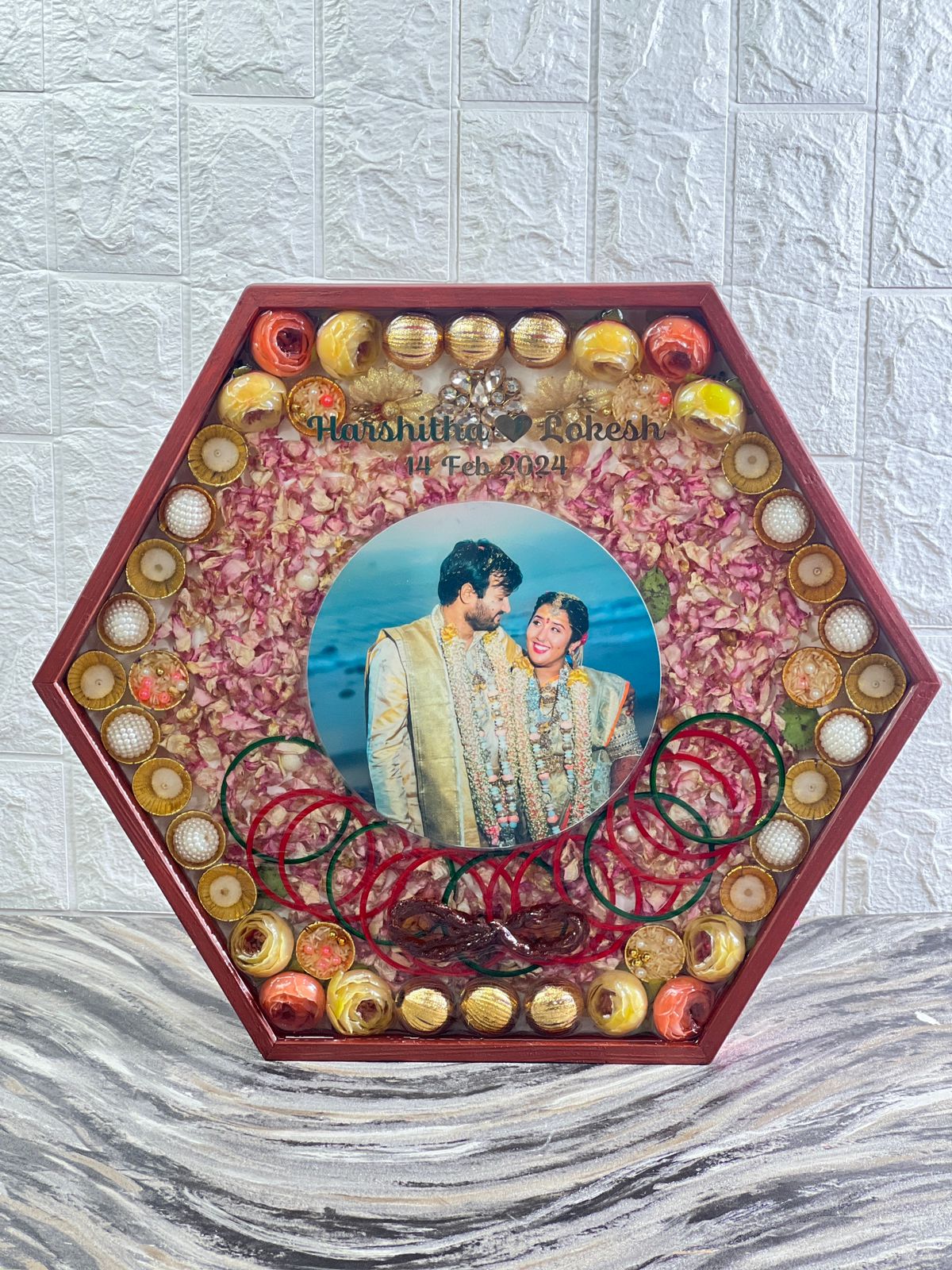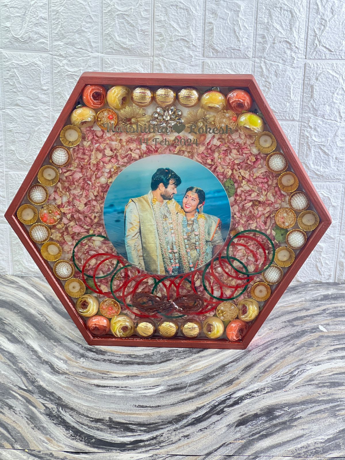 Product Description: This large 16-inch hexagon-shaped teak wood frame is an exquisite way to preserve your wedding memories. Featuring preserved pink petals, wedding bangles, and your cherished wedding photo, it’s a perfect representation of the beautiful memories created on your special day. The frame is also illuminated by an LED light, which adds a soft and warm glow to the preserved elements. The personalization of your names and wedding date makes this frame a one-of-a-kind keepsake. Features: