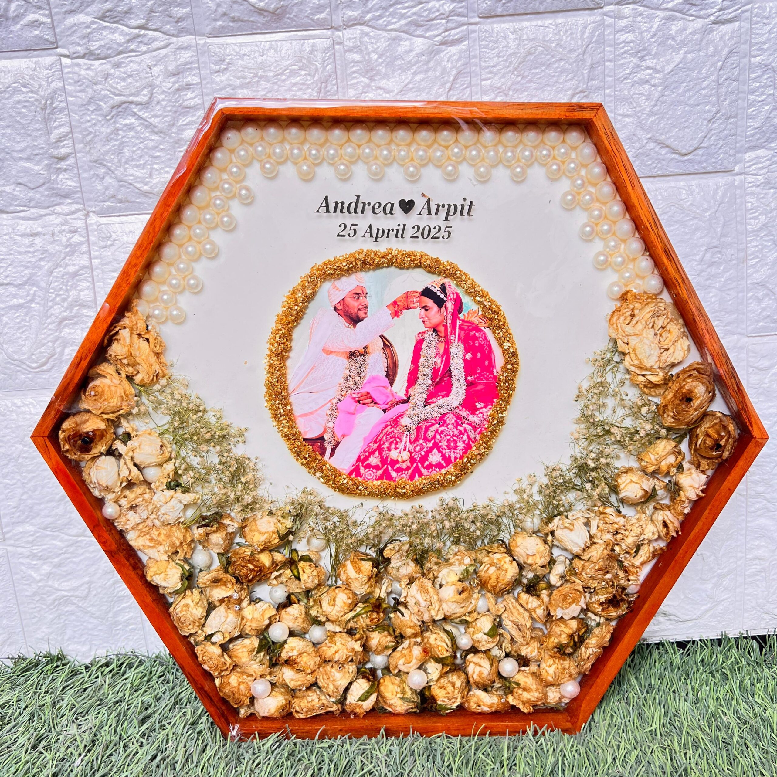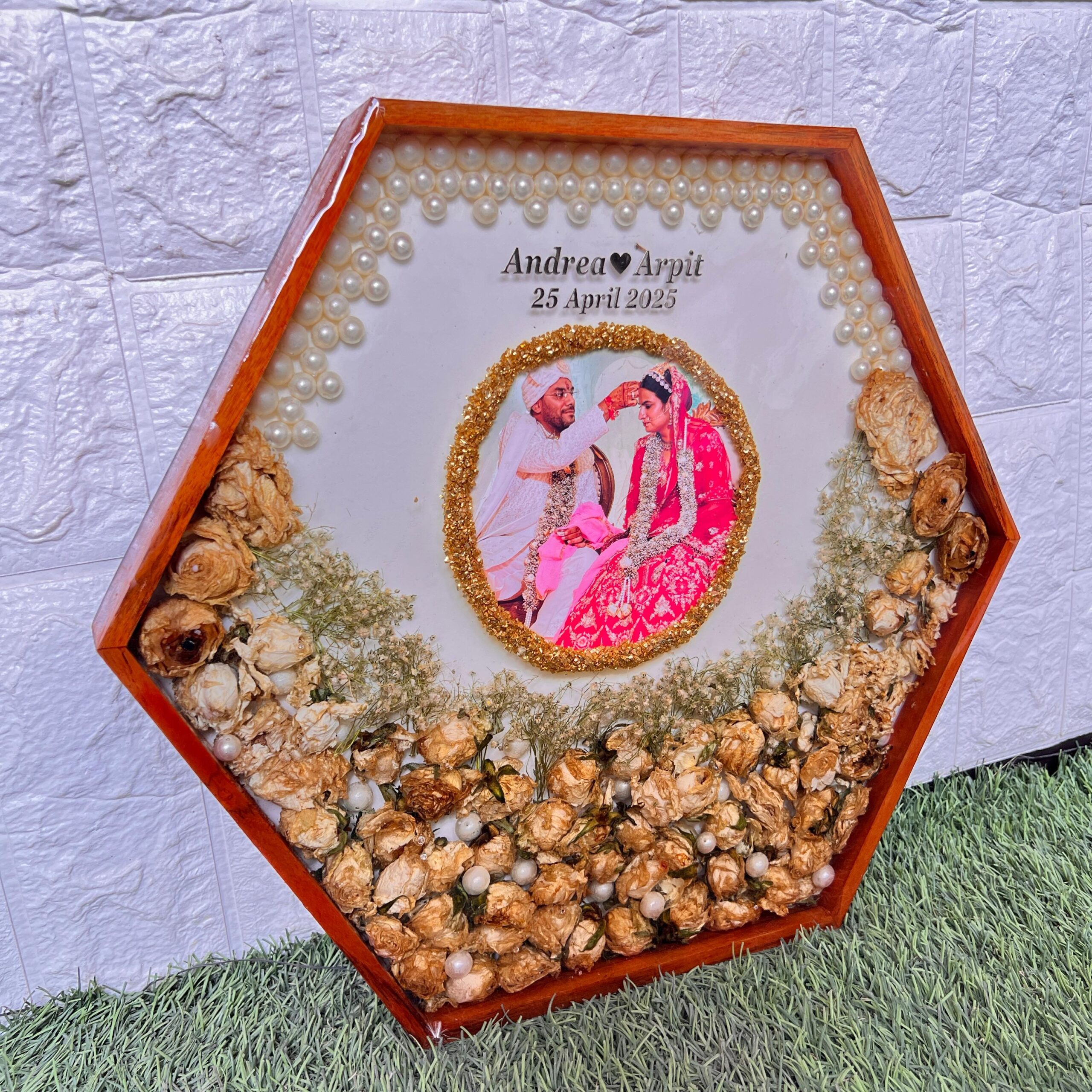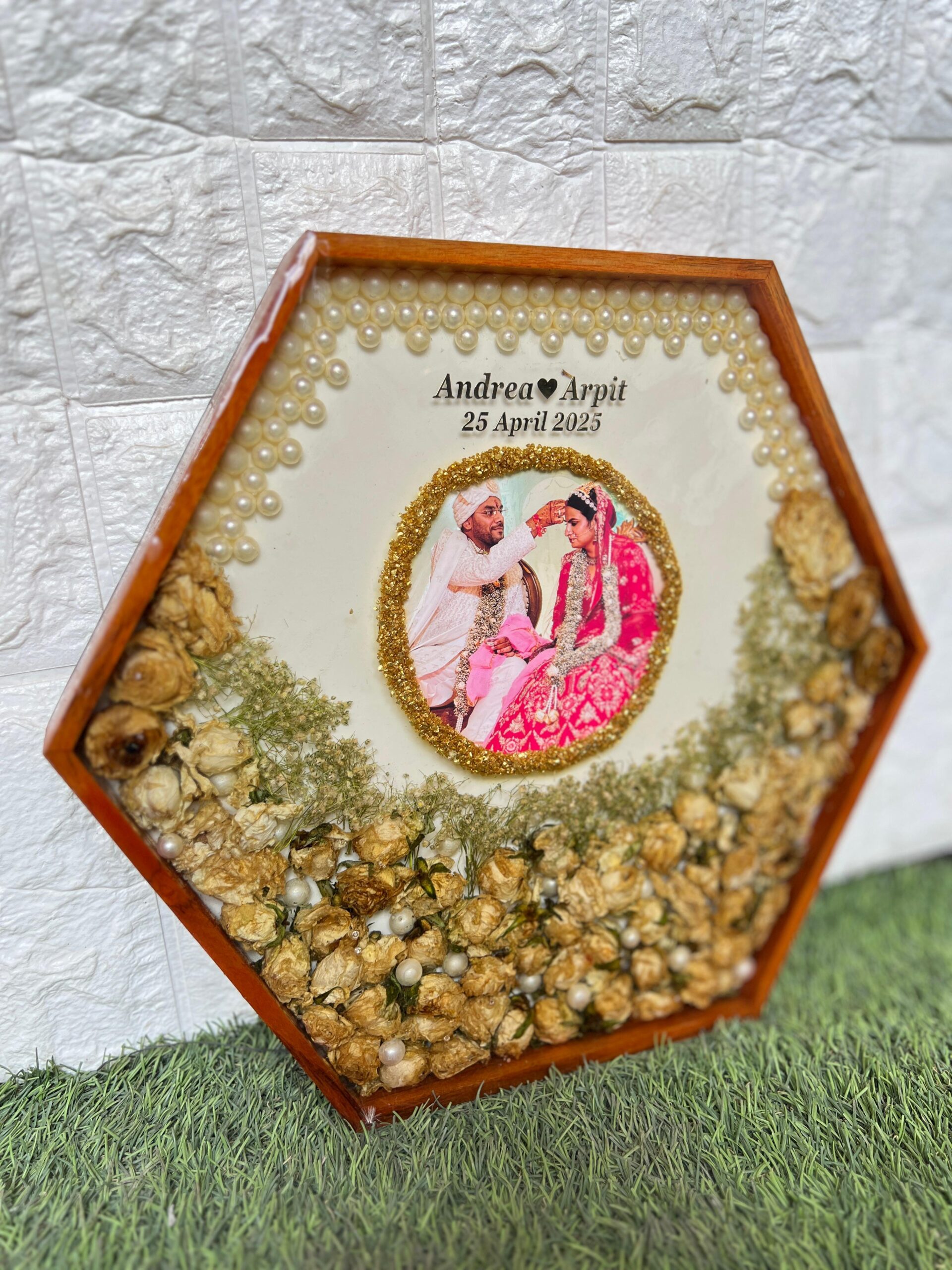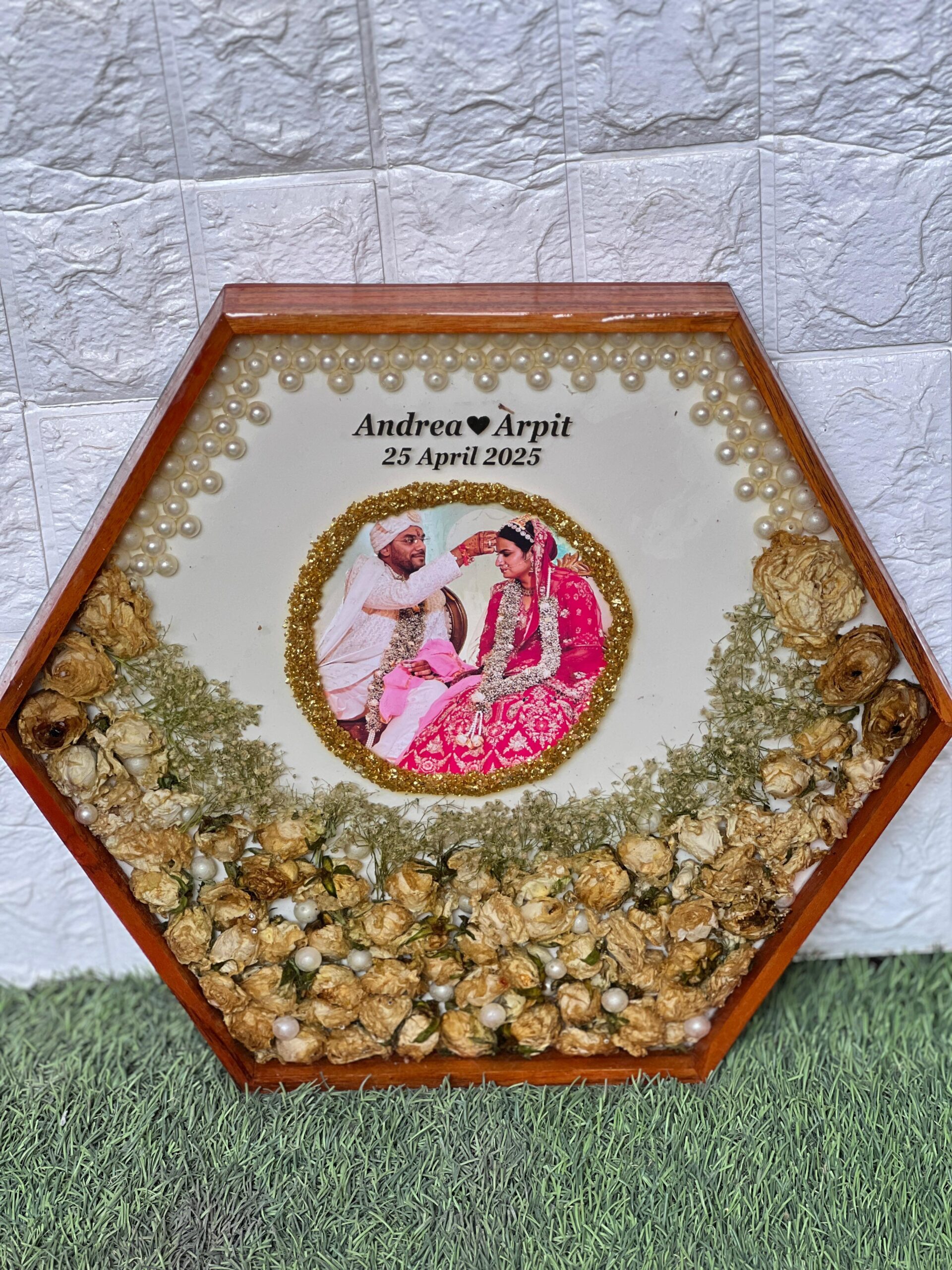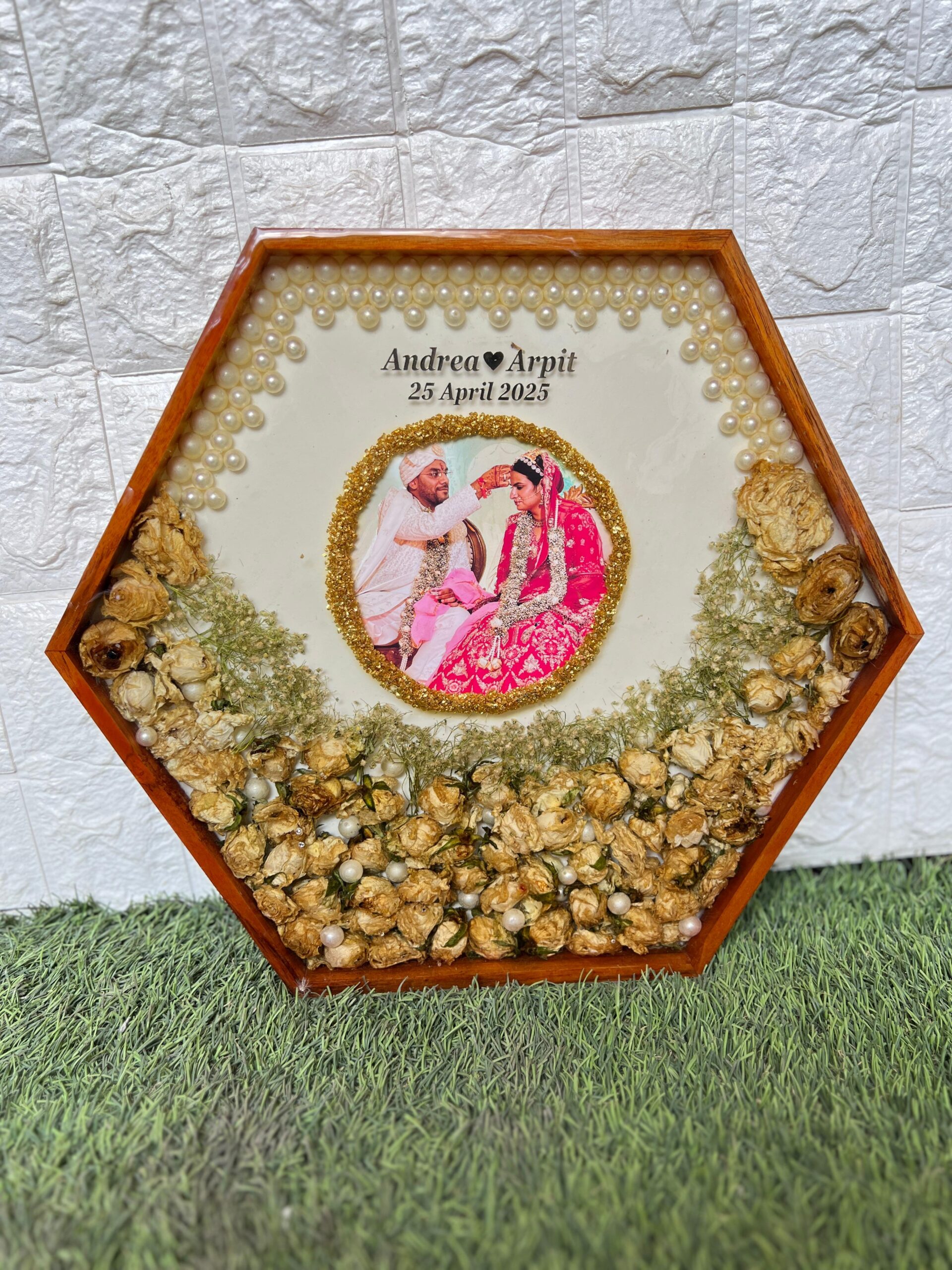 This unique ( ) inch hexagon teakwood frame is filled with your real wedding garland flowers. The photo is set beautifully in the center with a circle of golden touch. White pearls decorate the top and soft baby’s breath fills the corners. It is handmade with love and sealed in strong resin to keep your wedding memory fresh forever. The names and date make it fully personal. It’s a one-of-a-kind piece that brings your wedding day back to life.