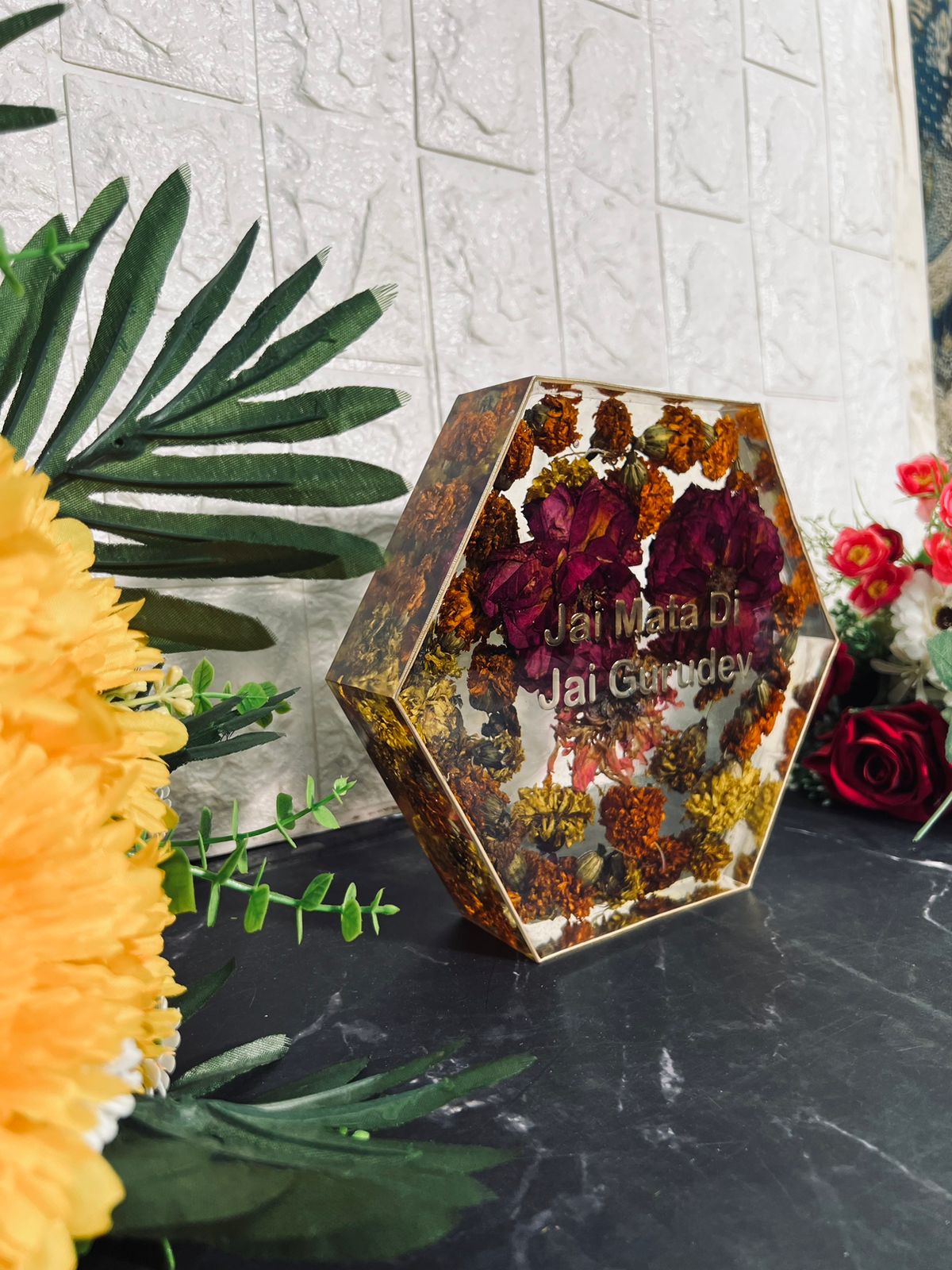 Product Description: This hexagonal deep casting resin frame beautifully preserves the marigold flowers from Durga Mata's temple and red roses blessed by Gurudev. The flowers are carefully preserved in resin, ensuring their vibrant colors and sacred beauty remain intact for years. The frame is elegantly designed with the "Jai Mata Di" and "Jai Gurudev" text, making it a perfect keepsake for anyone who cherishes their spiritual connection. This frame is a beautiful way to hold onto blessings and memories from a sacred occasion. Customization Options:
