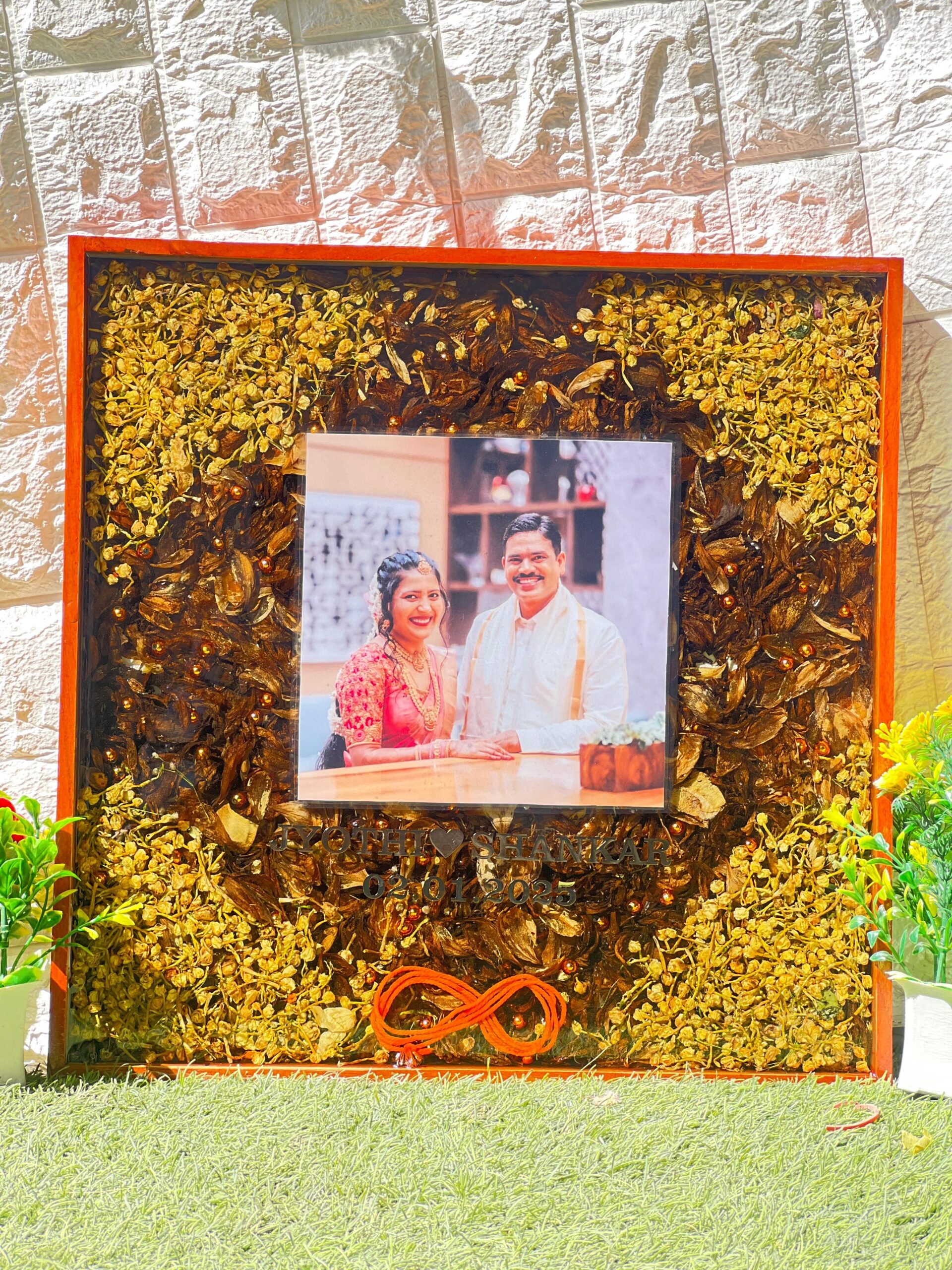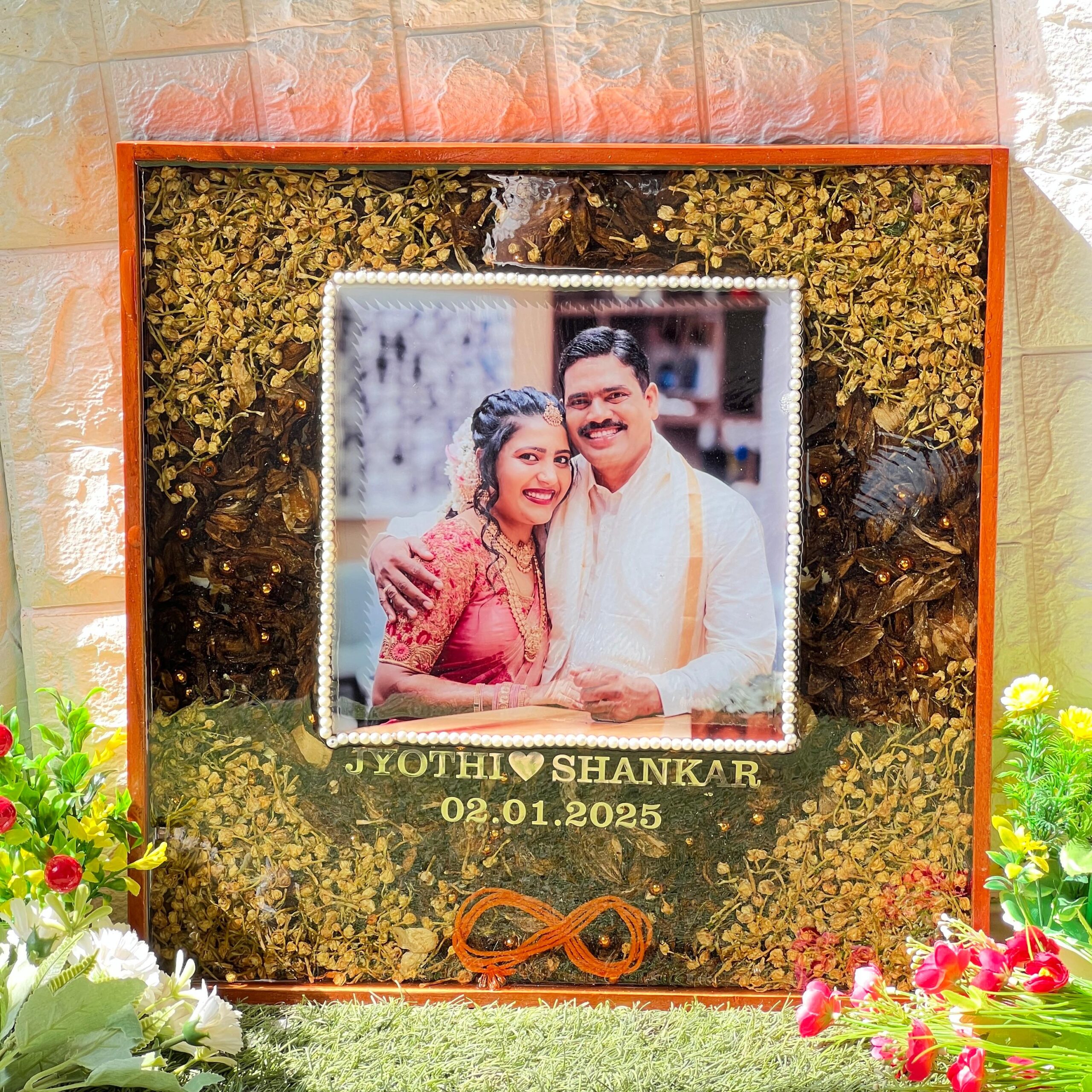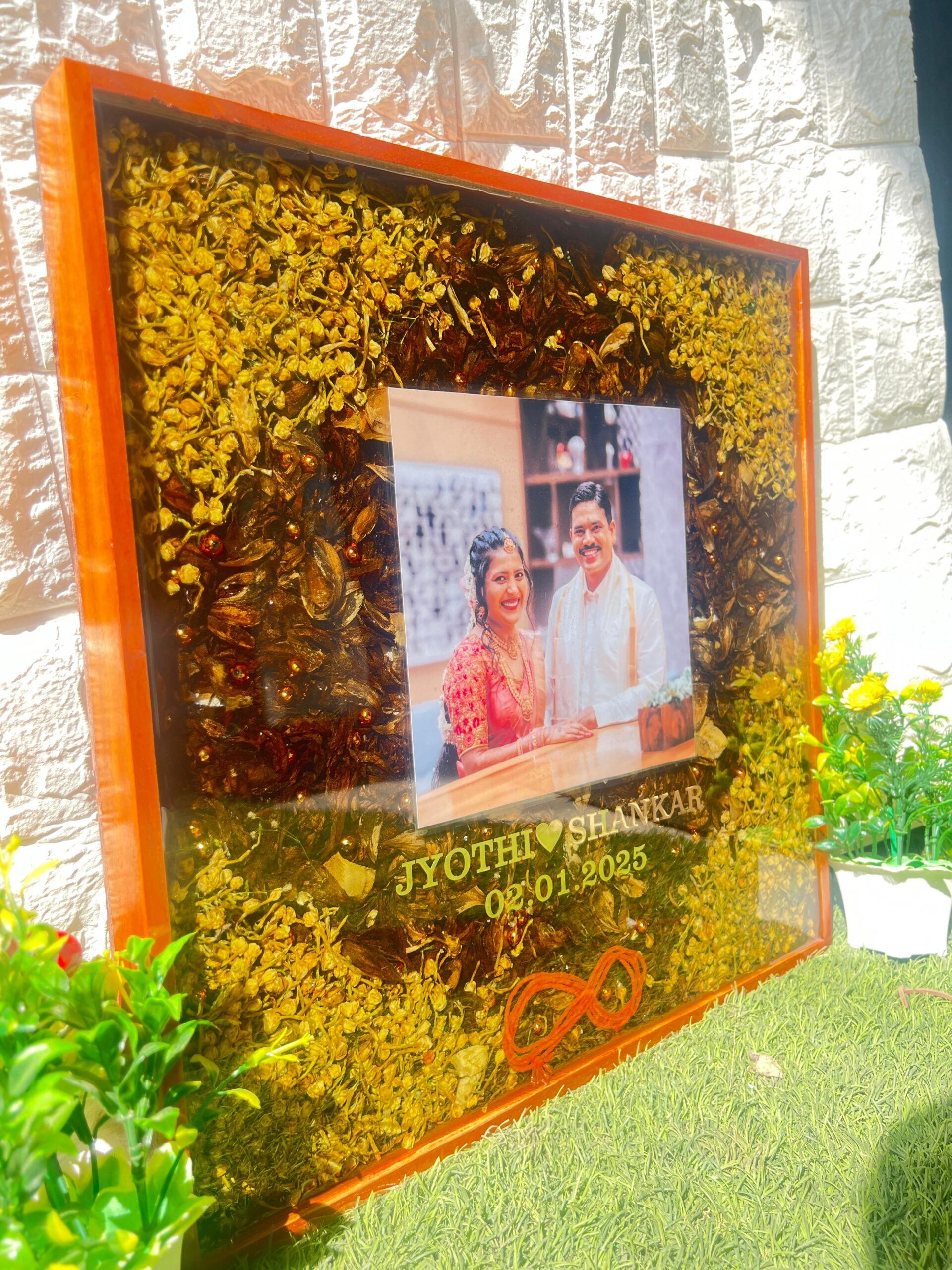 This Custom Resin Wedding Photo Frame is a beautiful memory piece for couples. It is made in a rectangular shape with a wooden frame. Inside the frame, your wedding photo is placed along with real varmala flowers, a kalawa thread in infinity shape, and baby’s breath flowers around the edges. All these are preserved safely in epoxy resin to keep your special moment alive forever.