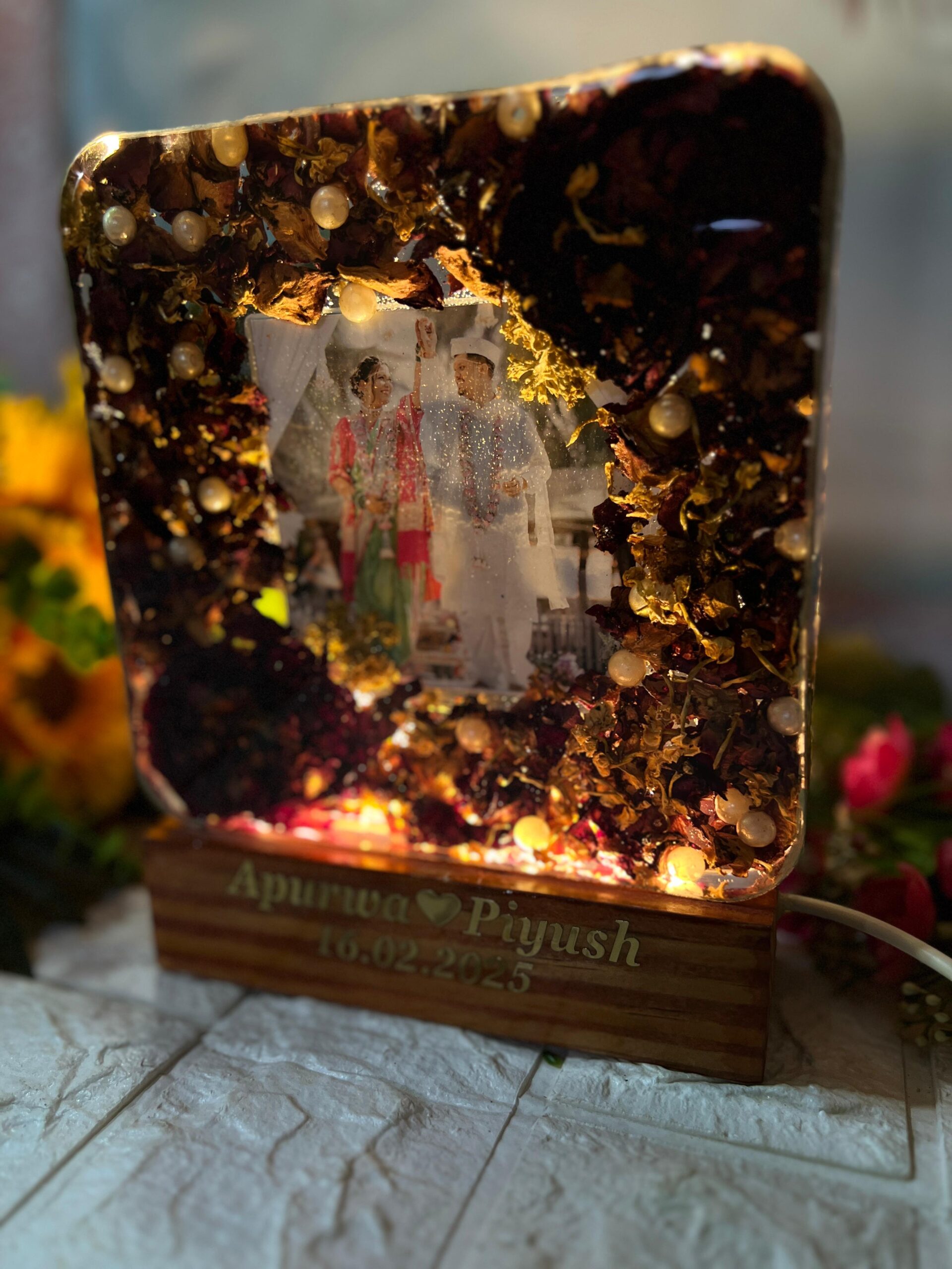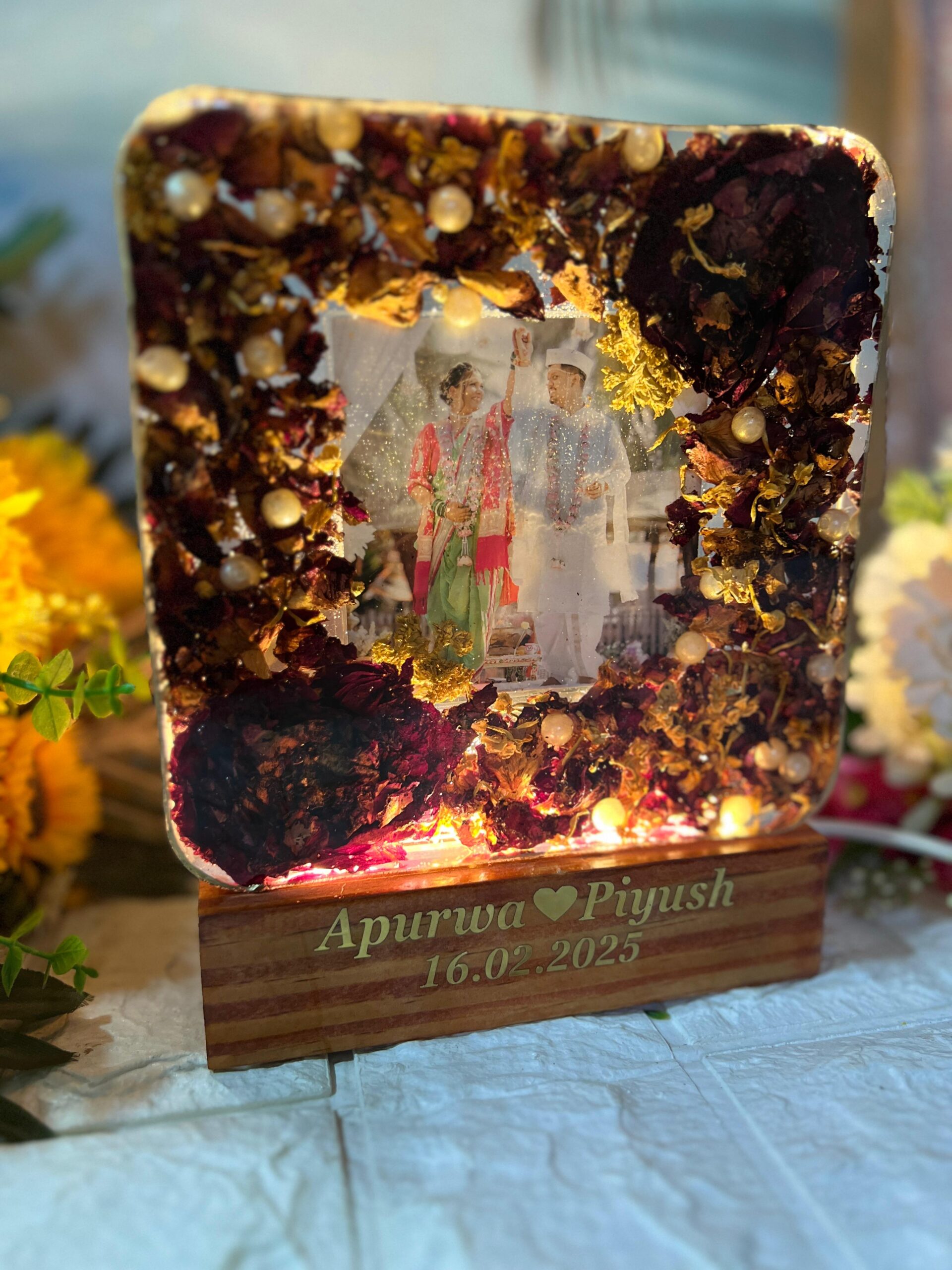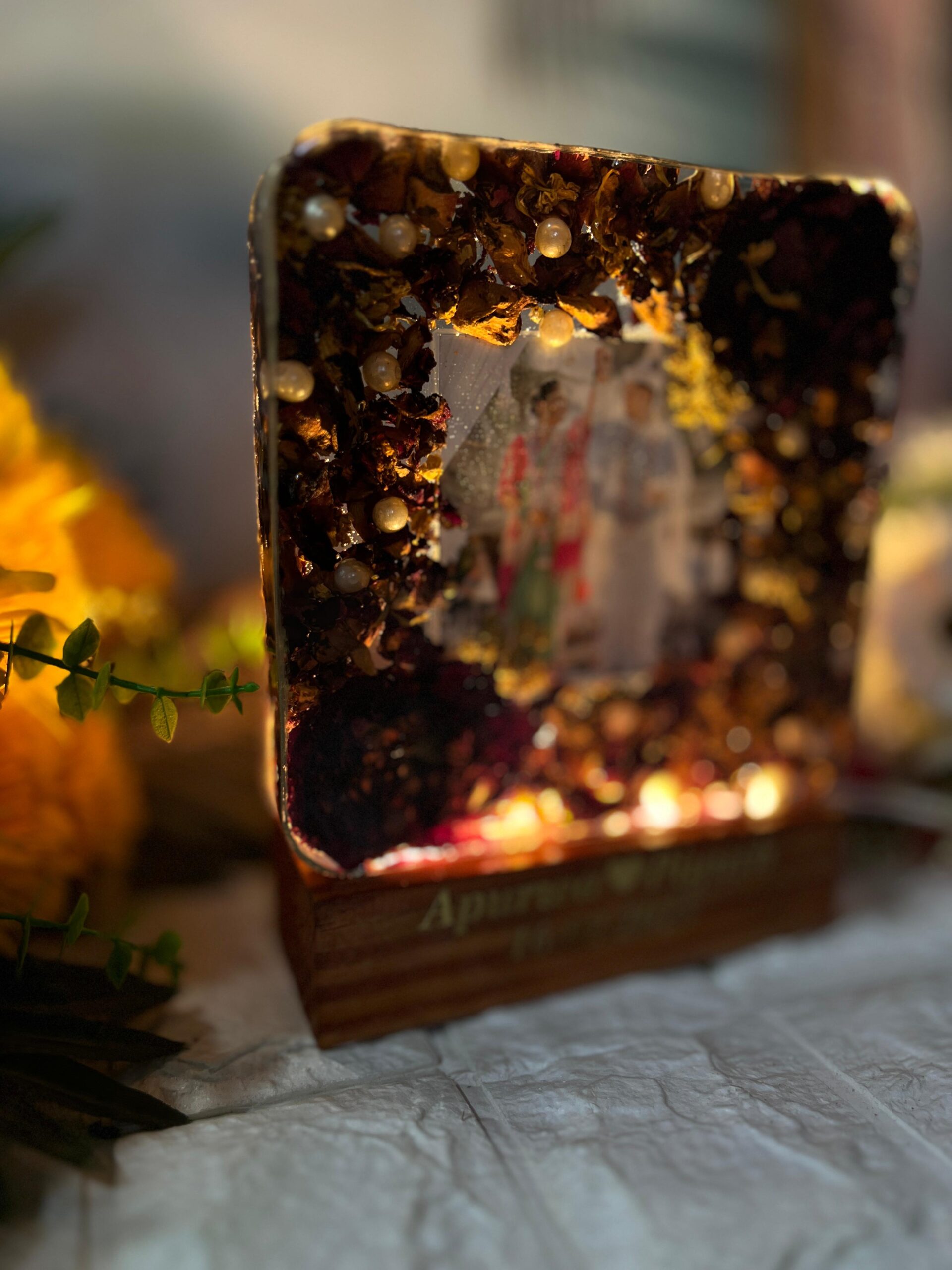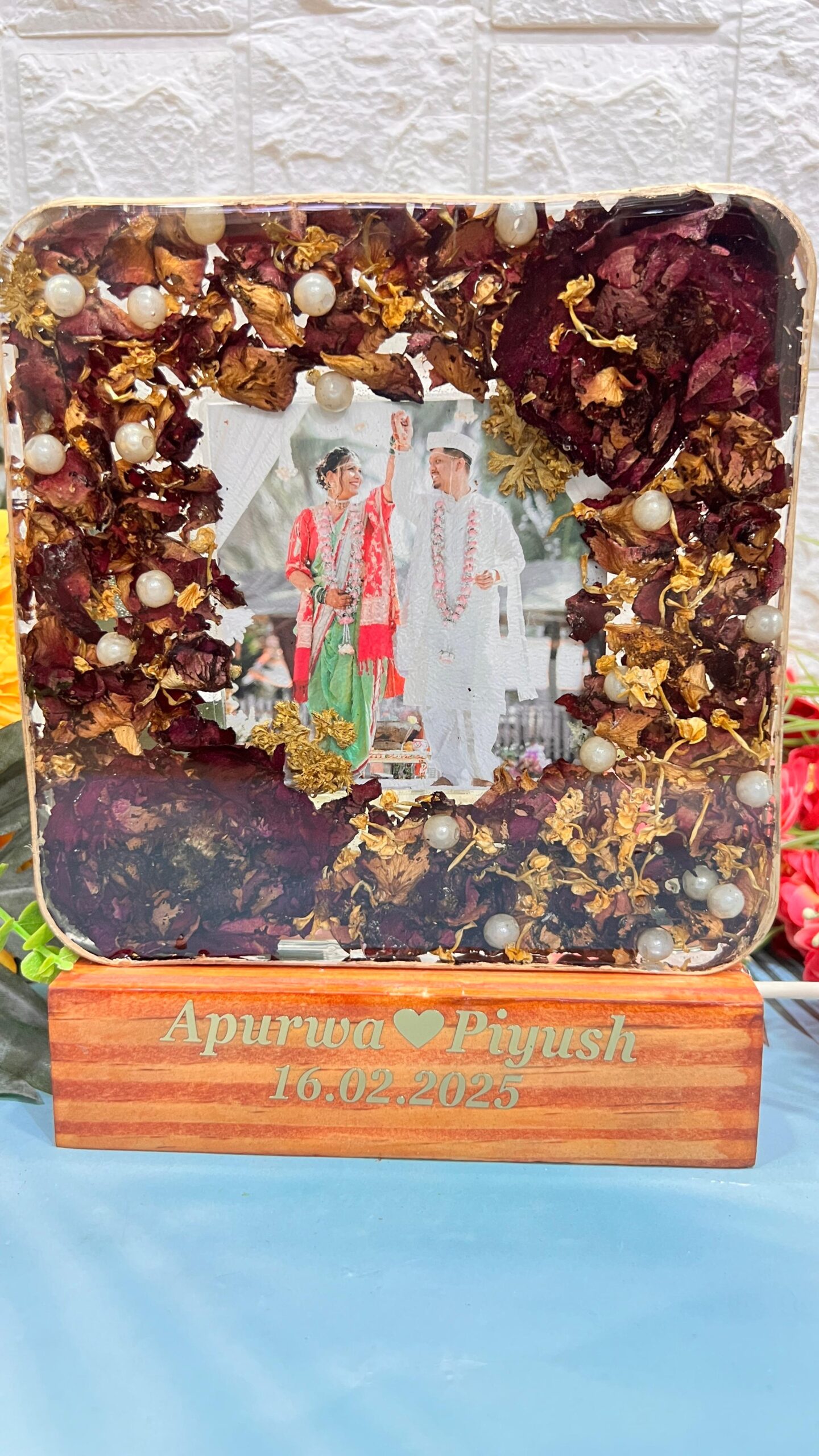 This beautiful square resin photo frame is made with your real wedding varmala flowers, pearls, and your favorite wedding photo, all preserved forever. The flowers and pearls are set in crystal-clear epoxy resin, which keeps them fresh and glowing for years. The frame has a wooden base engraved with your names and wedding date, making it truly personal and special. Warm LED lights inside the frame add a magical touch, perfect for showcasing your love story.