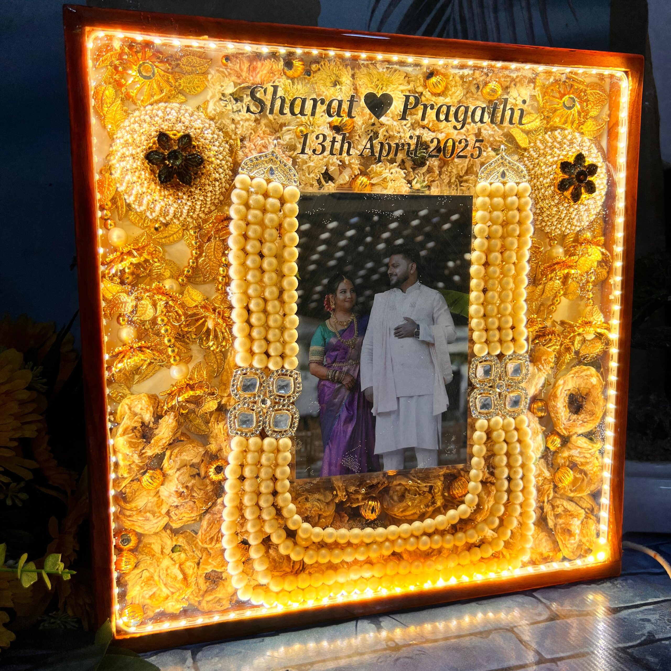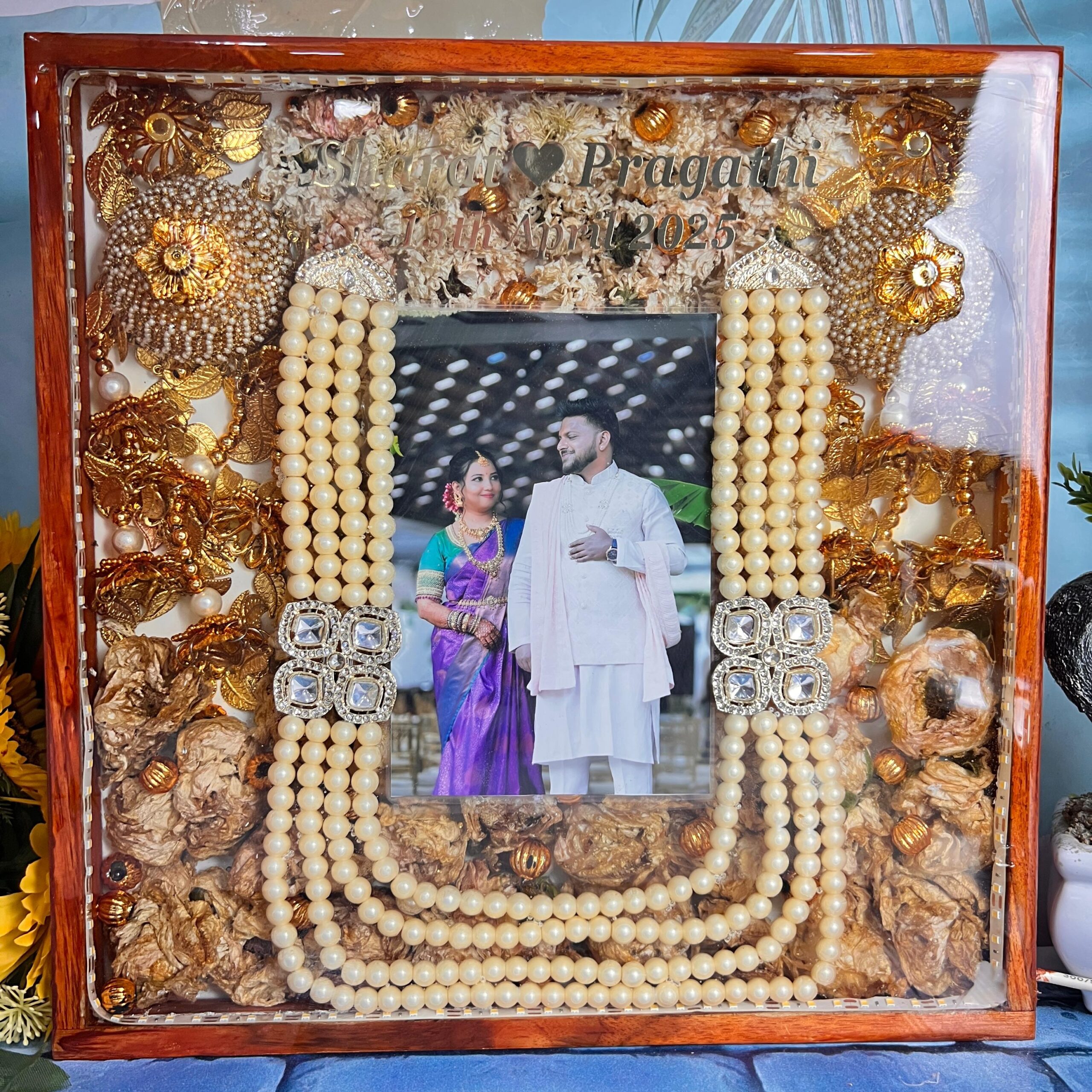 This resin frame is made to hold one of the most beautiful moments of your life—your wedding day. The centre of the frame shows your wedding photo, while the background is filled with real varmala flowers, gold elements, and a pearl-style necklace.