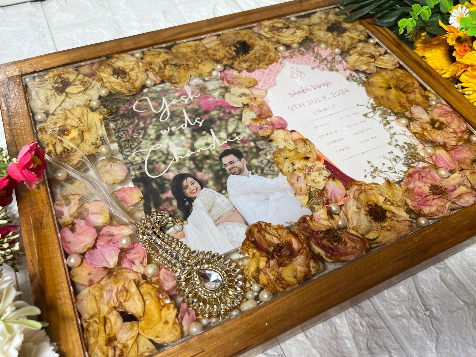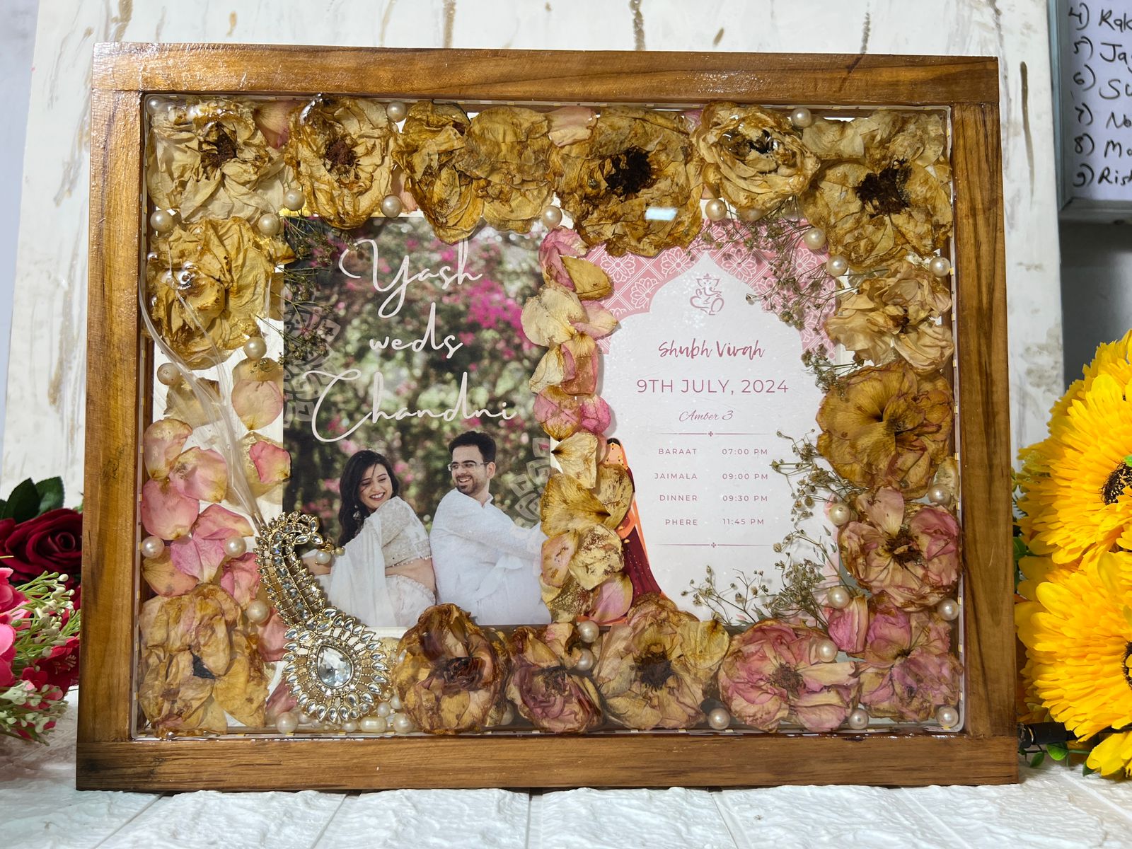Where to Place This Wooden Frame with LED, Preserved Wedding Card, Kalangi & Couple Photo