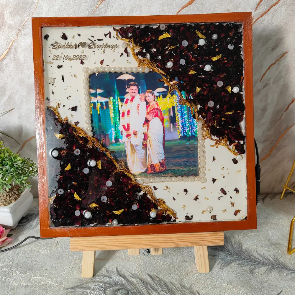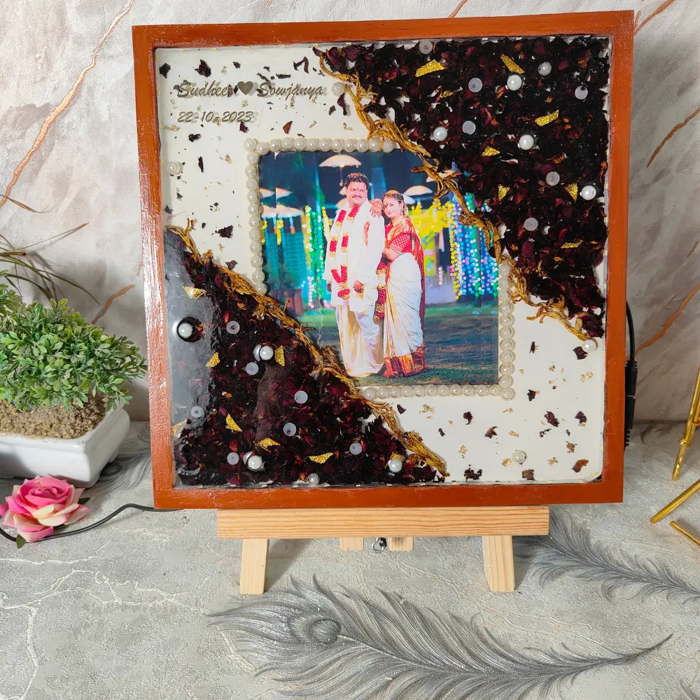 Luxurious Varmala Preserved Resin Photo Frame can be fully customized to suit your wedding theme. Choose from various