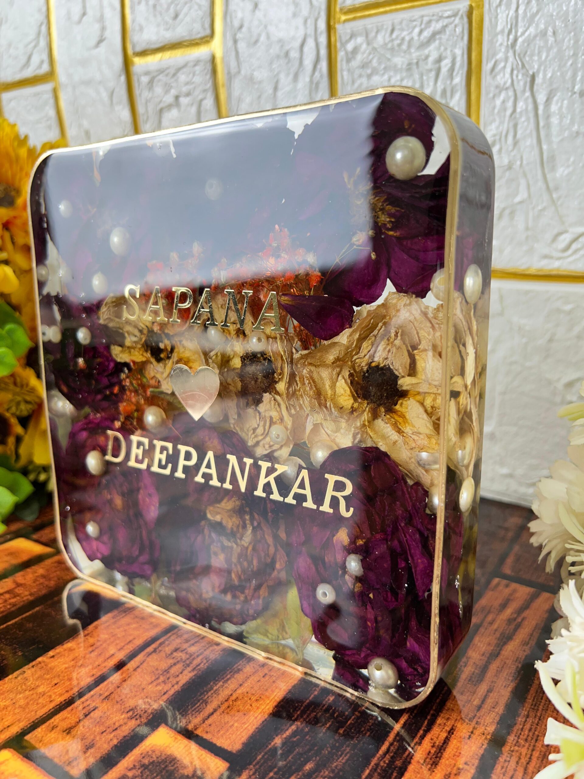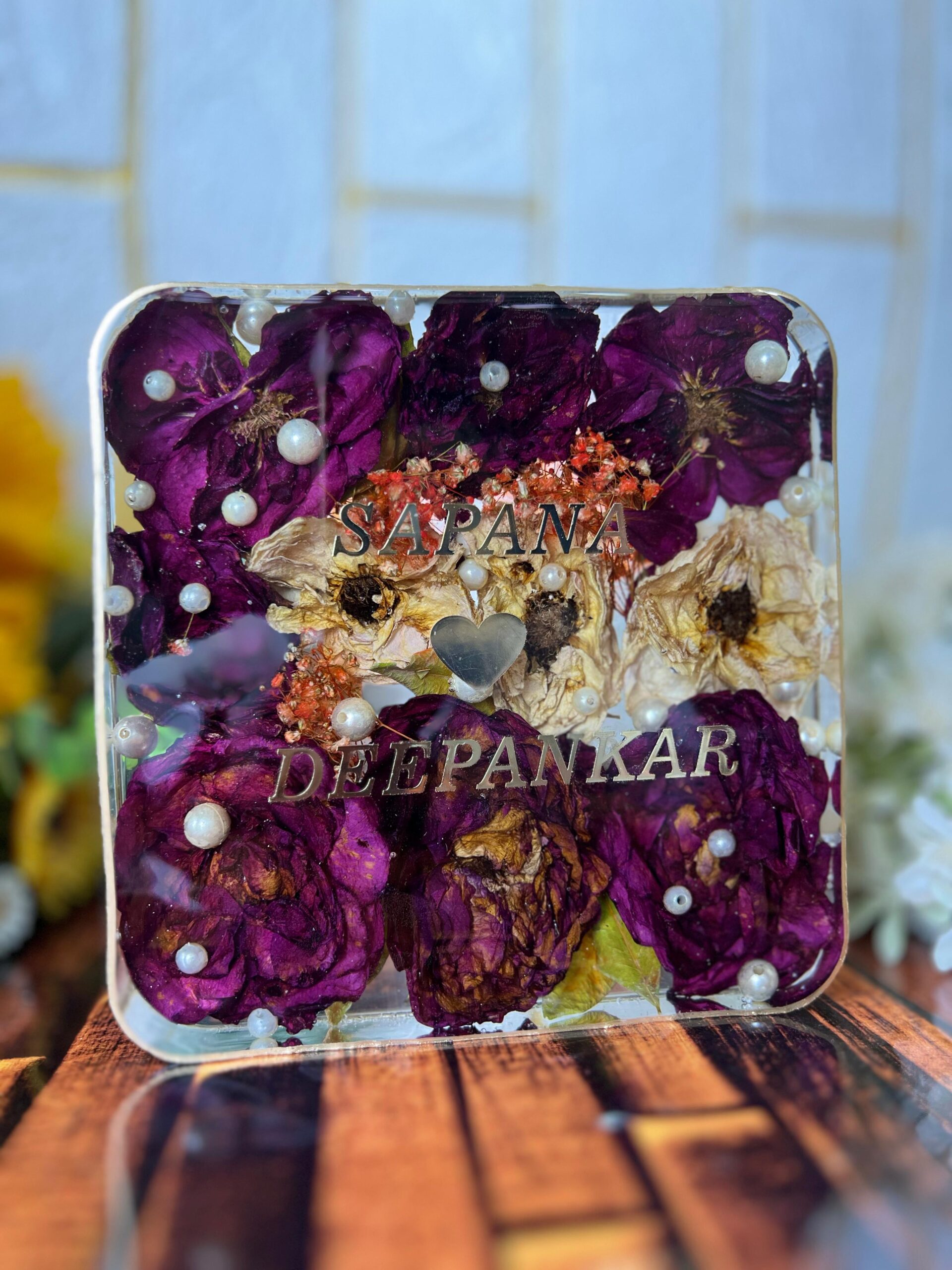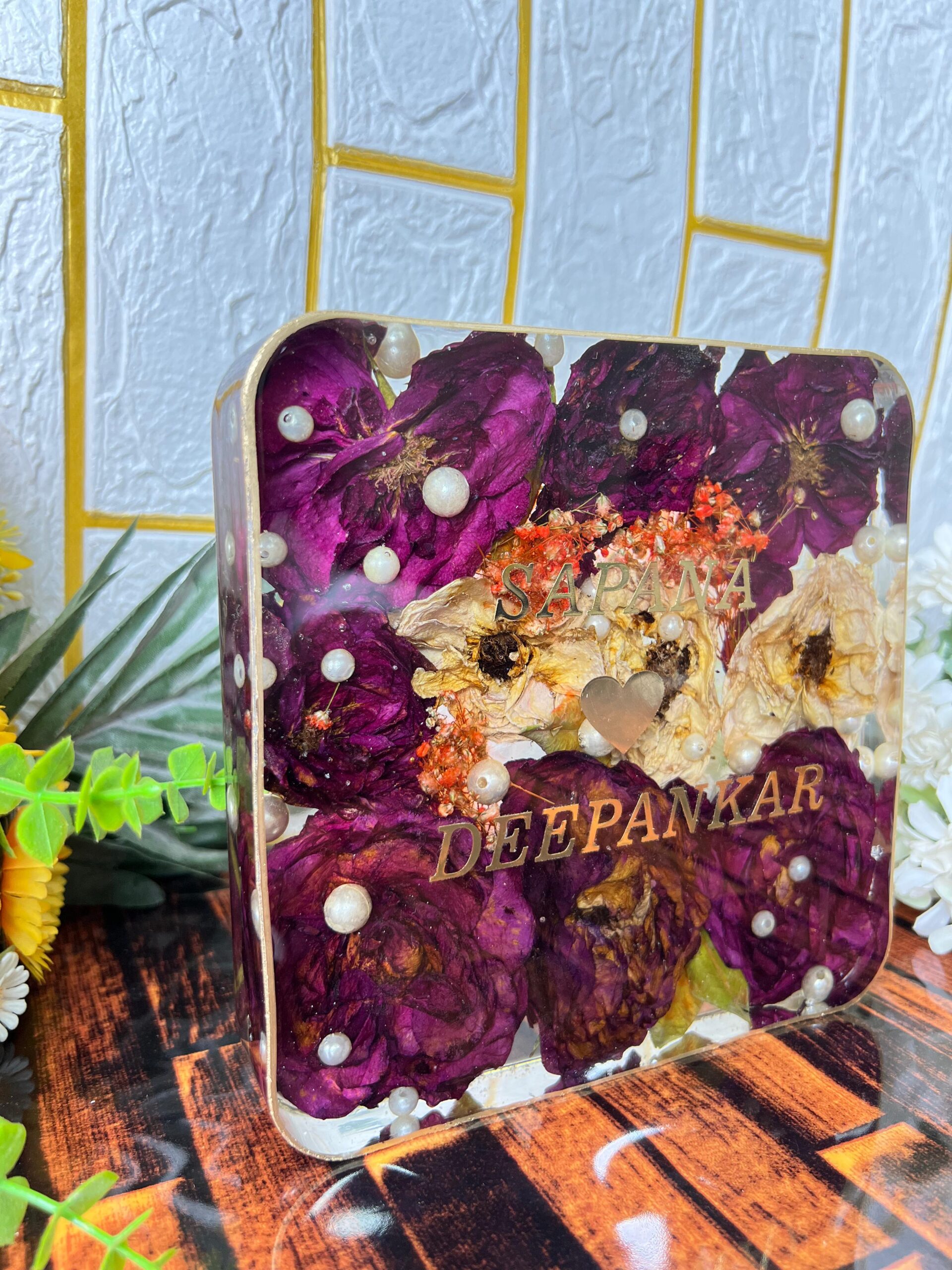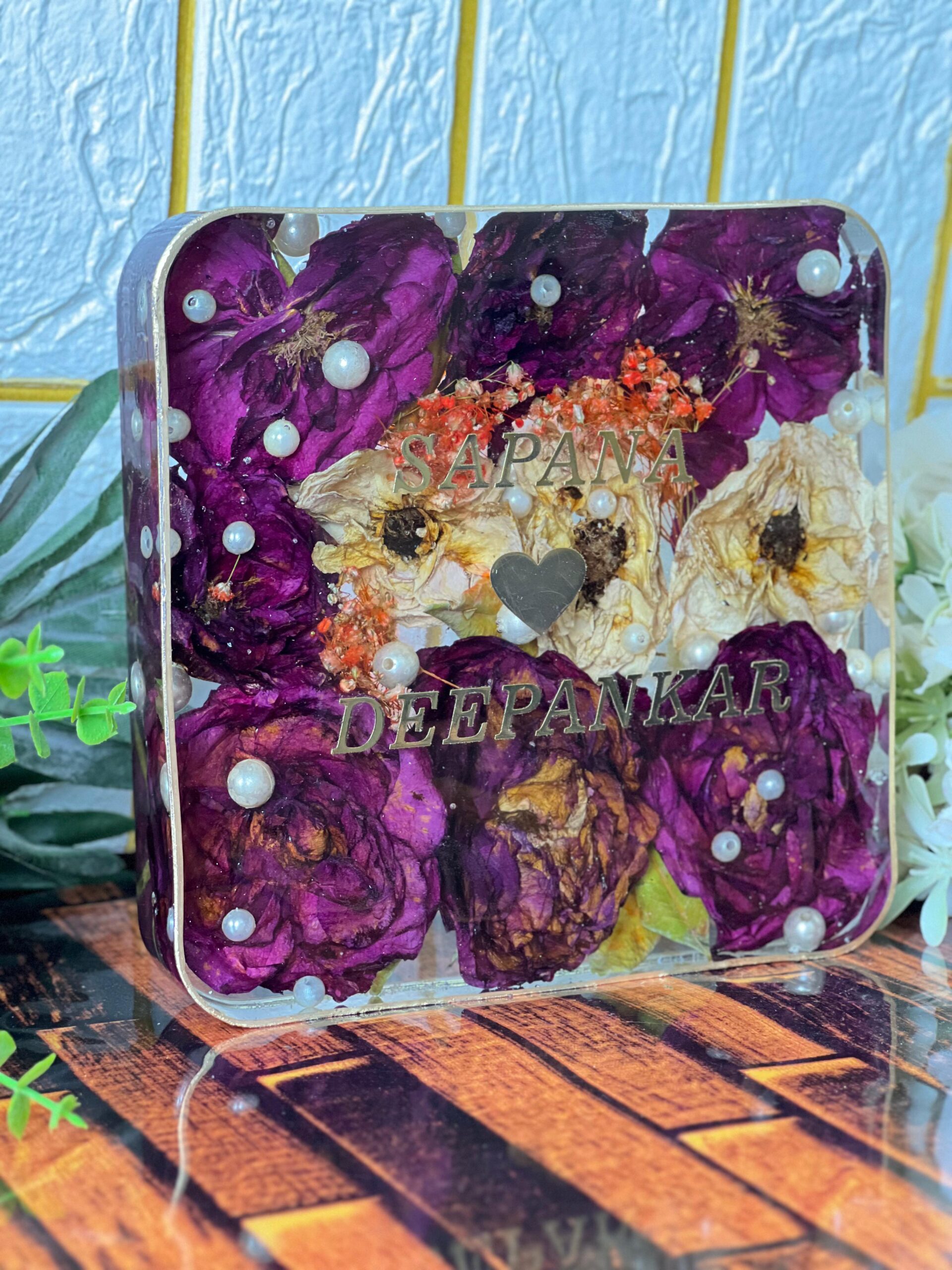 Celebrate your special day forever with this elegant square resin frame, crafted using real varmala roses and pearls. Each flower from your varmala is carefully dried and sealed in high-quality resin to keep it fresh-looking for years.