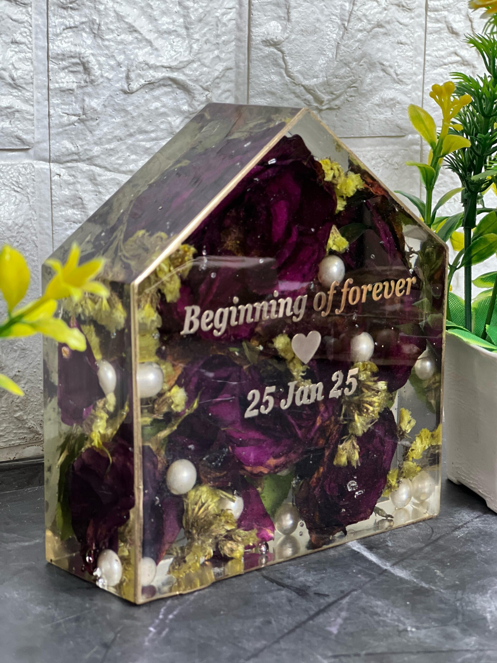 This small and cute resin piece is the perfect memory block for your special day. It holds real preserved roses and pearl beads, frozen beautifully in crystal-clear resin. The words “Beginning of forever” and your special date make it deeply personal.