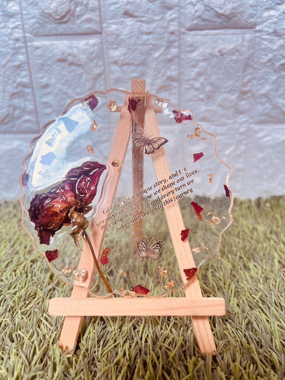 This ( )-inch round resin plate is a beautiful way to keep your special rose safe forever. The real dried rose is placed inside clear resin with golden flakes, butterflies, and a sweet printed quote. Its wavy edges and soft design give it a charming look. It comes with a mini wooden stand, so you can easily place it anywhere. This handmade item is perfect for small memories, love gifts, or even personal inspiration. It’s simple, elegant, and full of meaning.
