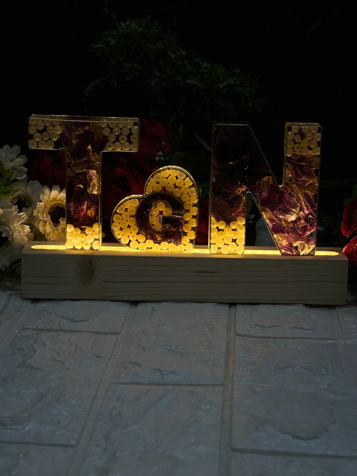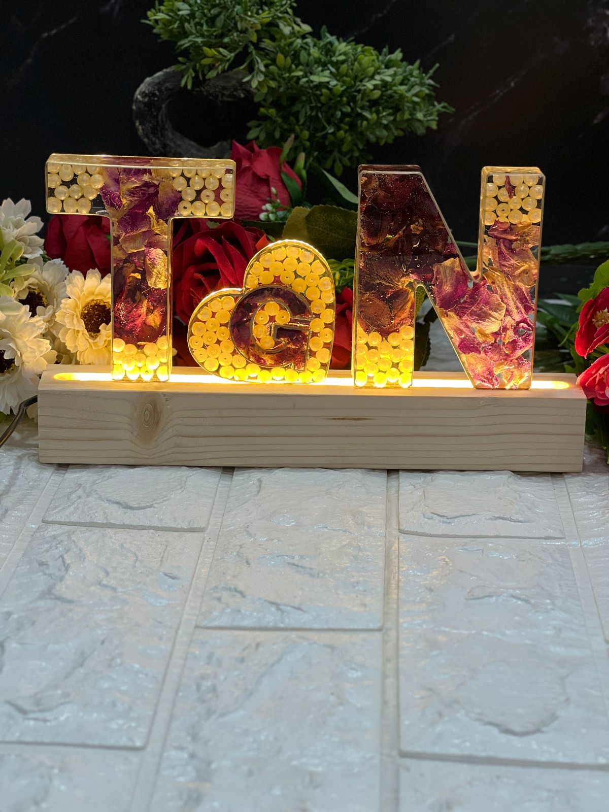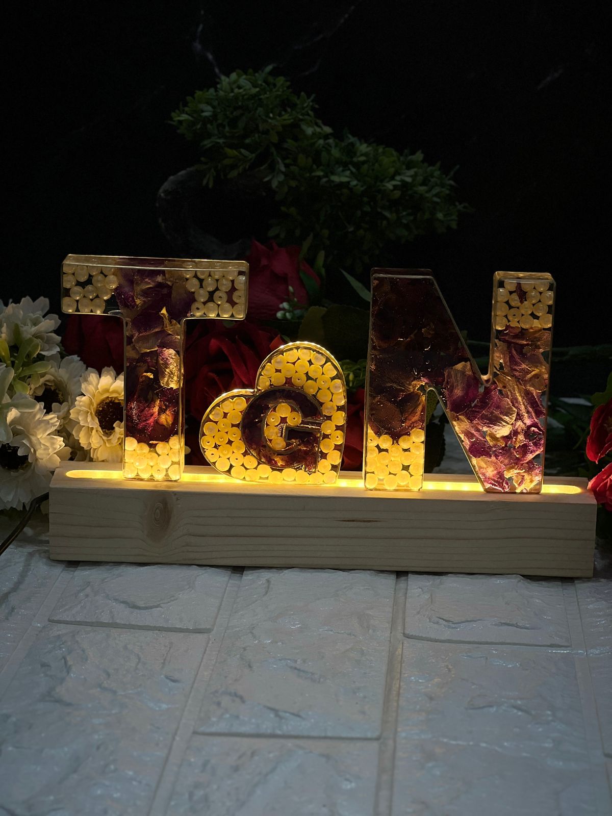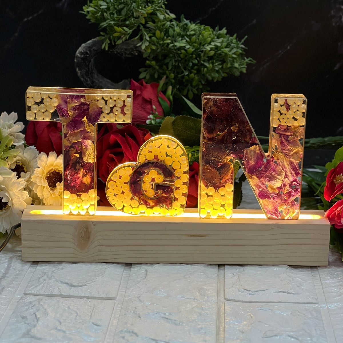 Product Description: This elegant Personalized Deep Casting Name Initials Frame is a beautiful way to preserve and display special memories. Featuring a heart-shaped design in the center, this frame holds wedding garland flowers and delicate white pearls, all encased in a deep casting. It stands proudly on a wooden LED stand that adds a glowing touch to your home décor. At just 4 inches, it’s a compact yet striking keepsake perfect for marking a memorable occasion like a wedding. Features: