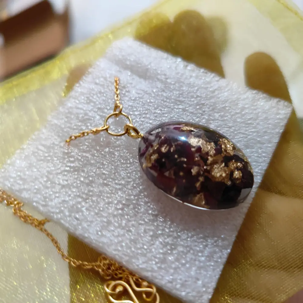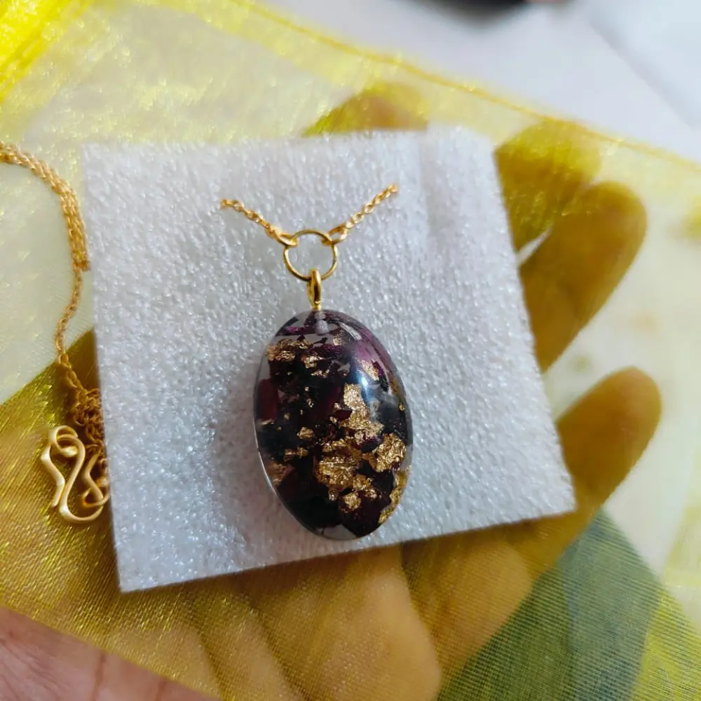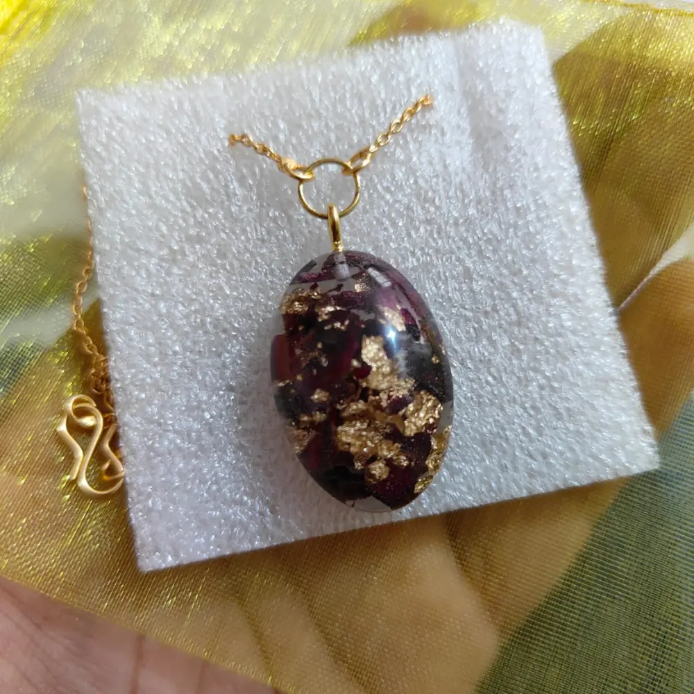 Product Description: This Epoxy Floral Golden & Red Pendant is a stunning accessory designed to add elegance and color to any outfit. The oval-shaped pendant features intricate floral patterns and a vibrant mix of golden and red tones, making it perfect for parties, weddings, or even a thoughtful birthday gift. The high-quality epoxy resin ensures a smooth, glossy finish, highlighting the detailed design. It’s a timeless piece that complements any special occasion attire. Product Features: