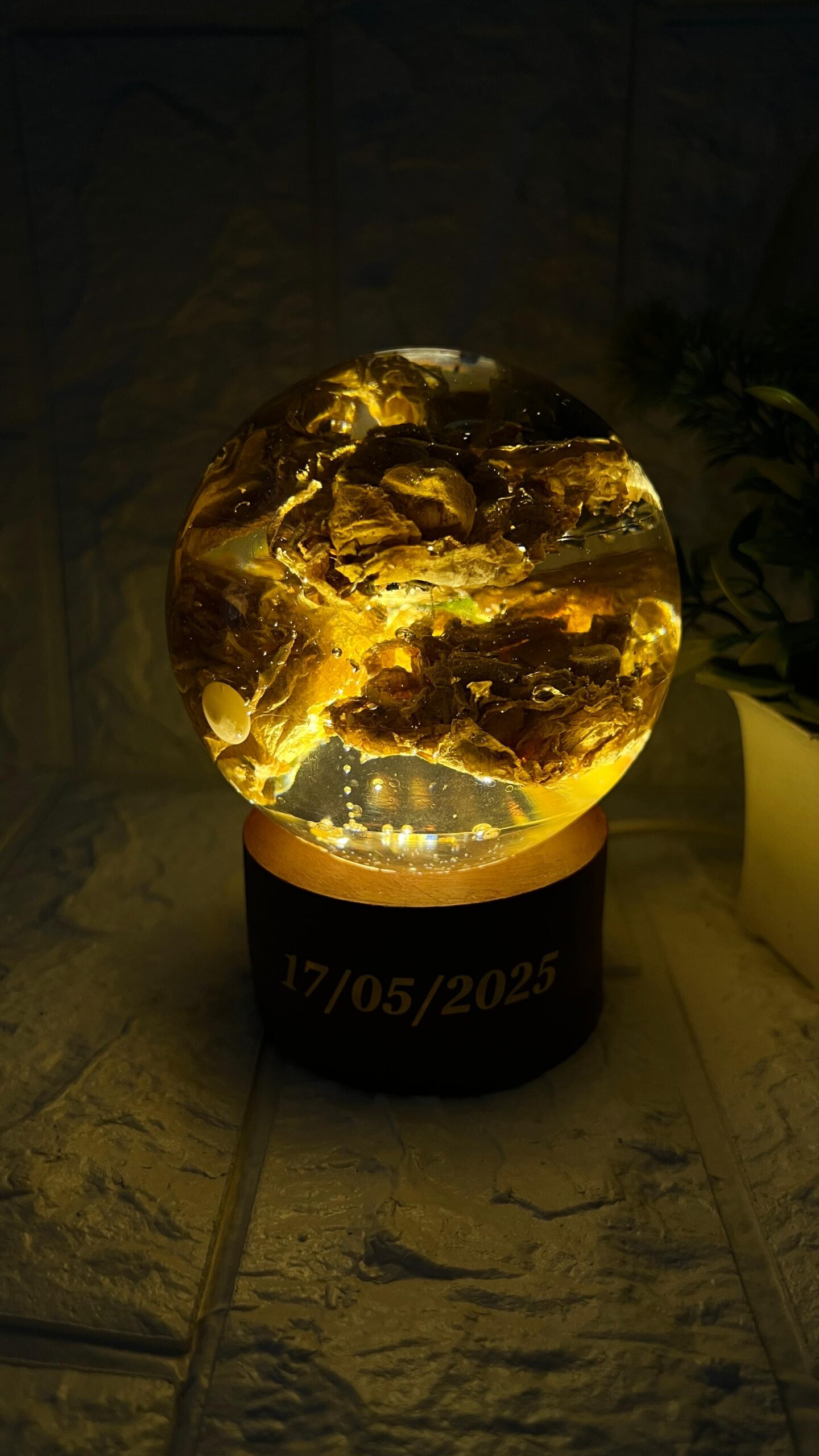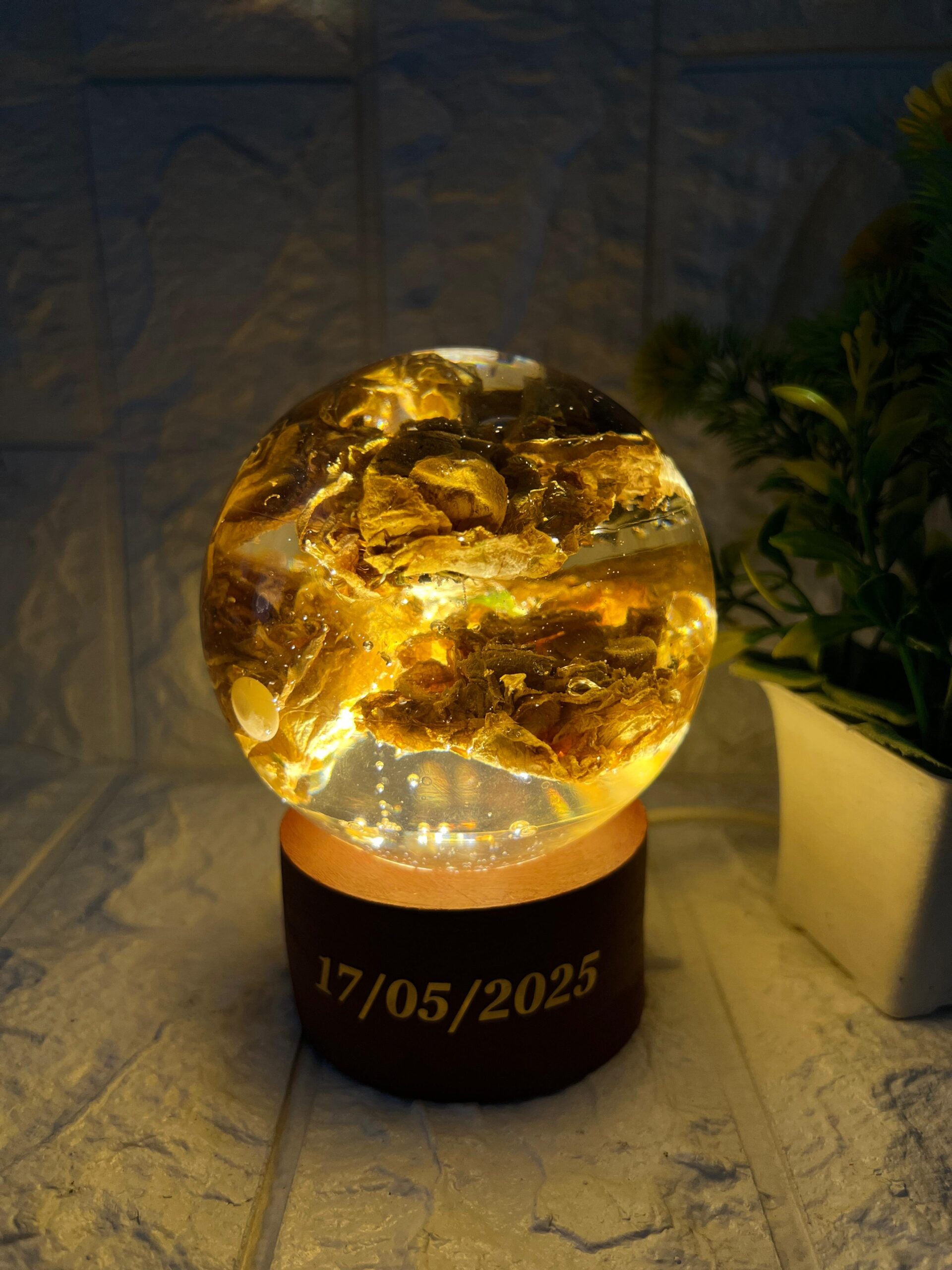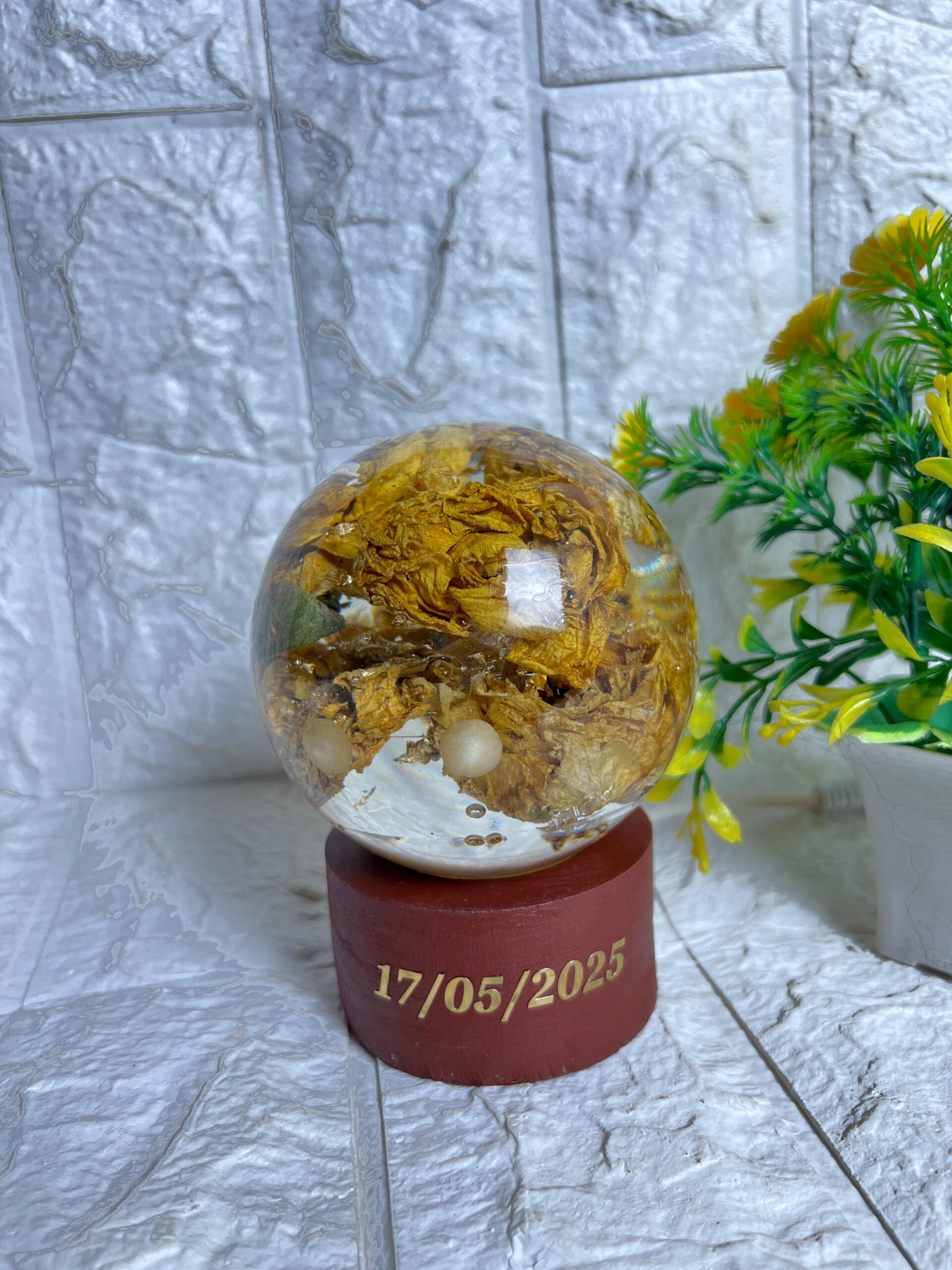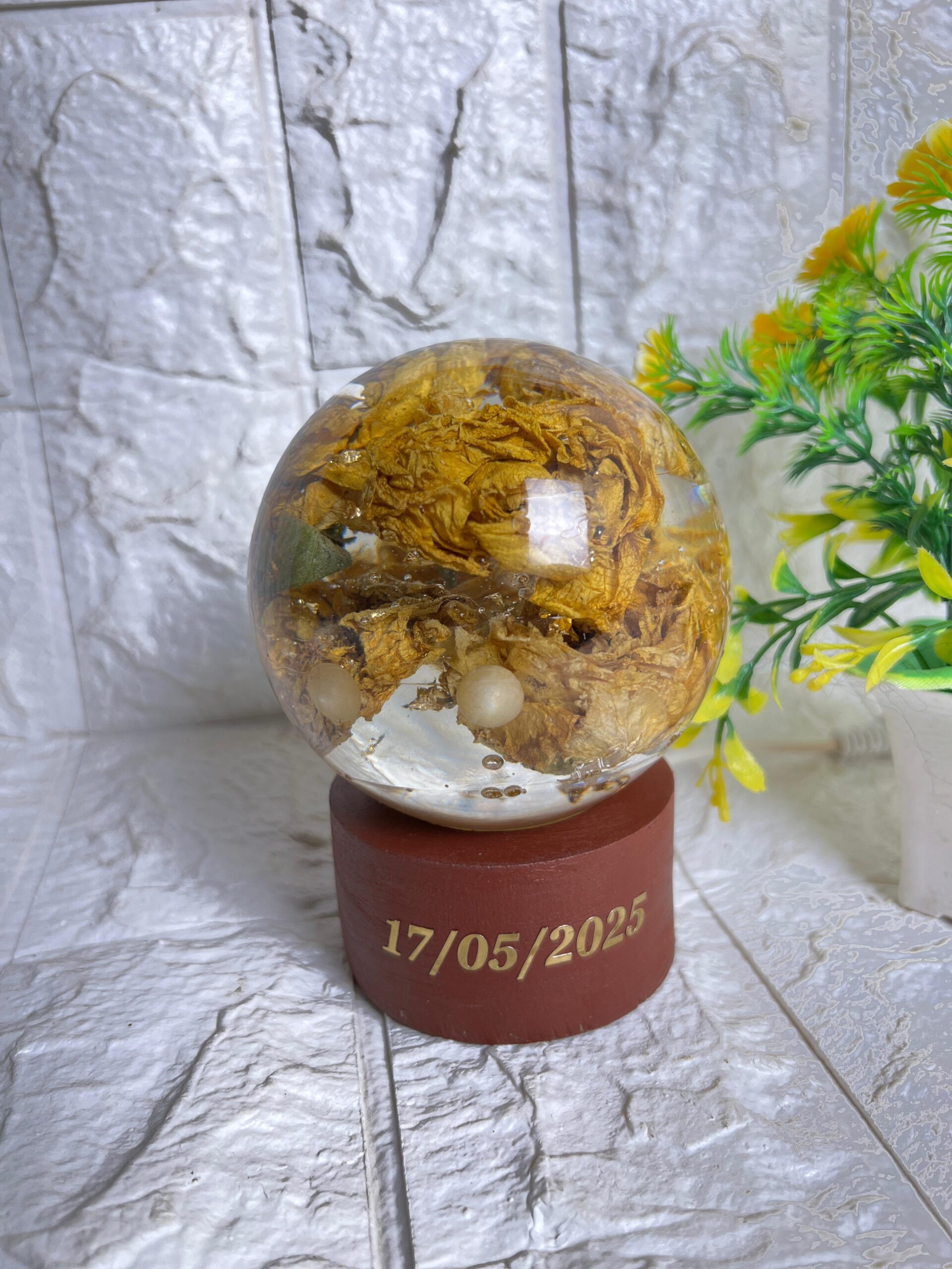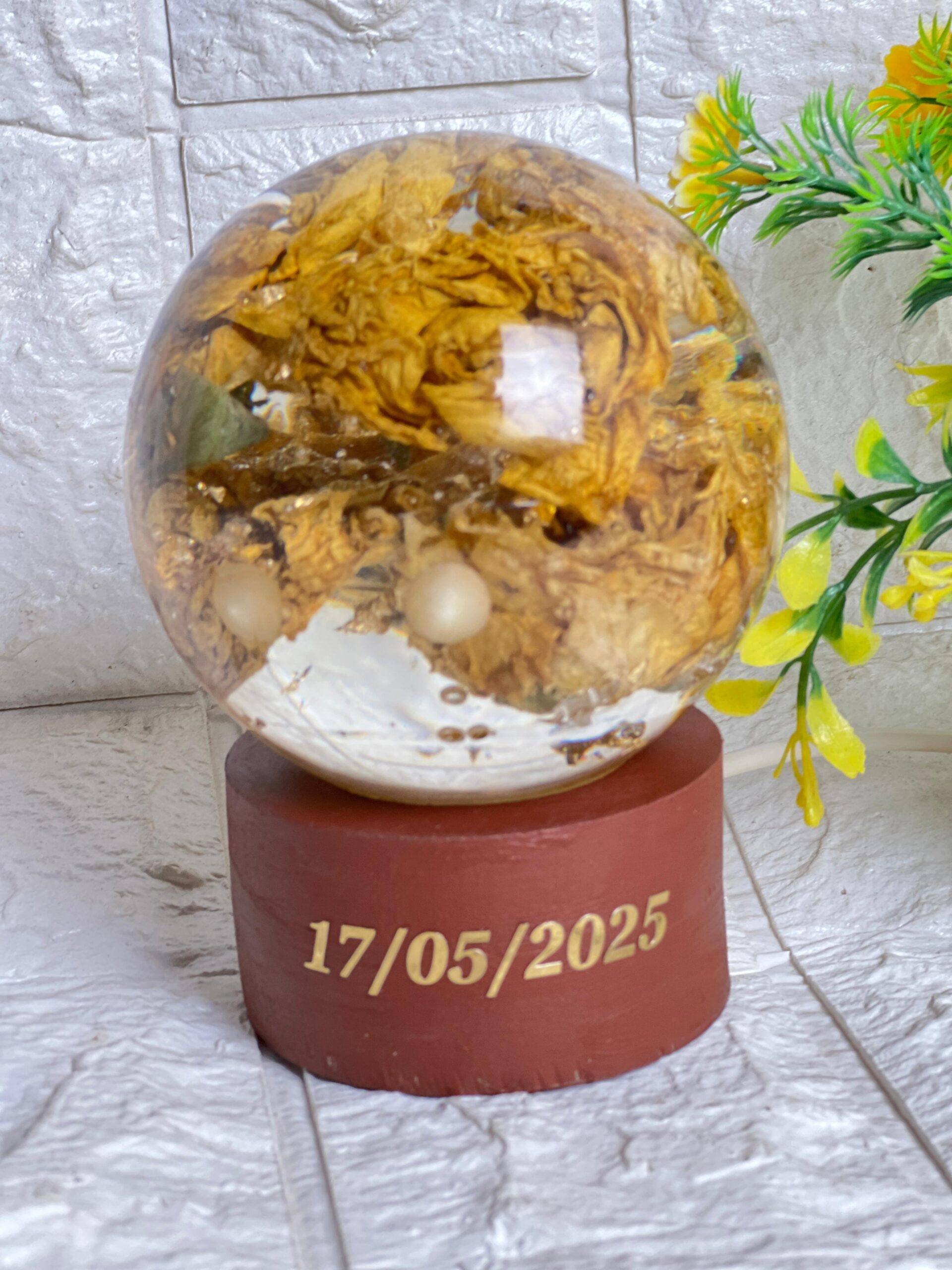This glowing resin globe is a beautiful way to remember a special date forever. Inside the clear round ball, real wedding flowers are carefully sealed. The light inside shines warmly, making the flowers glow and creating a magical look.