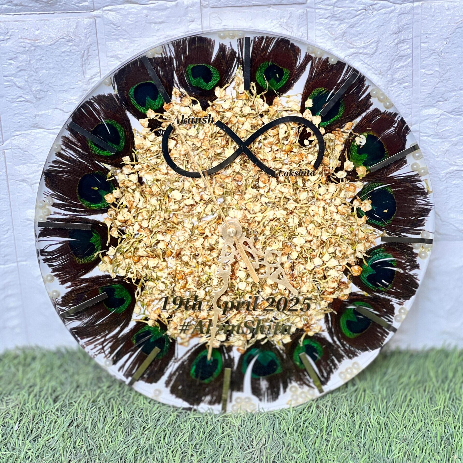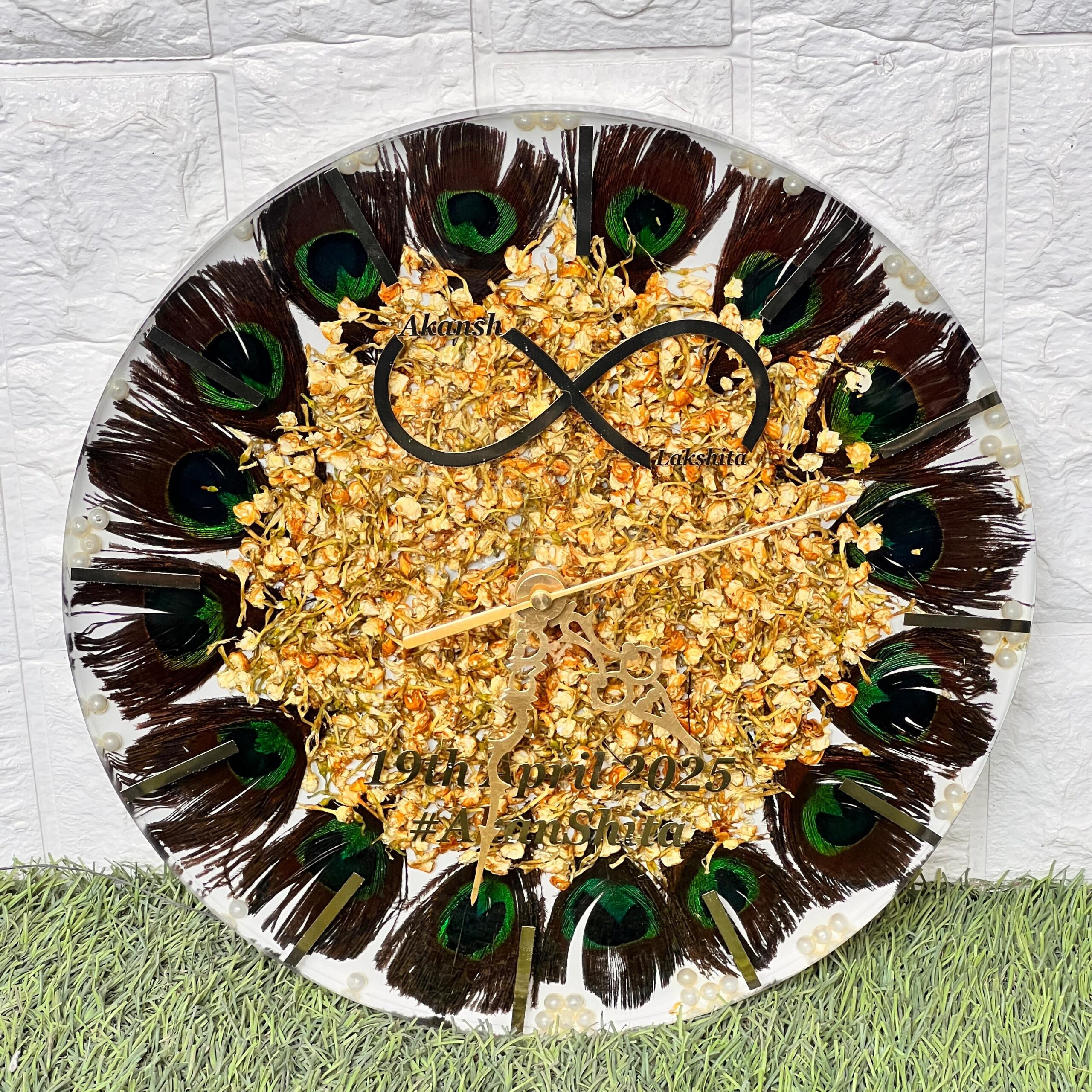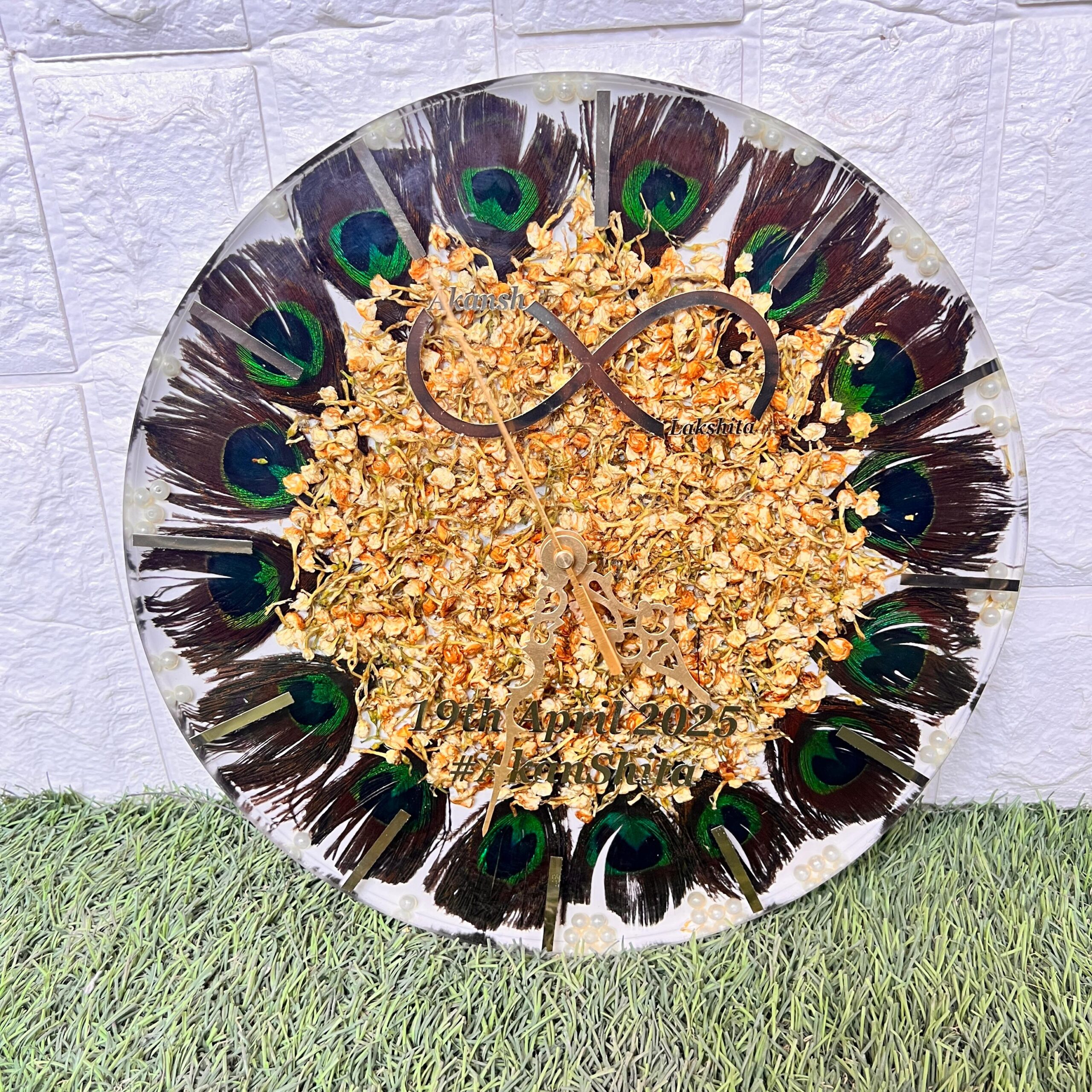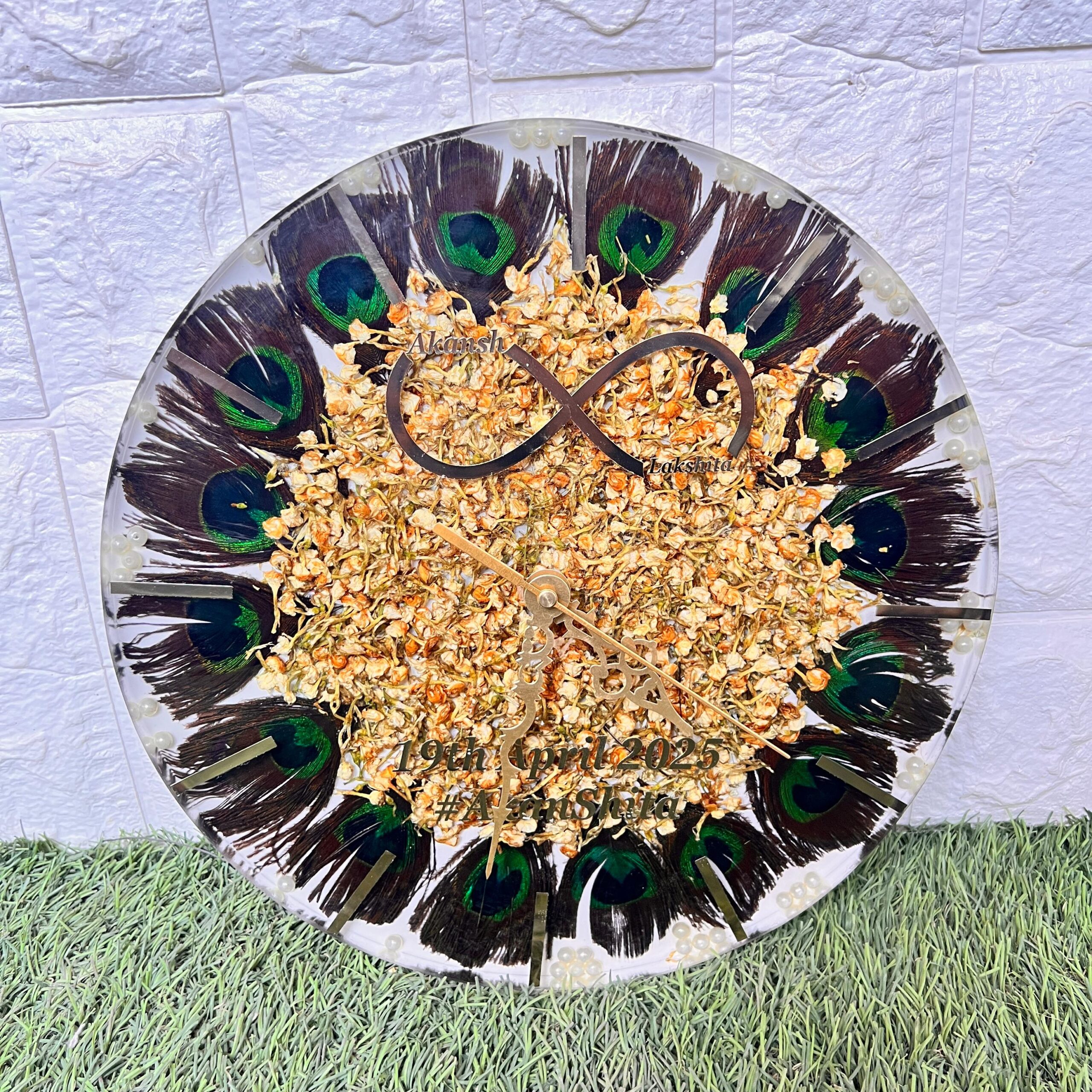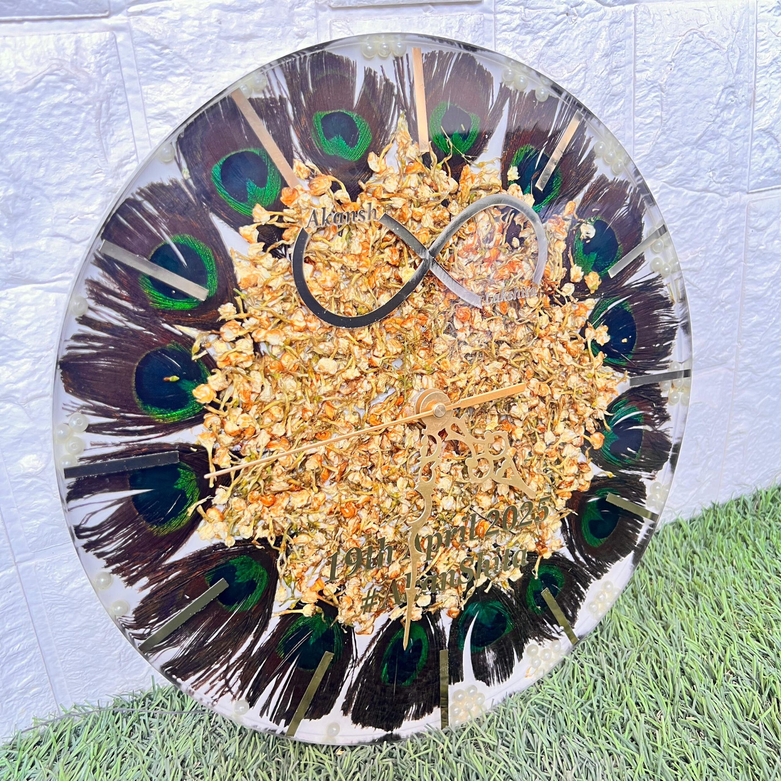 This beautiful round resin wall clock is more than just a timepiece. It is a personalised memory made using real peacock feathers and sparkling gold flakes. The centre of the clock shines with golden beauty, and the border features stunning feather designs.