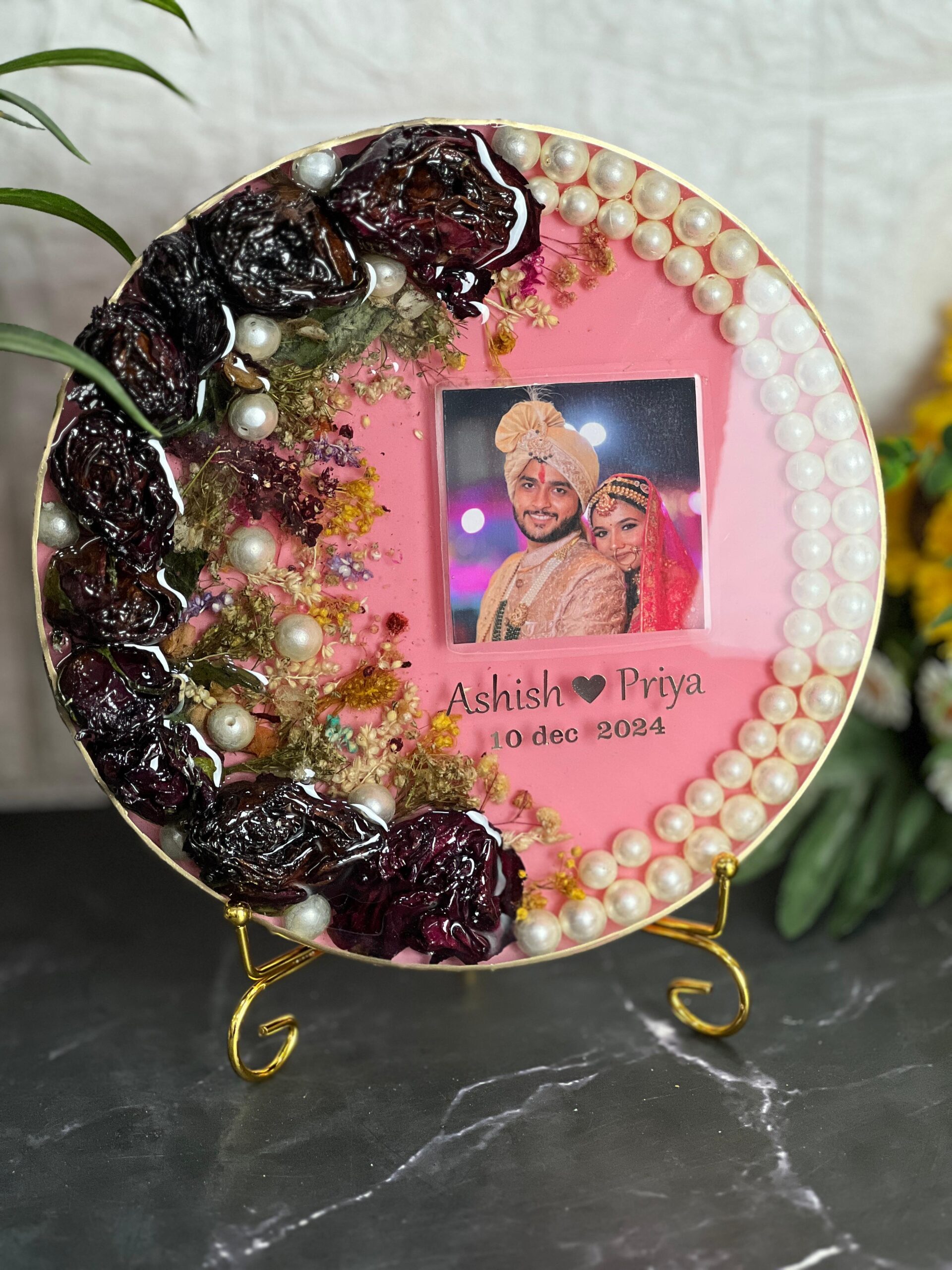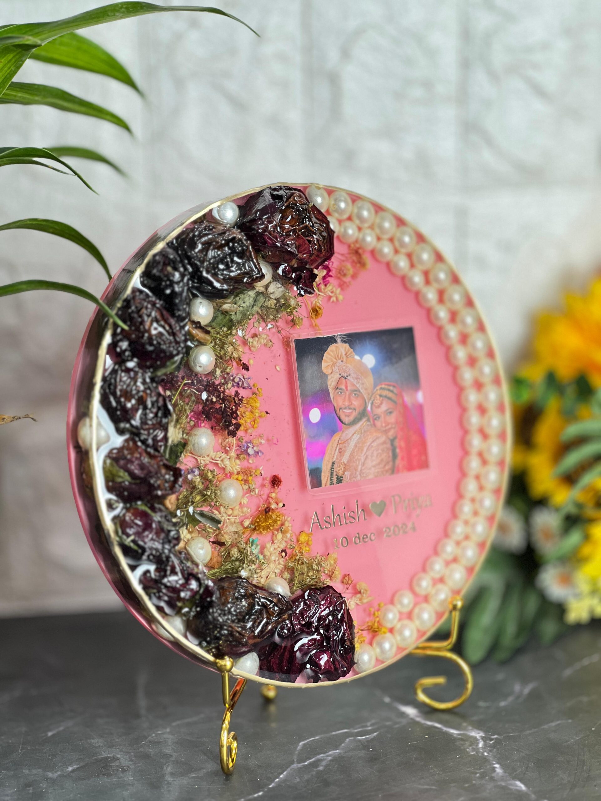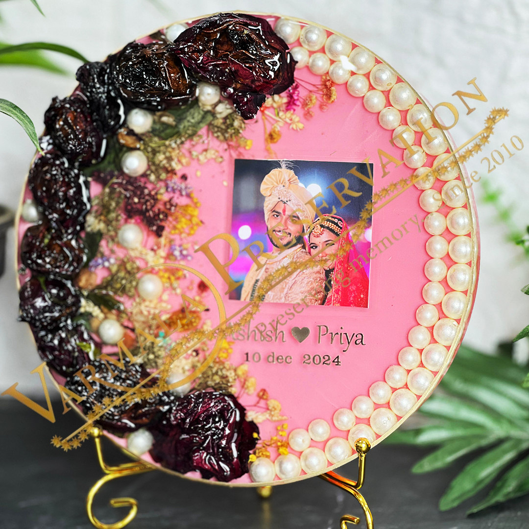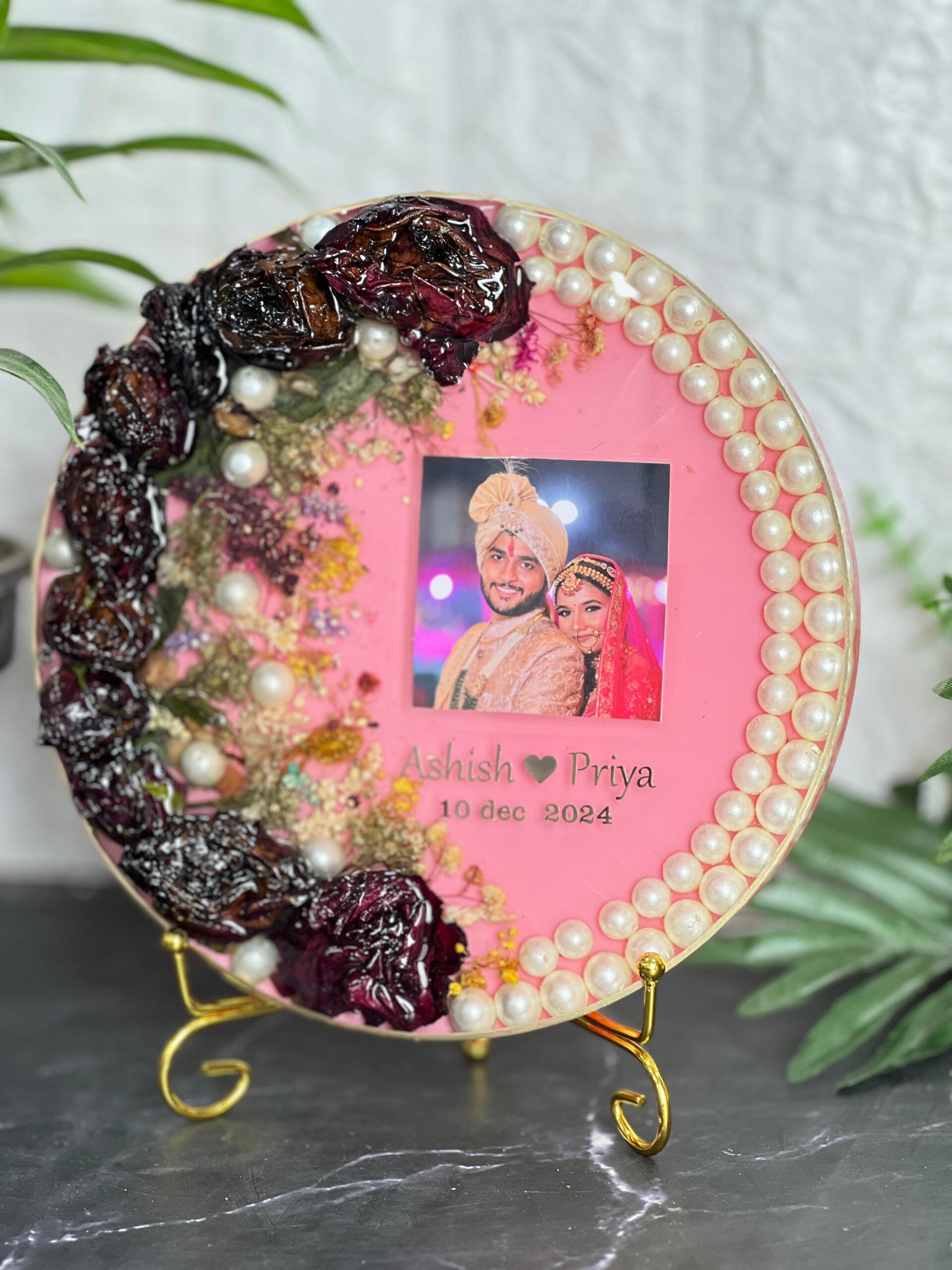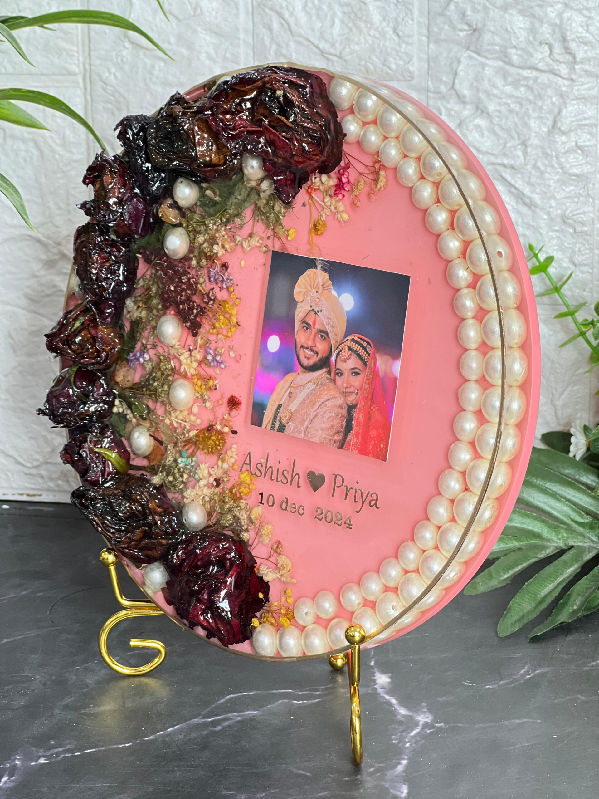 This round 10-inch resin frame is a one-of-a-kind gift for newlyweds or couples celebrating their love. It includes your real varmala flowers, sealed beautifully in resin, along with pretty pearls and delicate floral touch. Your wedding photo is placed in the centre, with your names and wedding date printed below it.