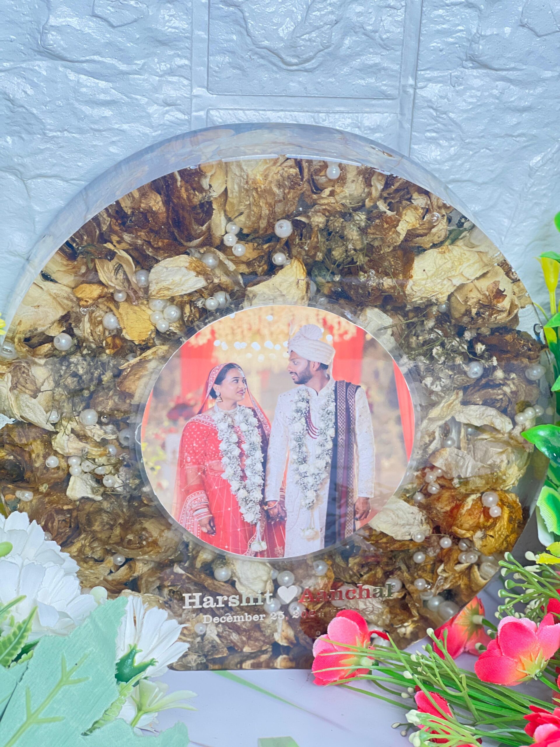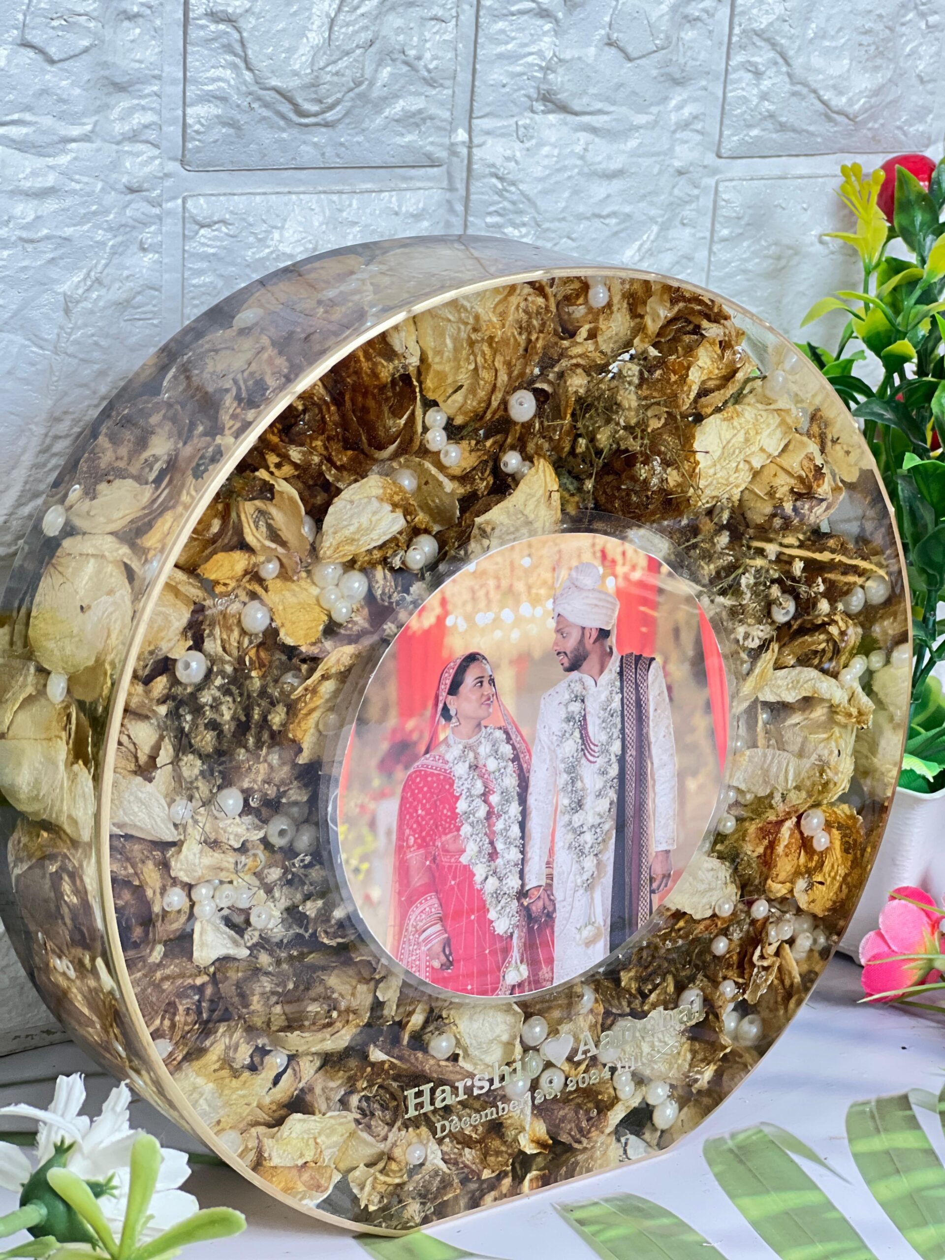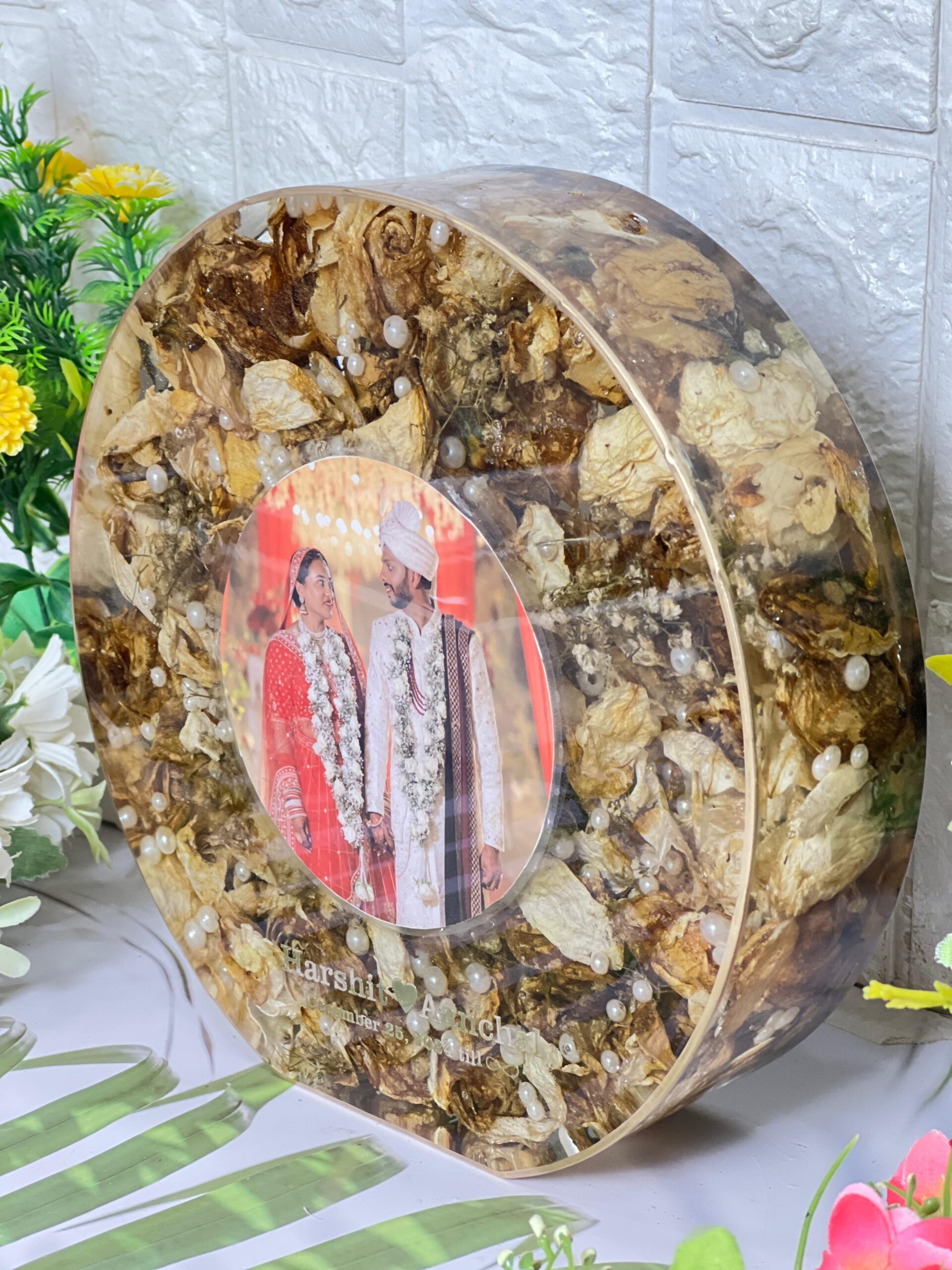 This round resin photo frame is a beautiful memory keeper. Your favorite wedding photo is placed right at the center, surrounded by natural dried flowers and pearls that stay fresh inside resin. The circle shape adds a soft, complete feel that looks peaceful and elegant.