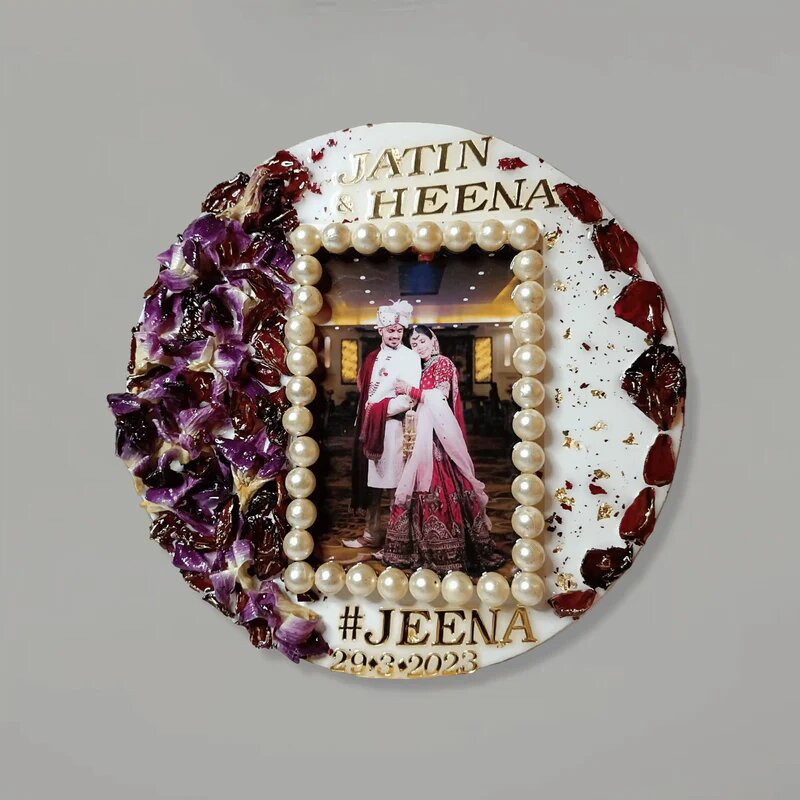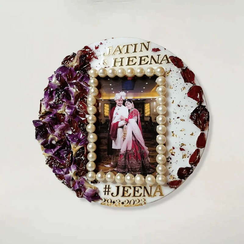 Keep your wedding memories alive forever with our Resin Jaimala Preservation Frame with Pearls. This frame carefully preserves your real wedding garland inside premium resin, keeping its color and shape for years.