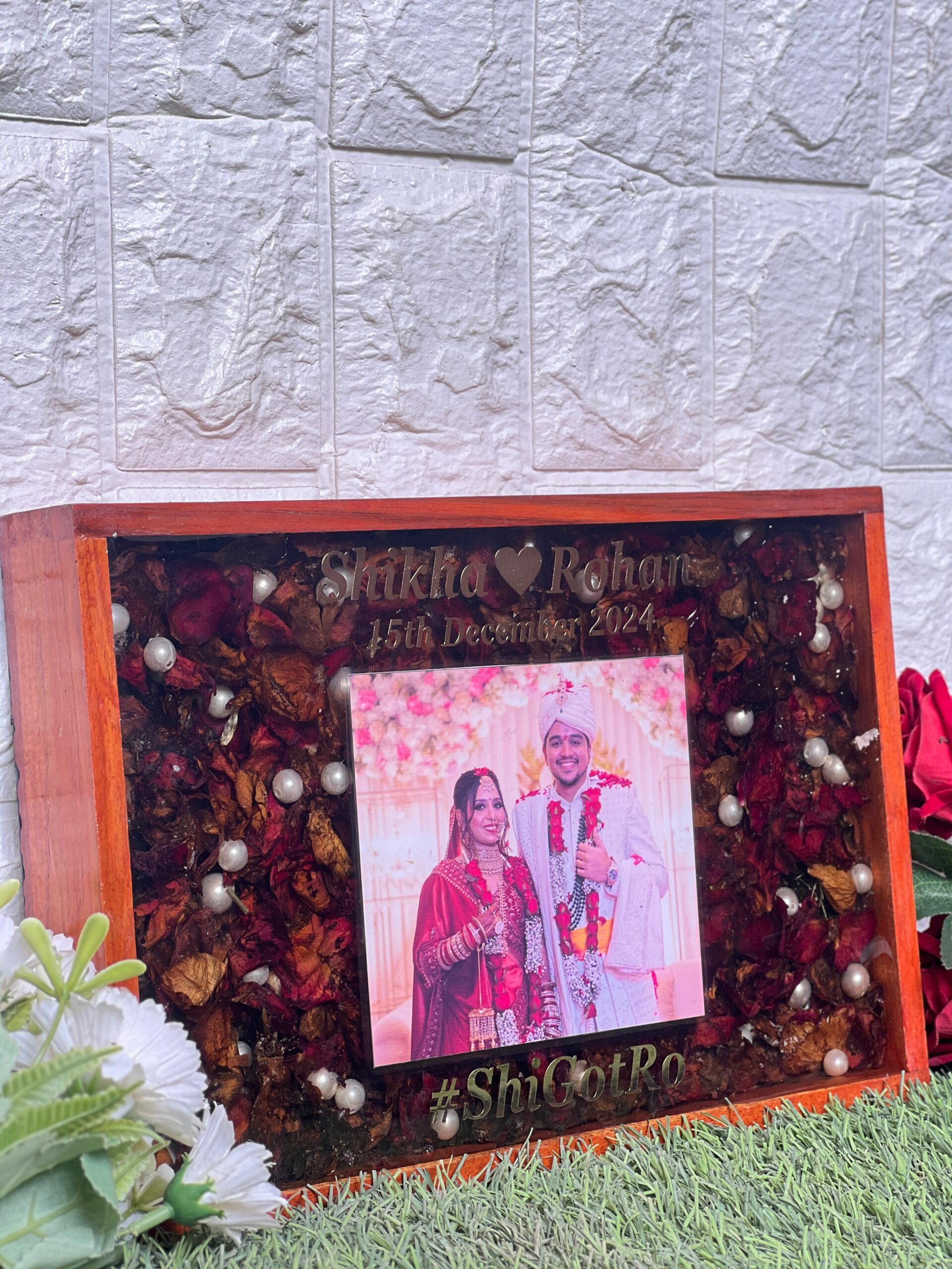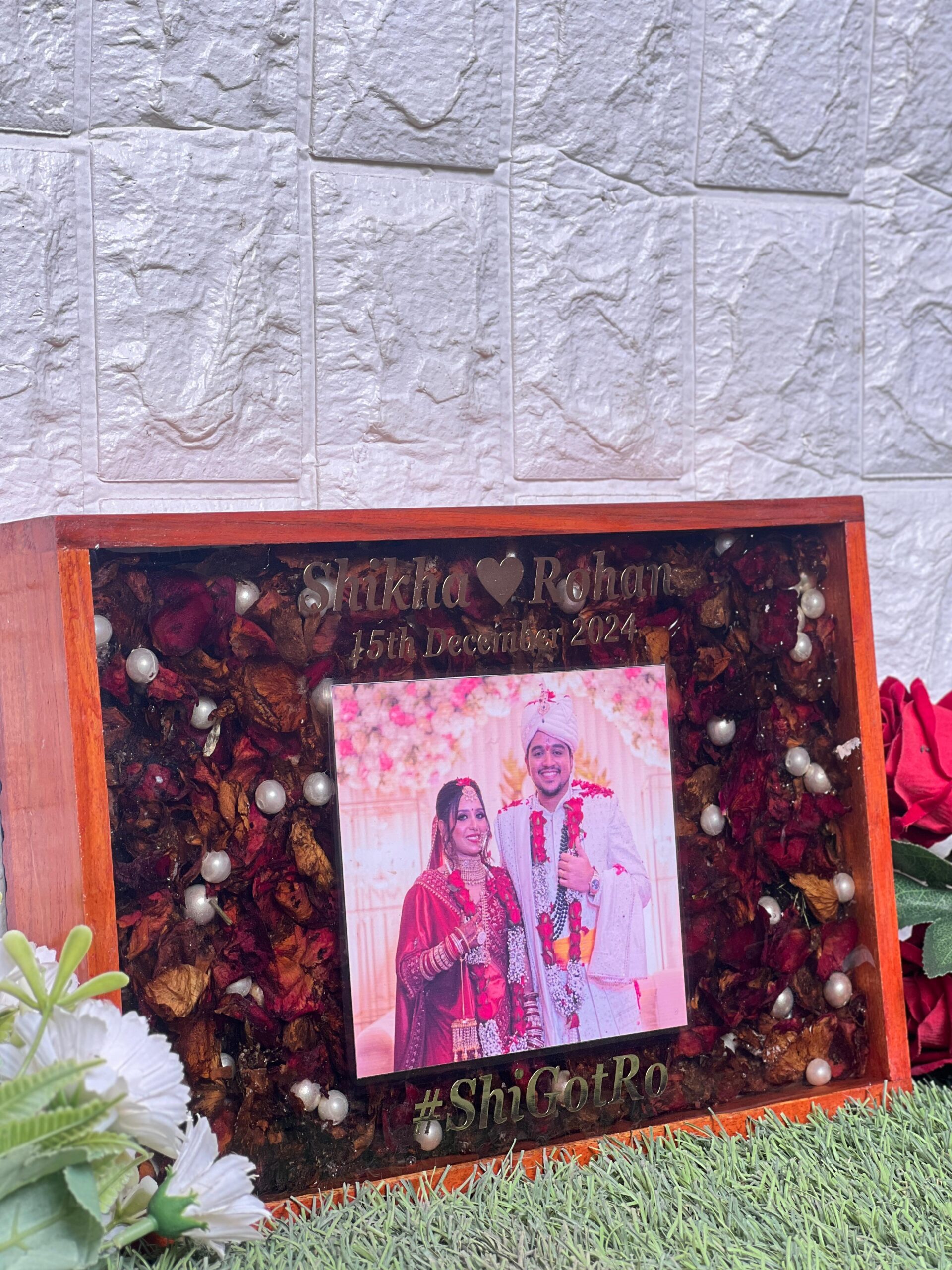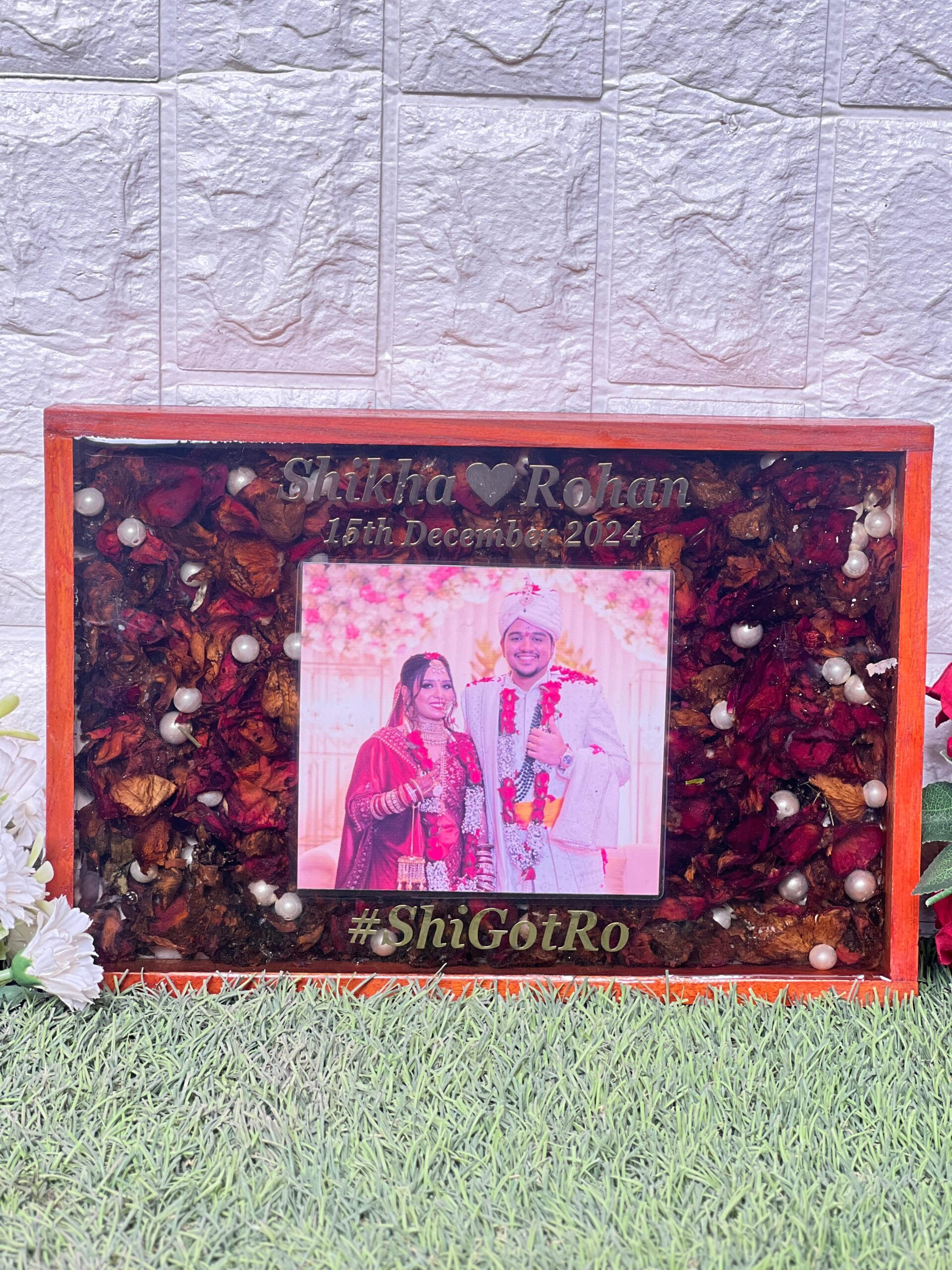 Make your wedding memories last forever with this beautiful custom wedding keepsake resin frame. This handmade frame features real dried wedding petals, shining pearls, and your favorite couple photo. Personalized with your names, wedding date, and a unique hashtag, this frame is a one-of-a-kind gift and memory box. The clear resin adds a shiny, glass-like finish that keeps everything safe and beautiful for years.