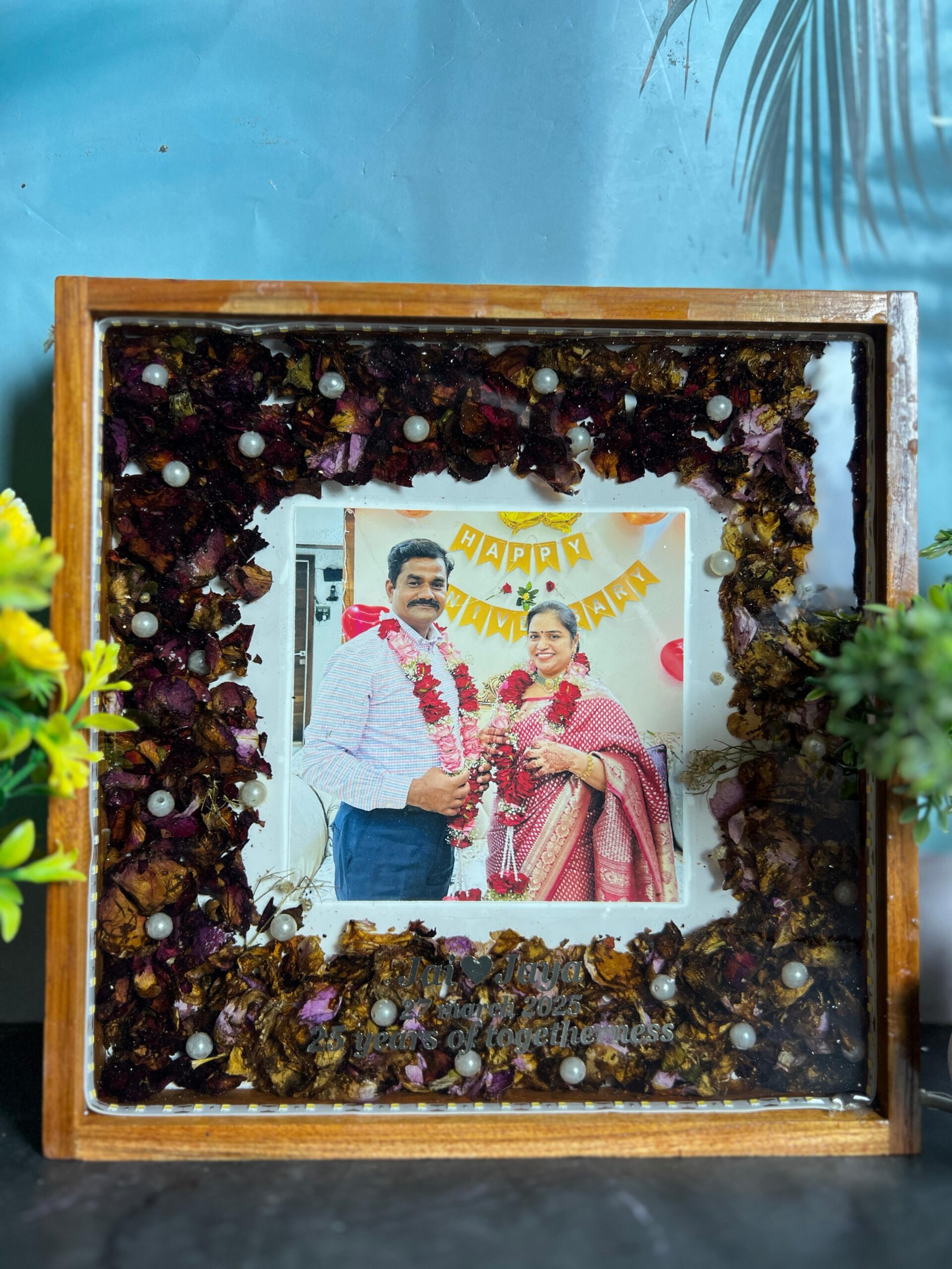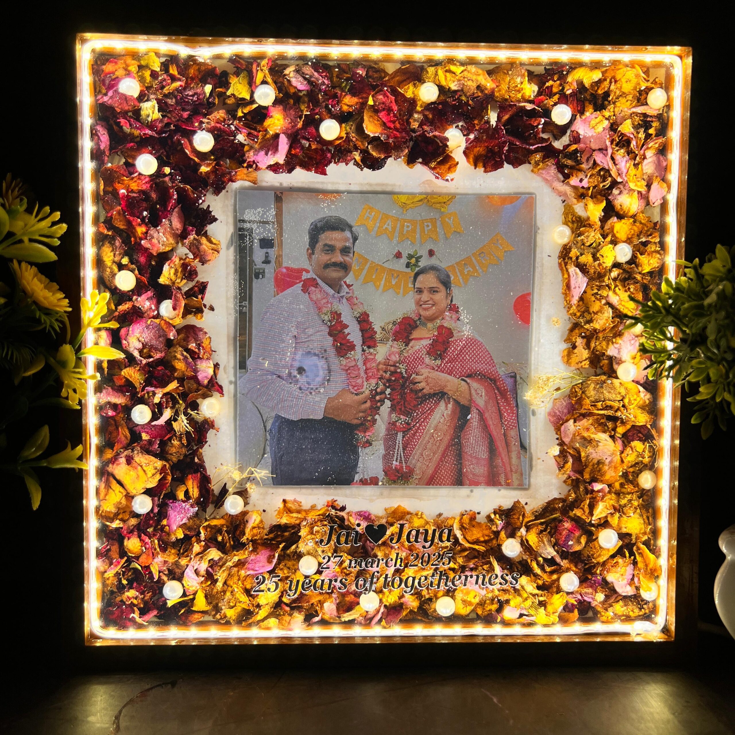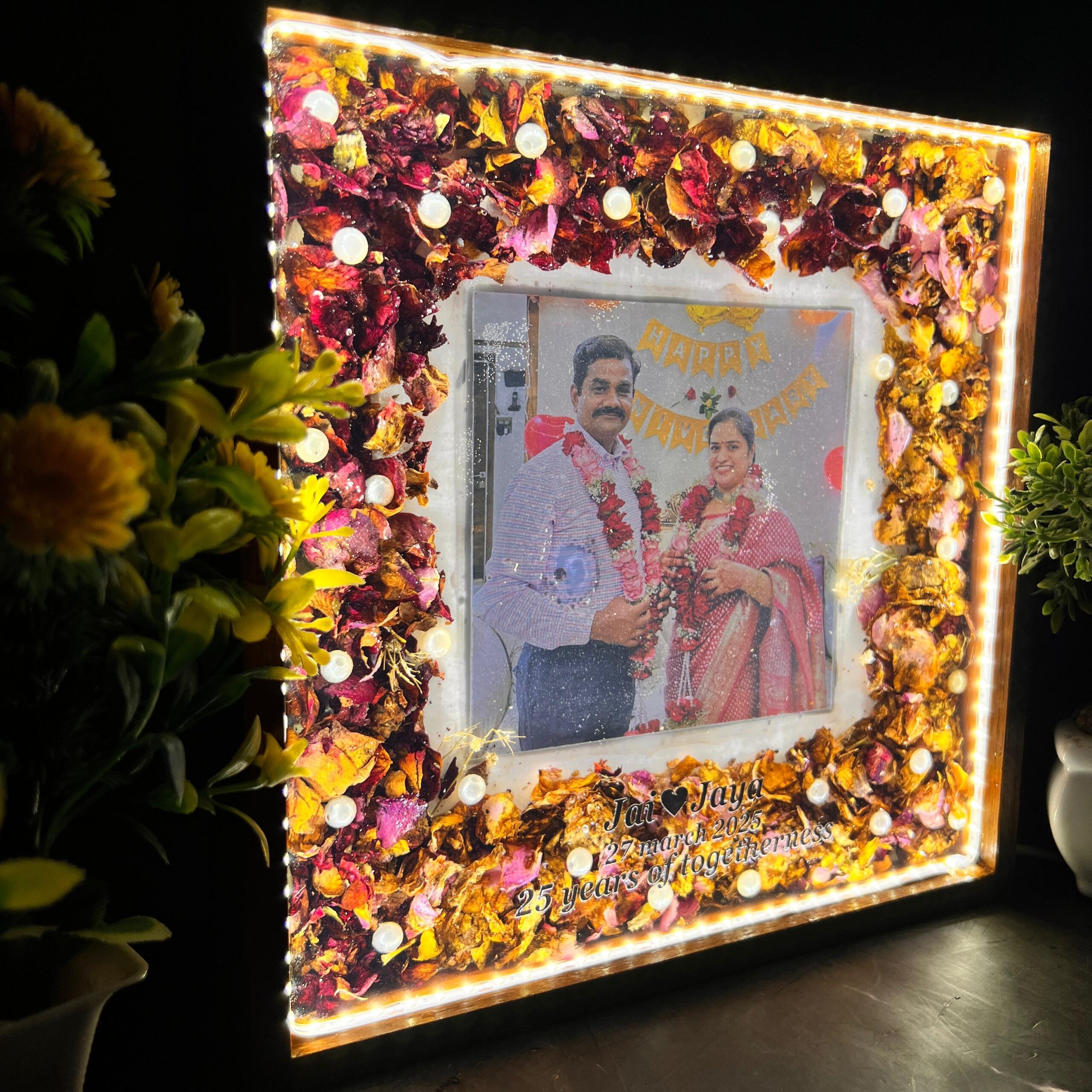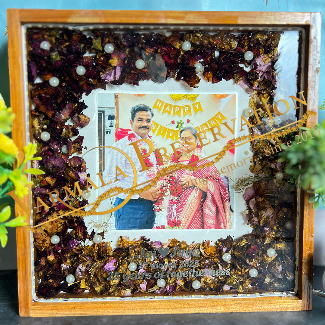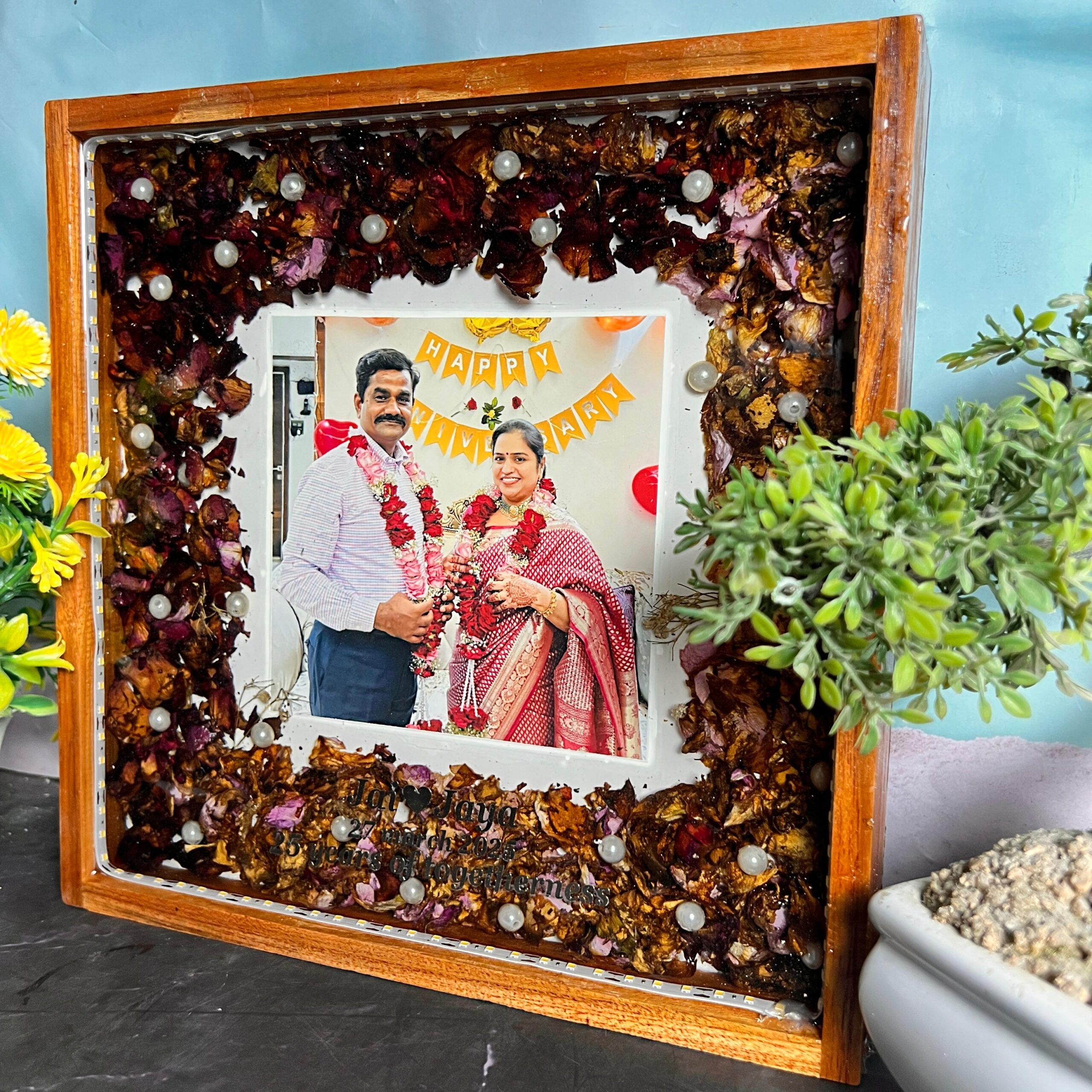 This Wedding Varmala Memory Preserved Resin Frame with a wooden border is made to preserve your wedding day forever. The square frame features your wedding photo, surrounded by your actual varmala, dry rose petals, yellow flowers, pearls, and gold beads. Two shiny round lights on the top corners add a royal touch to the frame.