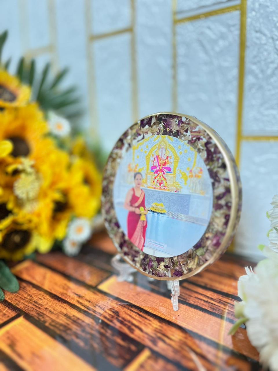 Dry petals are placed around the border to give the picture a warm and rich look.