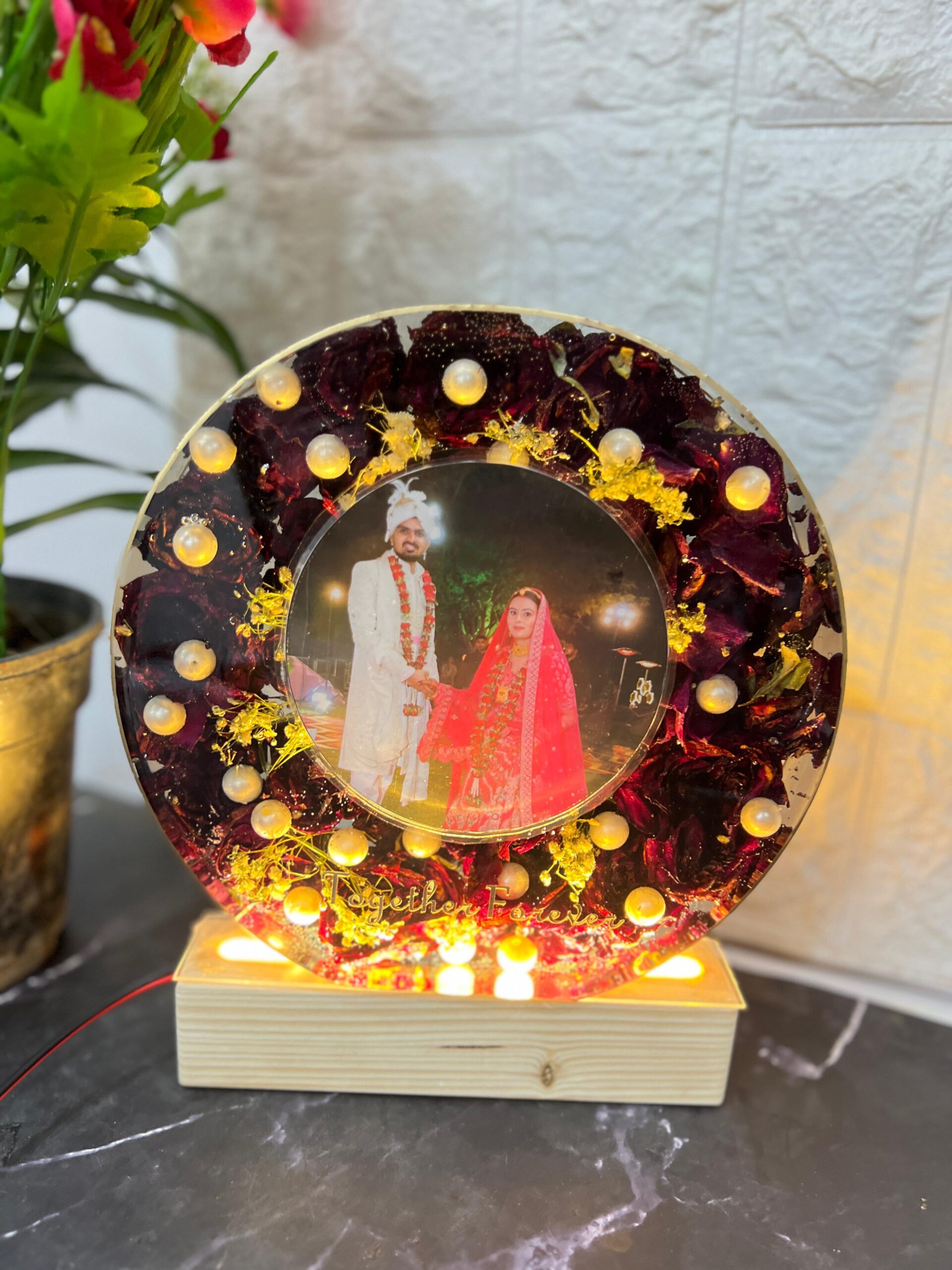 This round-shaped deep casting resin frame beautifully preserves your wedding garland flowers (varmala) and white pearls in high-quality epoxy resin. The clear resin allows the delicate flowers and pearls to shine, creating a stunning display that captures your cherished wedding memories. The frame is mounted on a wooden LED stand, which adds an elegant touch and enhances the overall aesthetic. With our home pickup and drop-off facility, you can preserve your wedding or special memories anywhere in India with online varmala preservation. Choose the shape and size that suits you best.