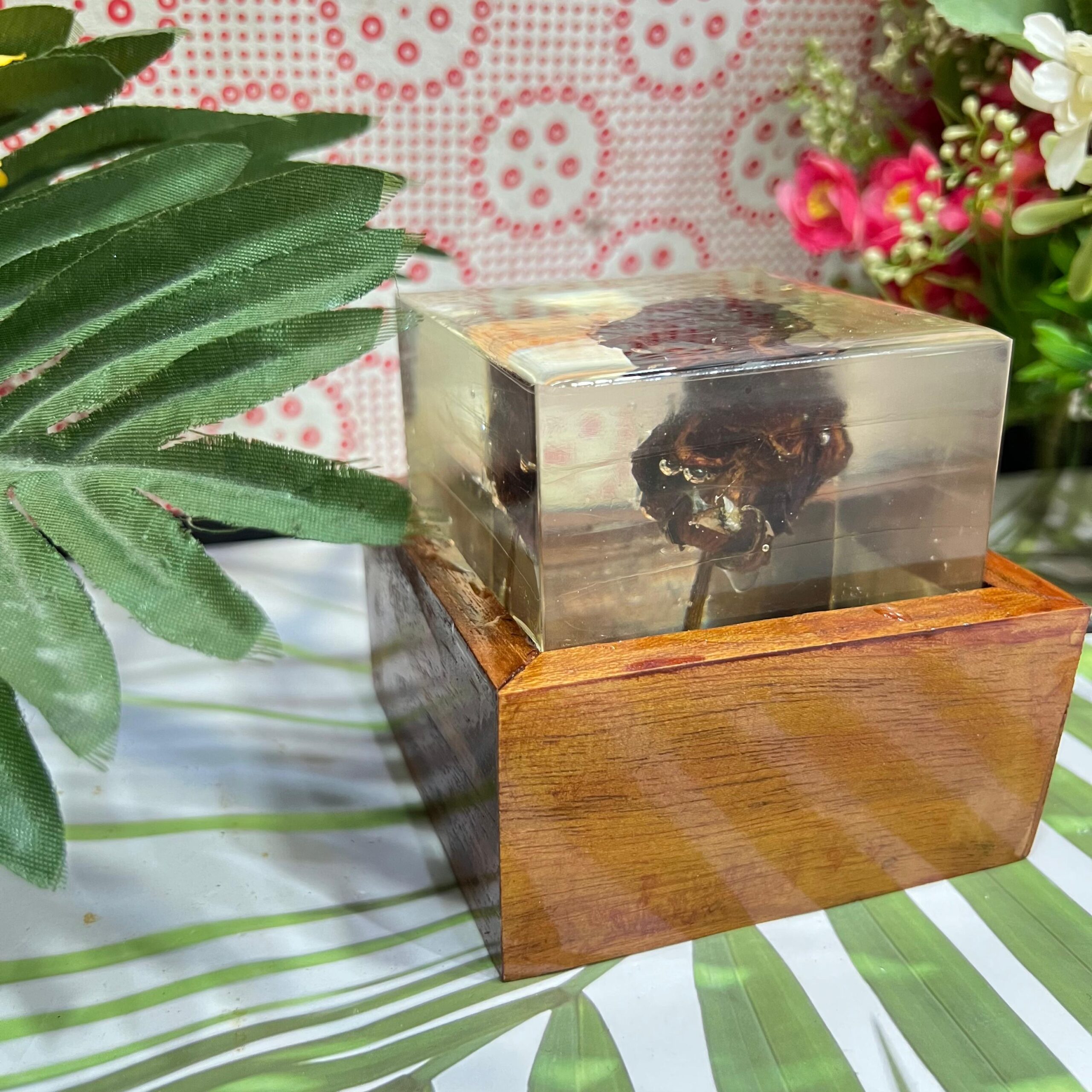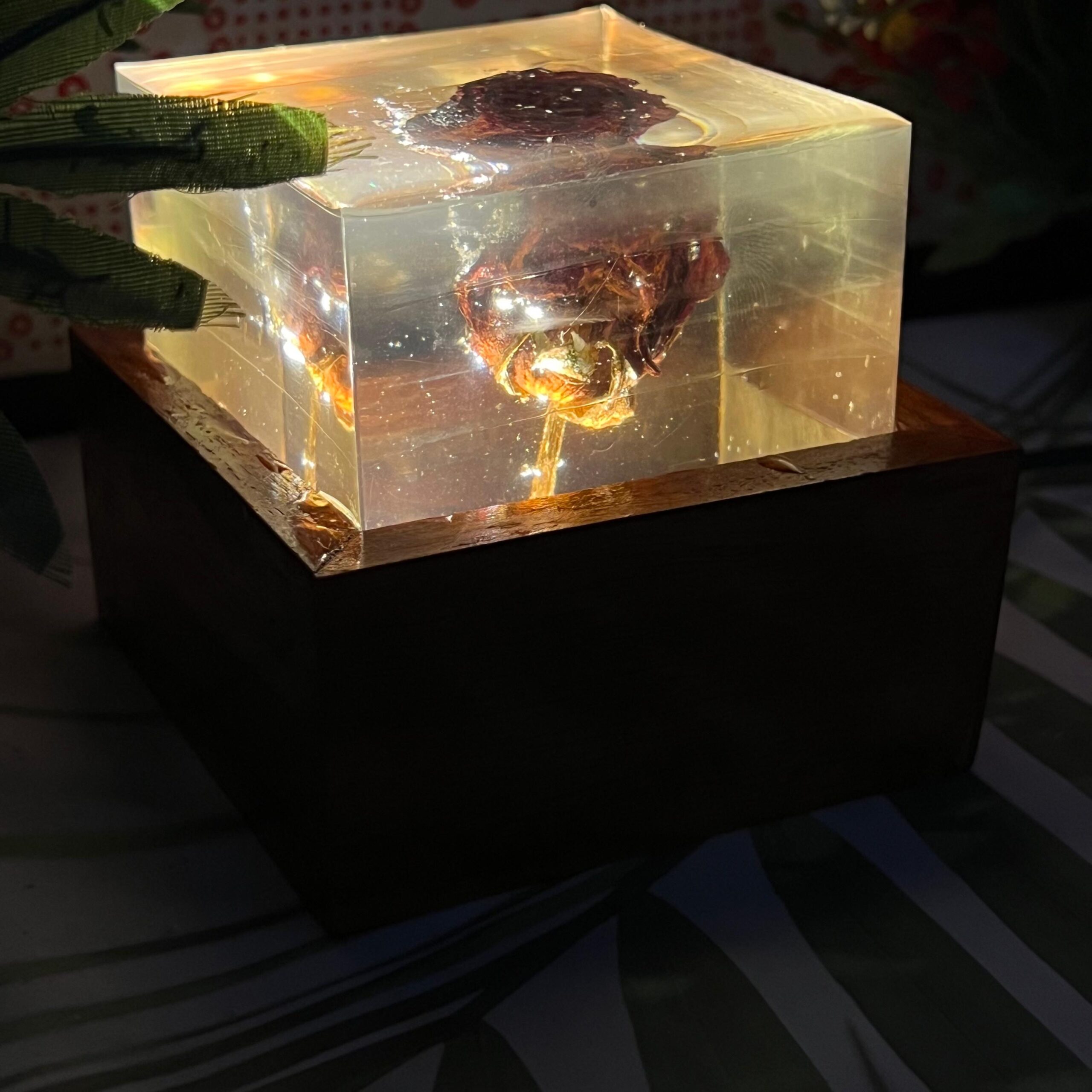 • Shape: Square resin block with natural preserved rose