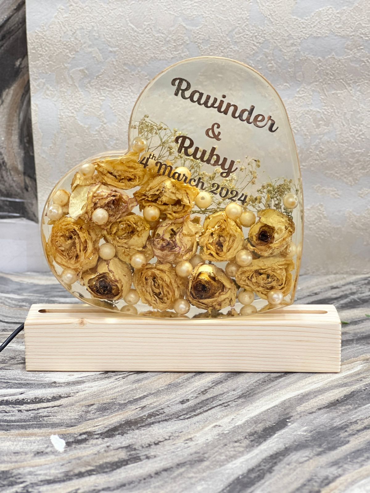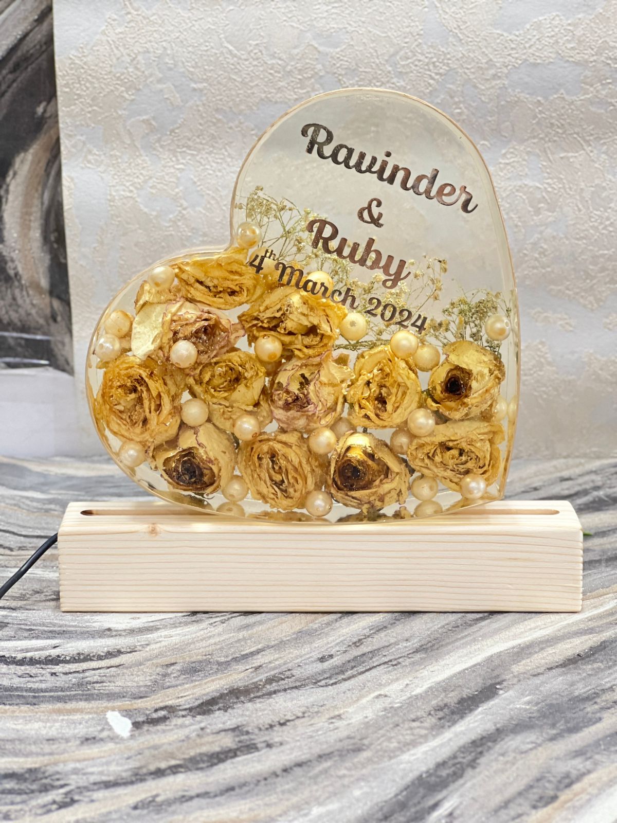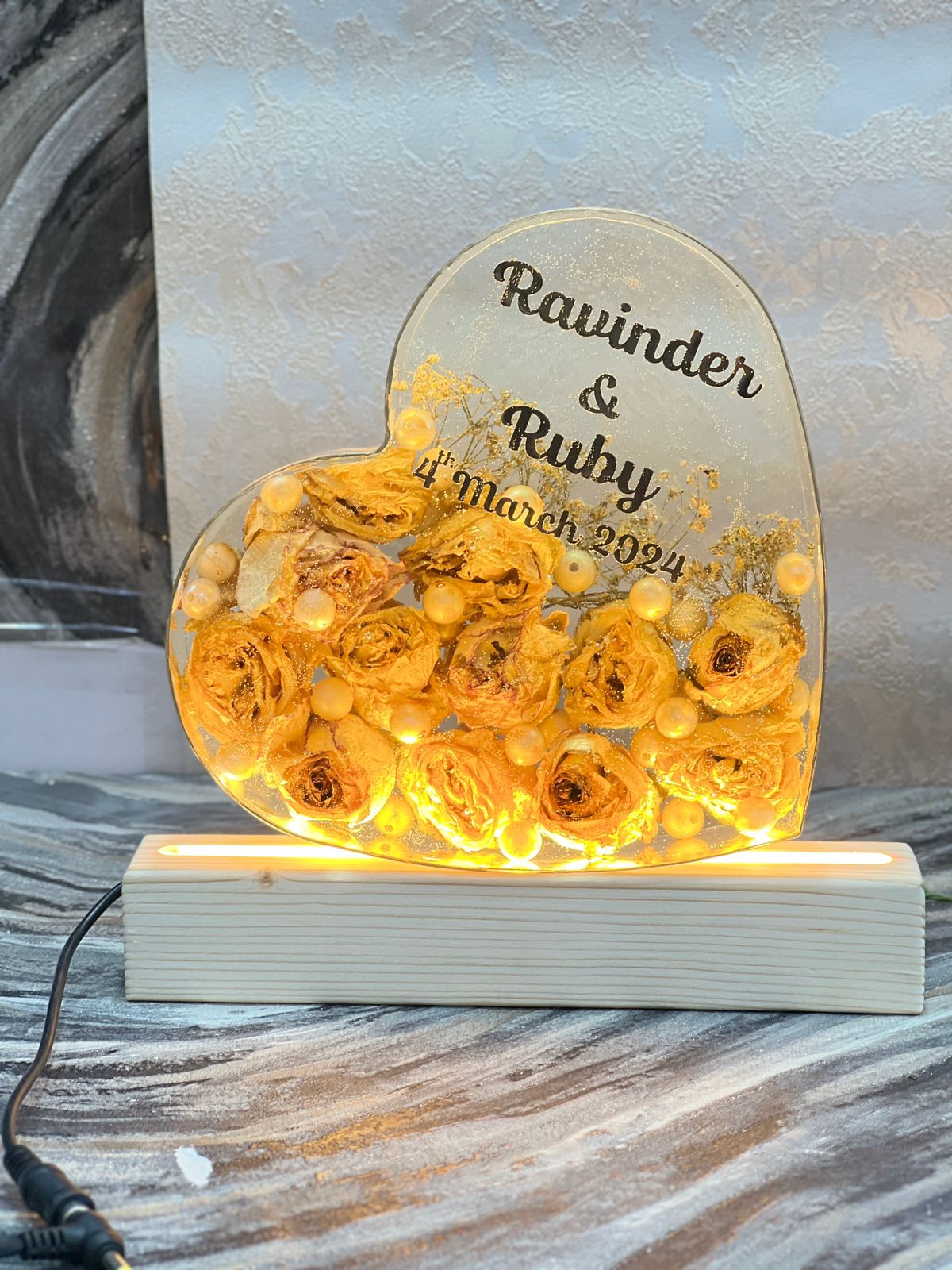 Celebrate your love with our Precious Epoxy Wedding Varmala Keepsake, a heartfelt 8-inch heart-shaped varmala preservation piece. Adorned with yellow flowers and pearls, this design captures the essence of romance and commitment. Personalized with your names and special date, and enhanced by an LED stand, this keepsake radiates warmth and elegance. Perfect for displaying in your home or giving as a meaningful gift, it preserves the beauty and sentimentality of your wedding day. Key Features: